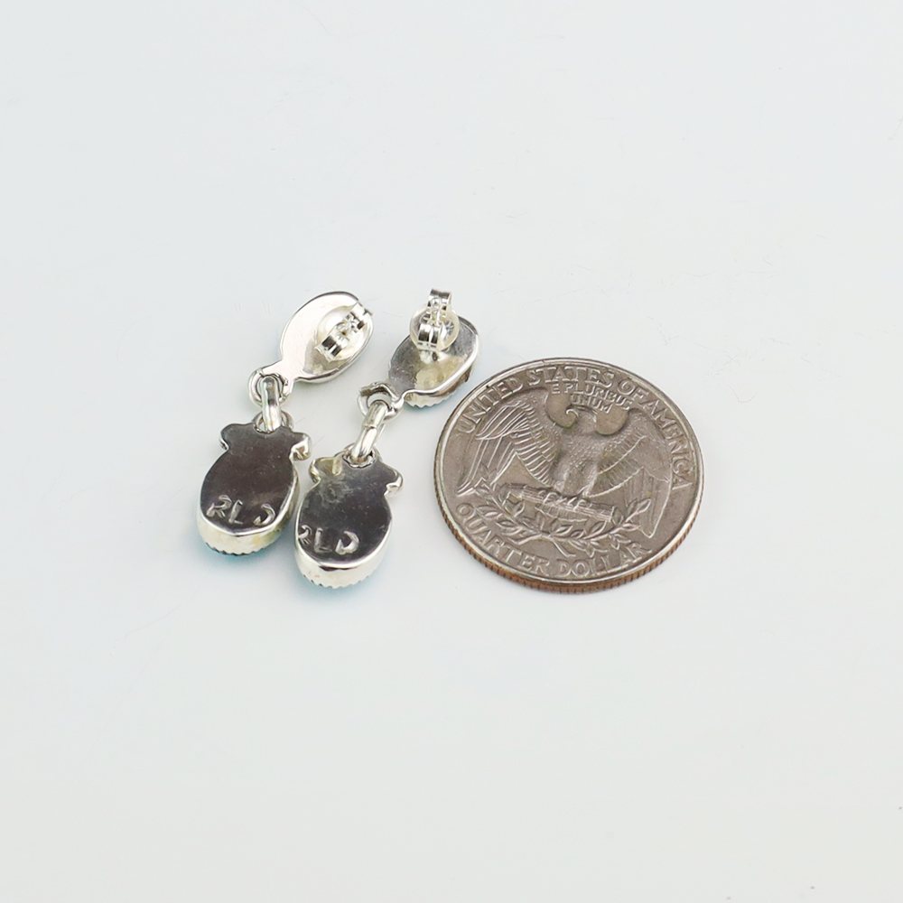 Zuni artist, Diane Lonjose made these beautiful earrings. Made out of sterling silver and set with natural Kingman Turquoise. The components are all hand fabricated, and the stones are all natural. Diane comes from a family of Zuni jewelers. She is the daughter of Alice and Duane Quam, and grandchild of Doris and Warren Ondelacy. Weighs 4 grams. Signed