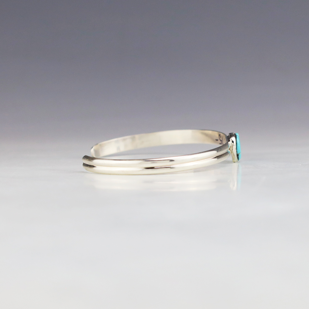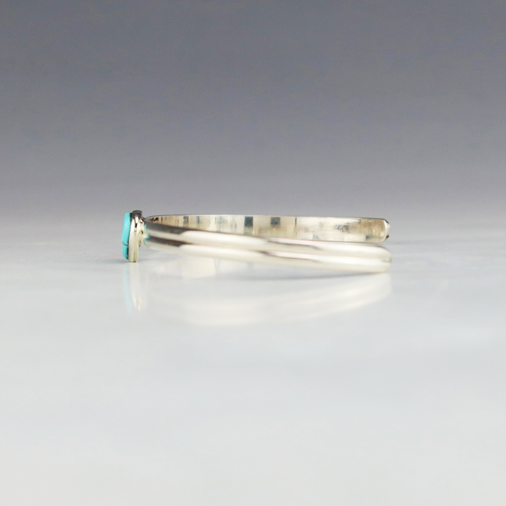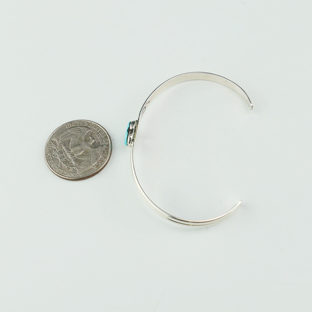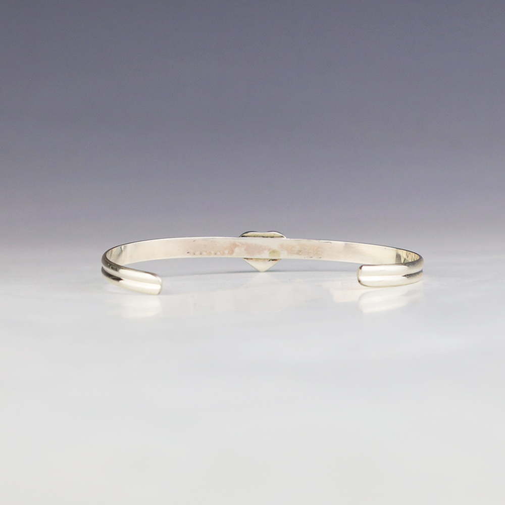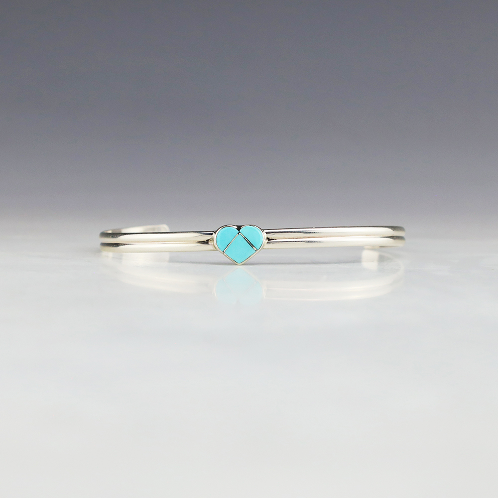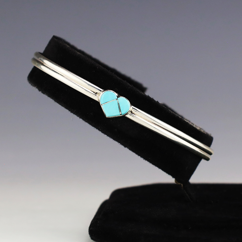 Zuni artist Linda Chavez made this lovely heart bracelet. Zuni artists are known for their fine lapidary skills. Each stone is hand cut, polished, and set into a sterling silver setting. This lovely bracelet is sterling silver and inlaid with Turquoise. Weighs 6 grams.