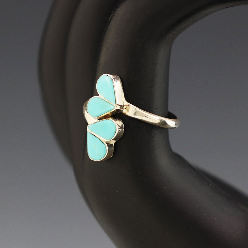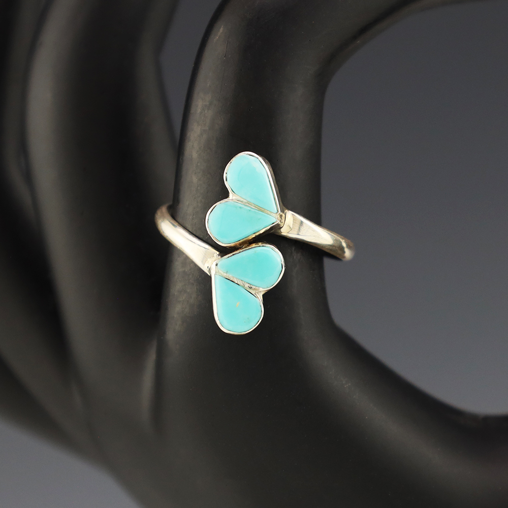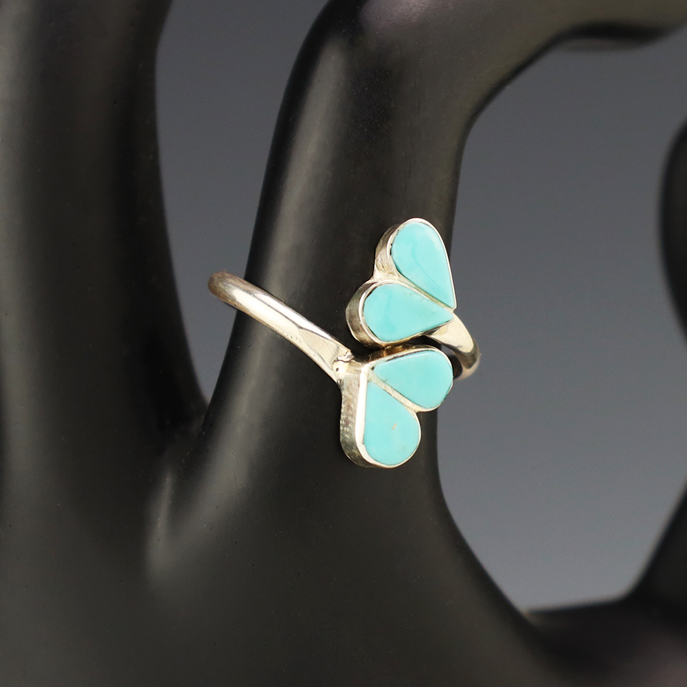 Zuni artists are known for their fine lapidary skills. Each stone is hand cut, polished, and set into a sterling silver setting. The ring is set with Turquoise stones. Weighs 2 grams. Size is adjustable.