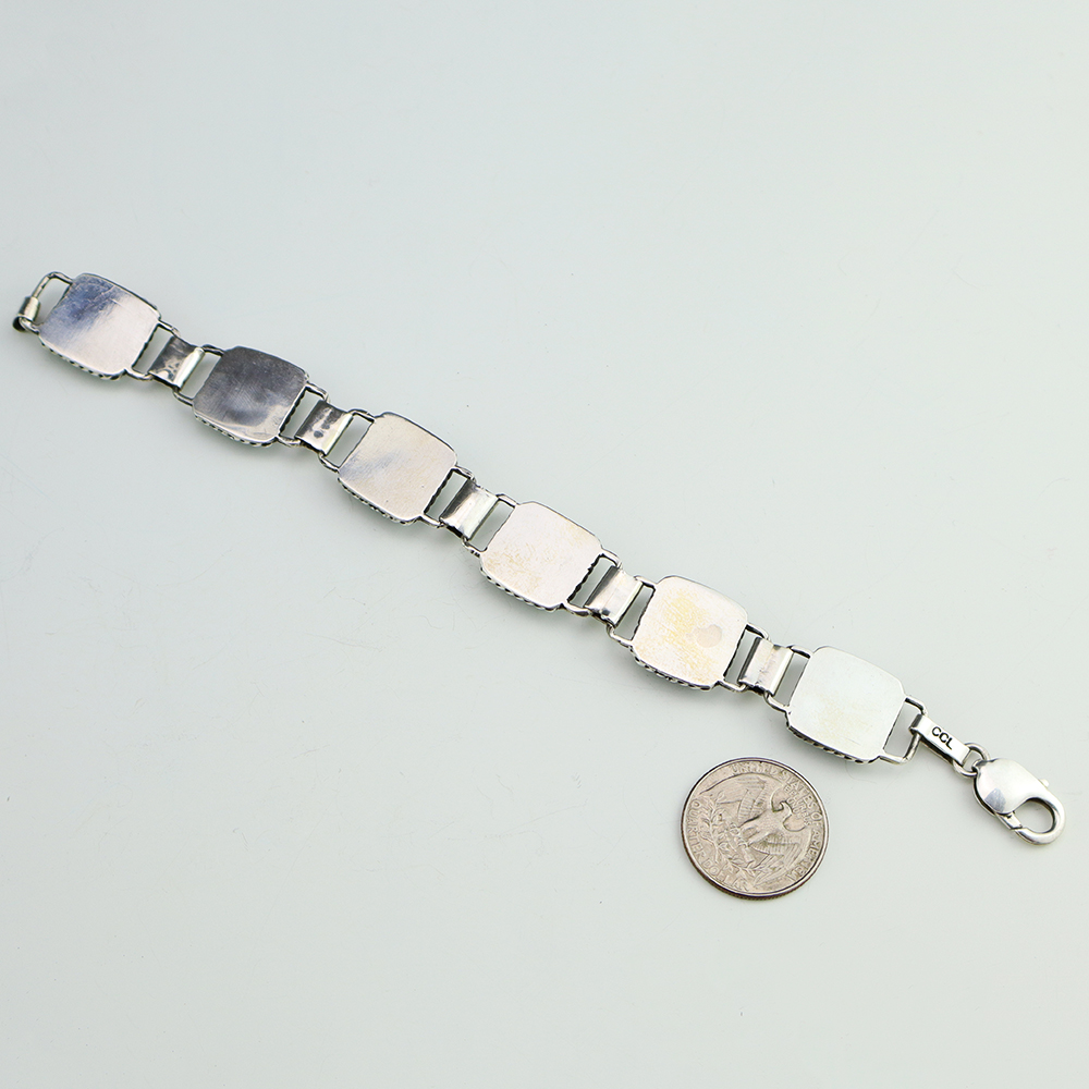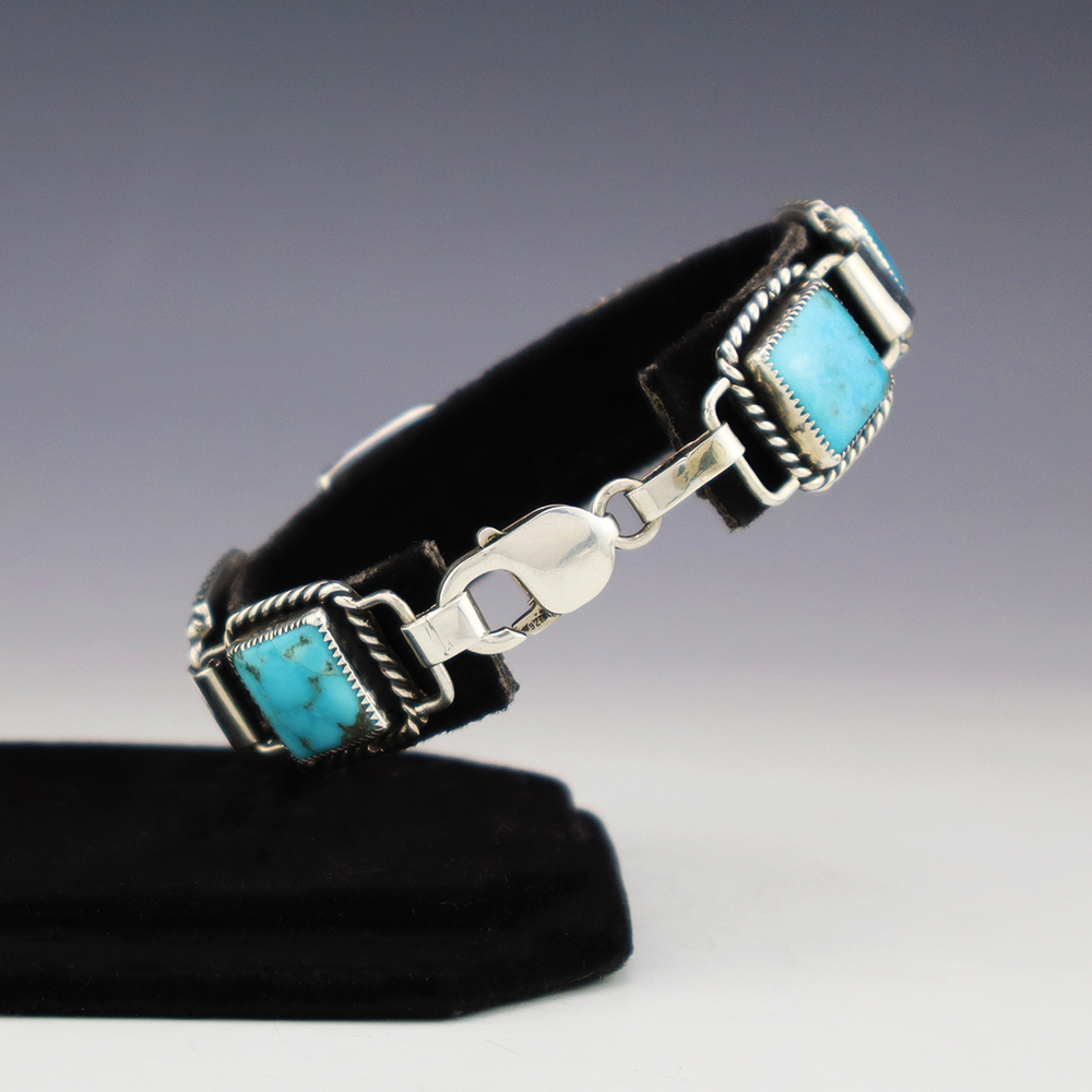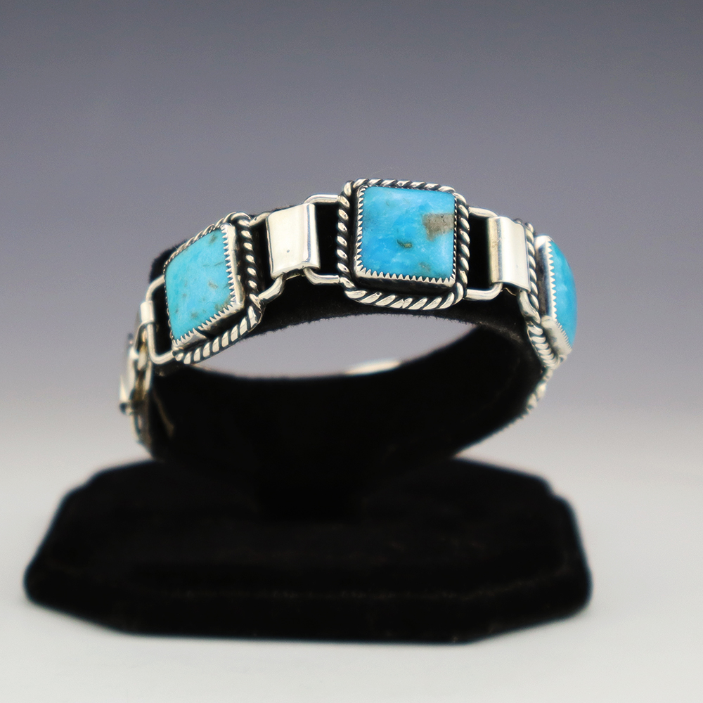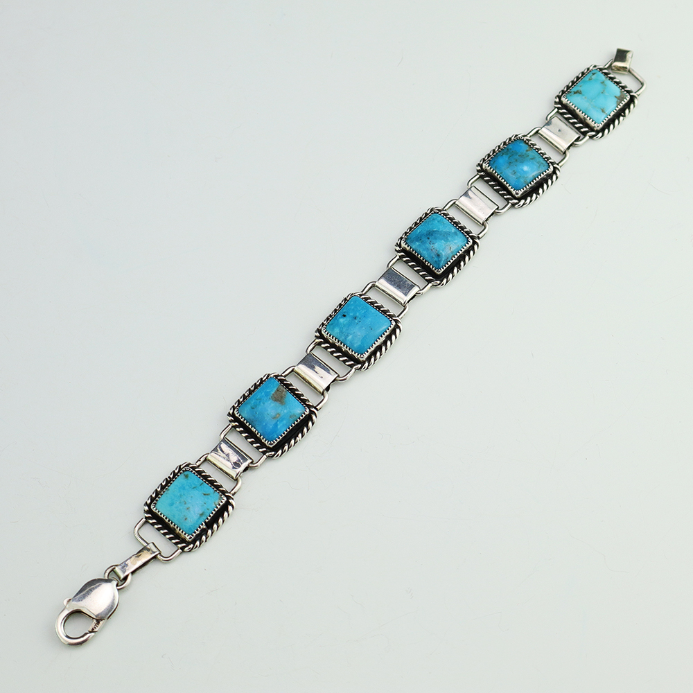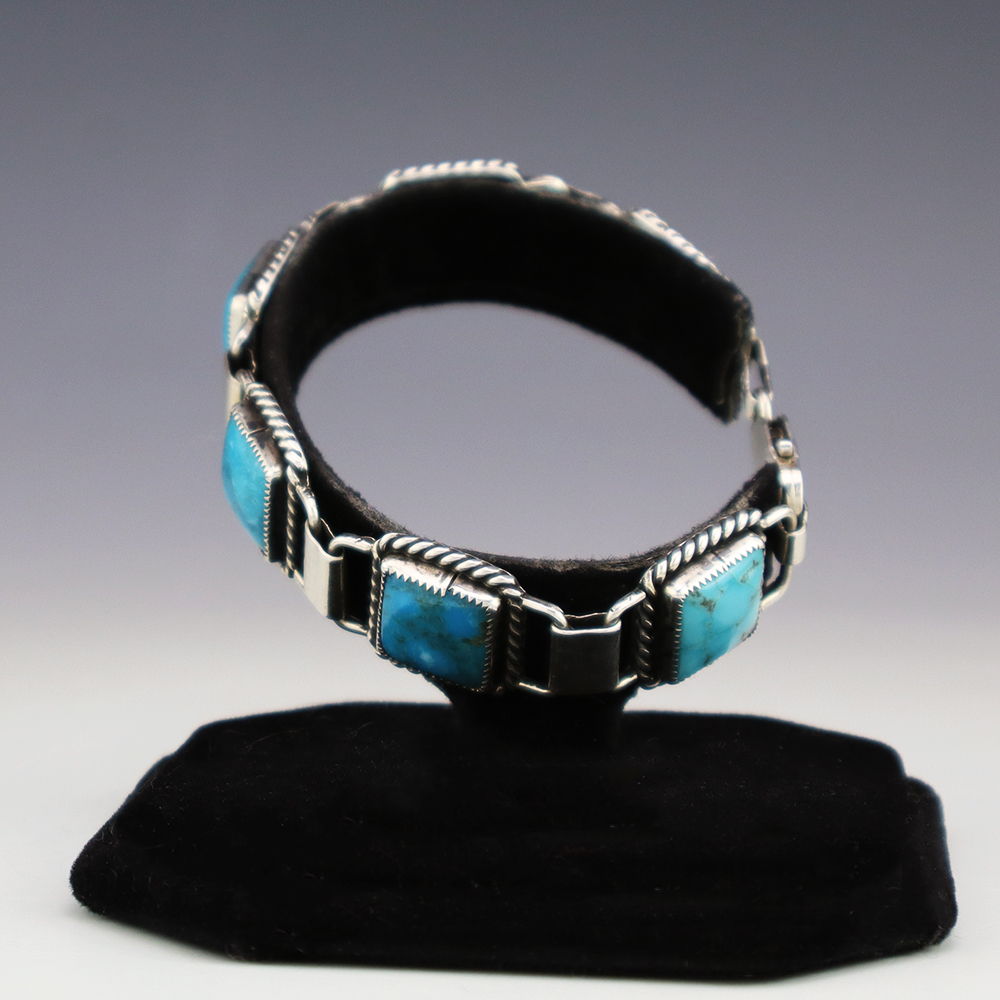 Zuni artist Carlo Lonjose hand crafted this beautiful link bracelet. The bracelet is sterling silver and is set with natural Kingman Turquoise stones. The components are all hand fabricated, and the stones are all natural. Carlo comes from a family of Zuni jewelers. Weighs 38 grams. Signed.