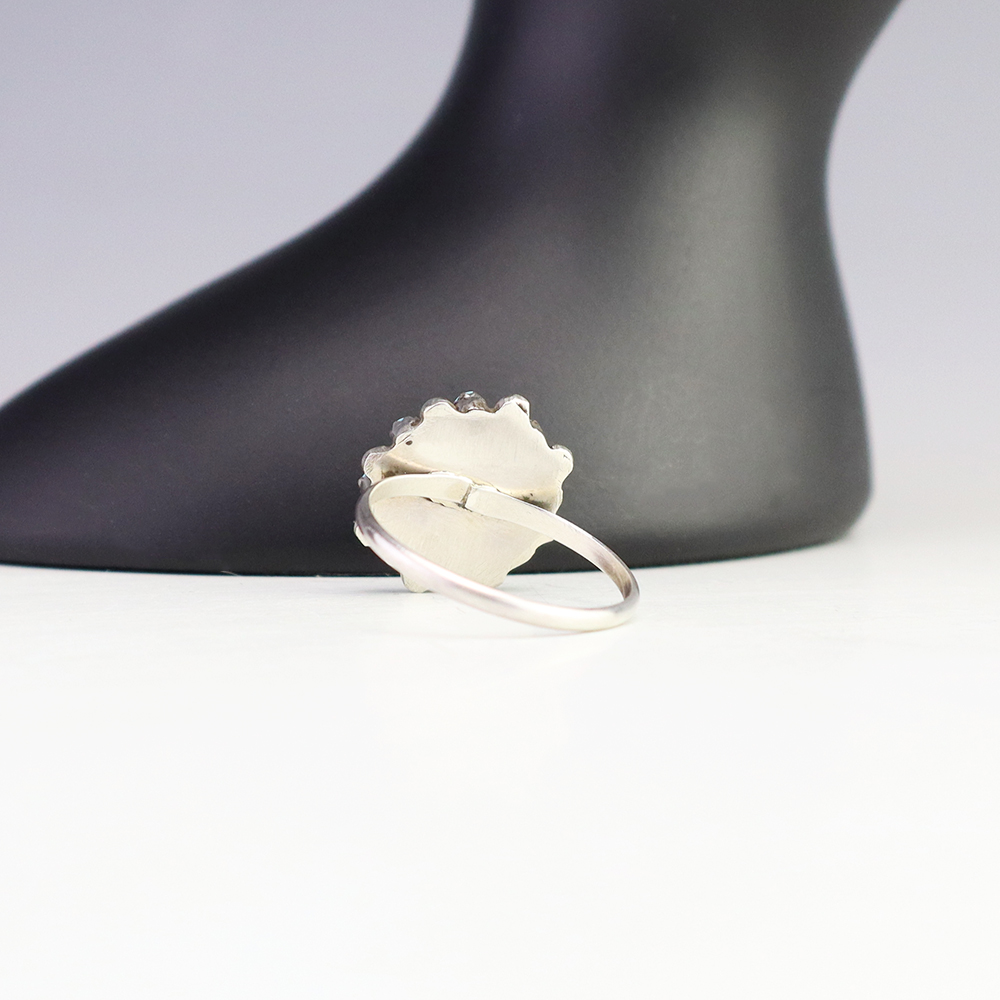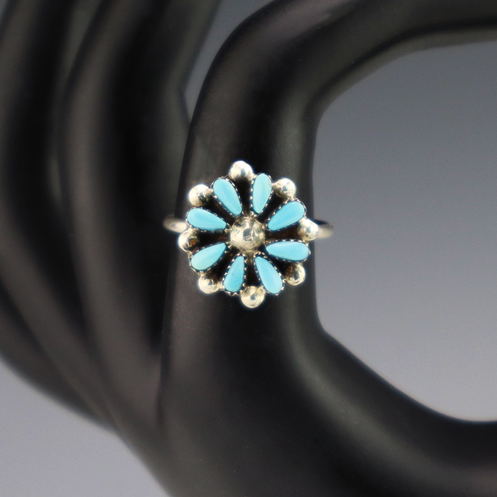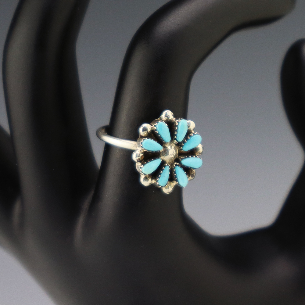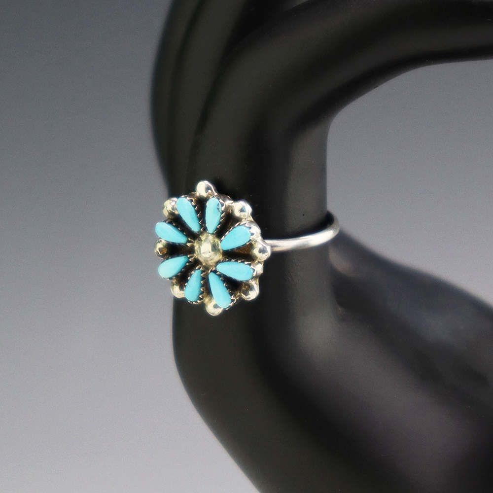 Zuni artists David and Sarita Leekity hand made this lovely ring out of sterling silver and Turquoise. Great petit point design! Weighs 4 grams. Size 7.