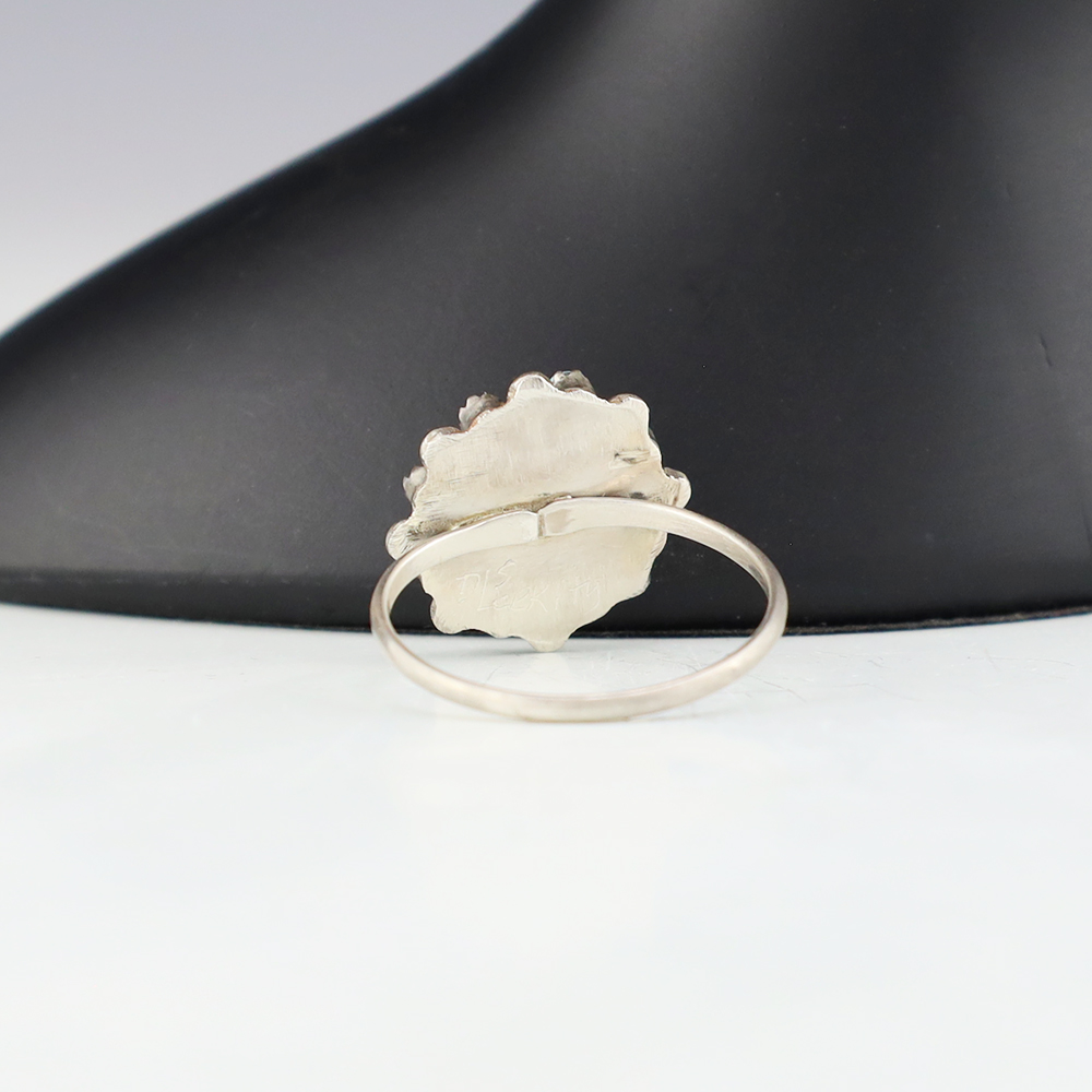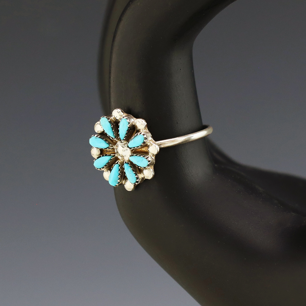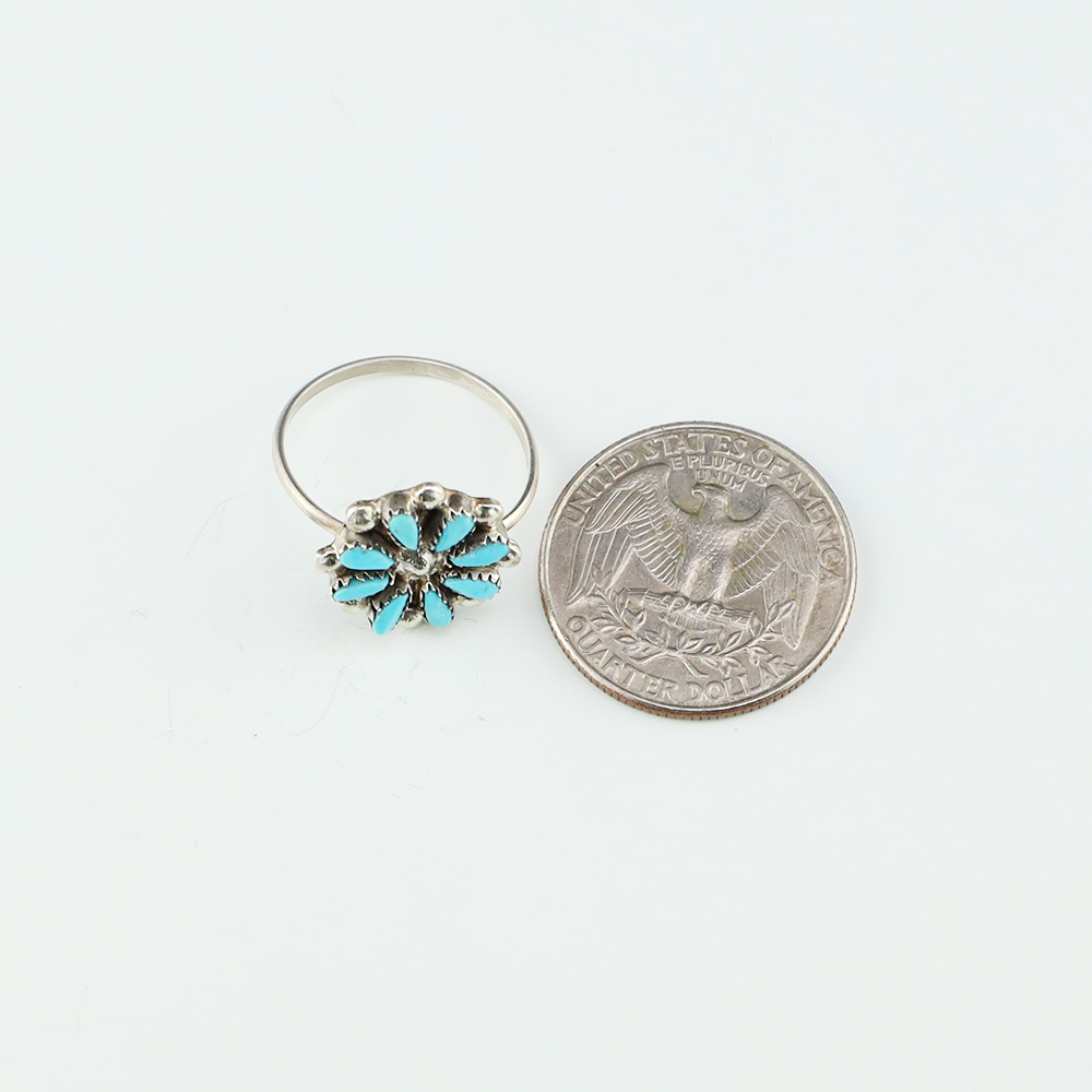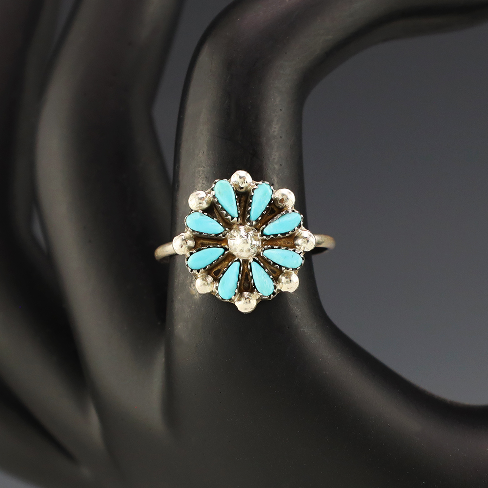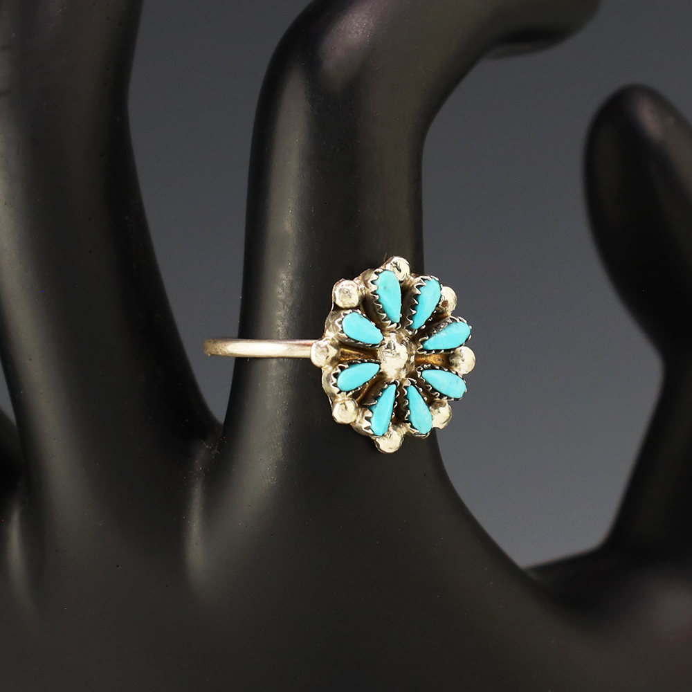 Zuni artists David and Sarita Leekity hand made this lovely ring out of sterling silver and Turquoise. Great petit point design! Weighs 4 grams. Size 8. Signed