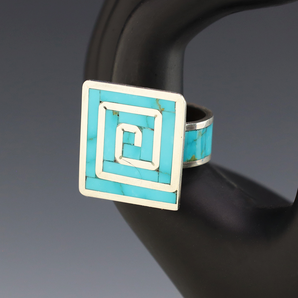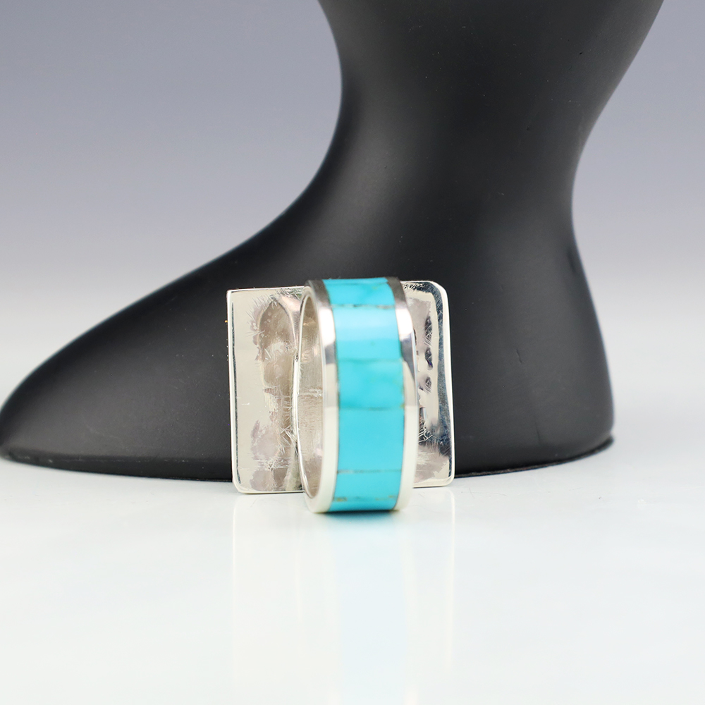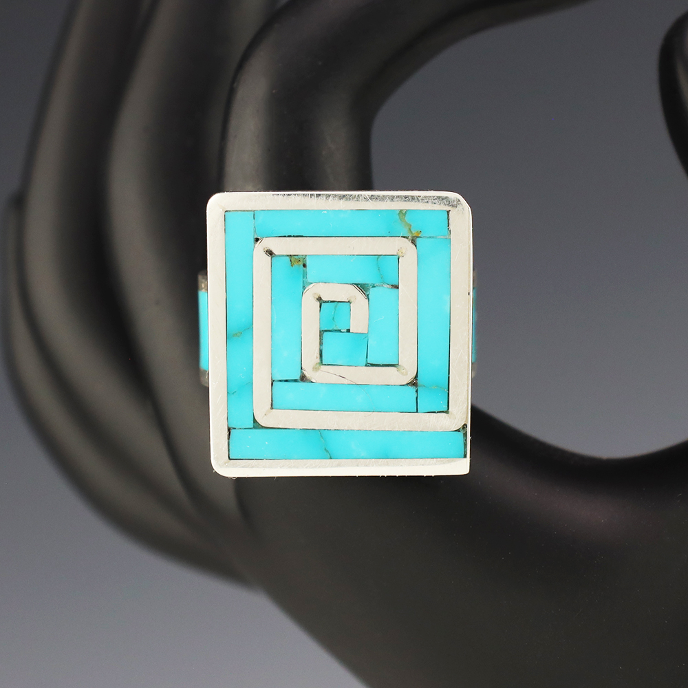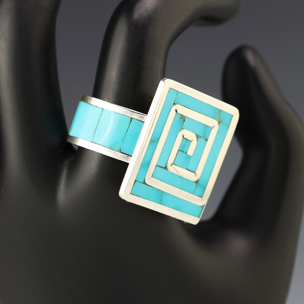 Amazing inlay work! Zuni jewelry makers, Nancy and Sheldon Westika created this magnificent ring. Made out of sterling silver and inlaid with Kingman Turquoise and Jet. Zuni artists are known for their lapidary work. The Westikas have been making jewelry since the 1970’s and they are known for their fine...