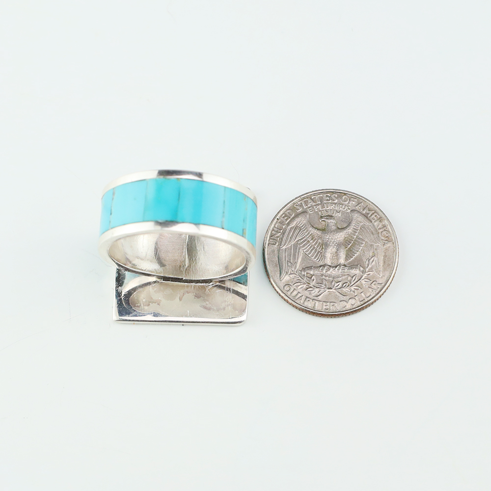 Zuni artist Elliot Coonsis made this stunning ring. Zuni artists are known for their fine lapidary skills. Each stone is hand cut, polished, and set into a sterling silver setting. The ring is inlaid with Turquoise. Weighs 14 grams. Size 13.