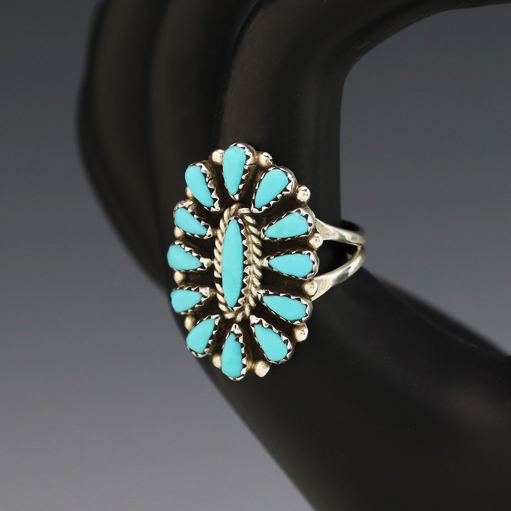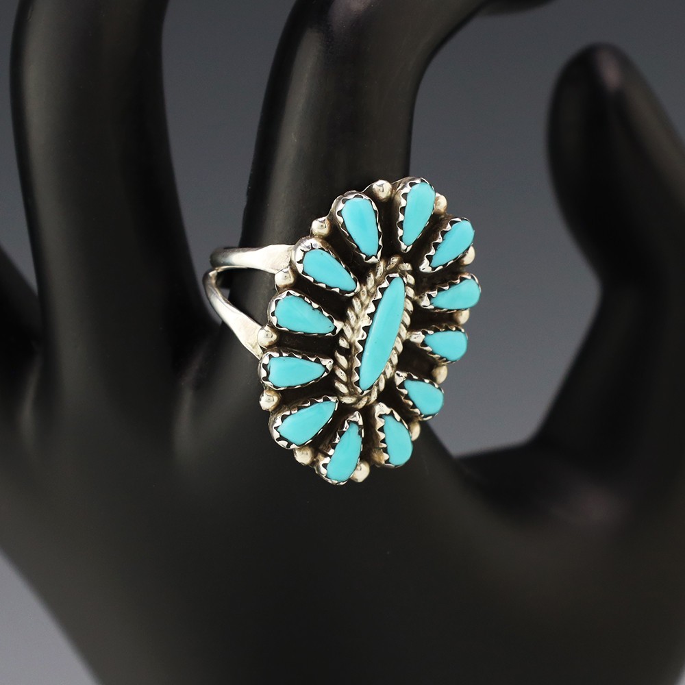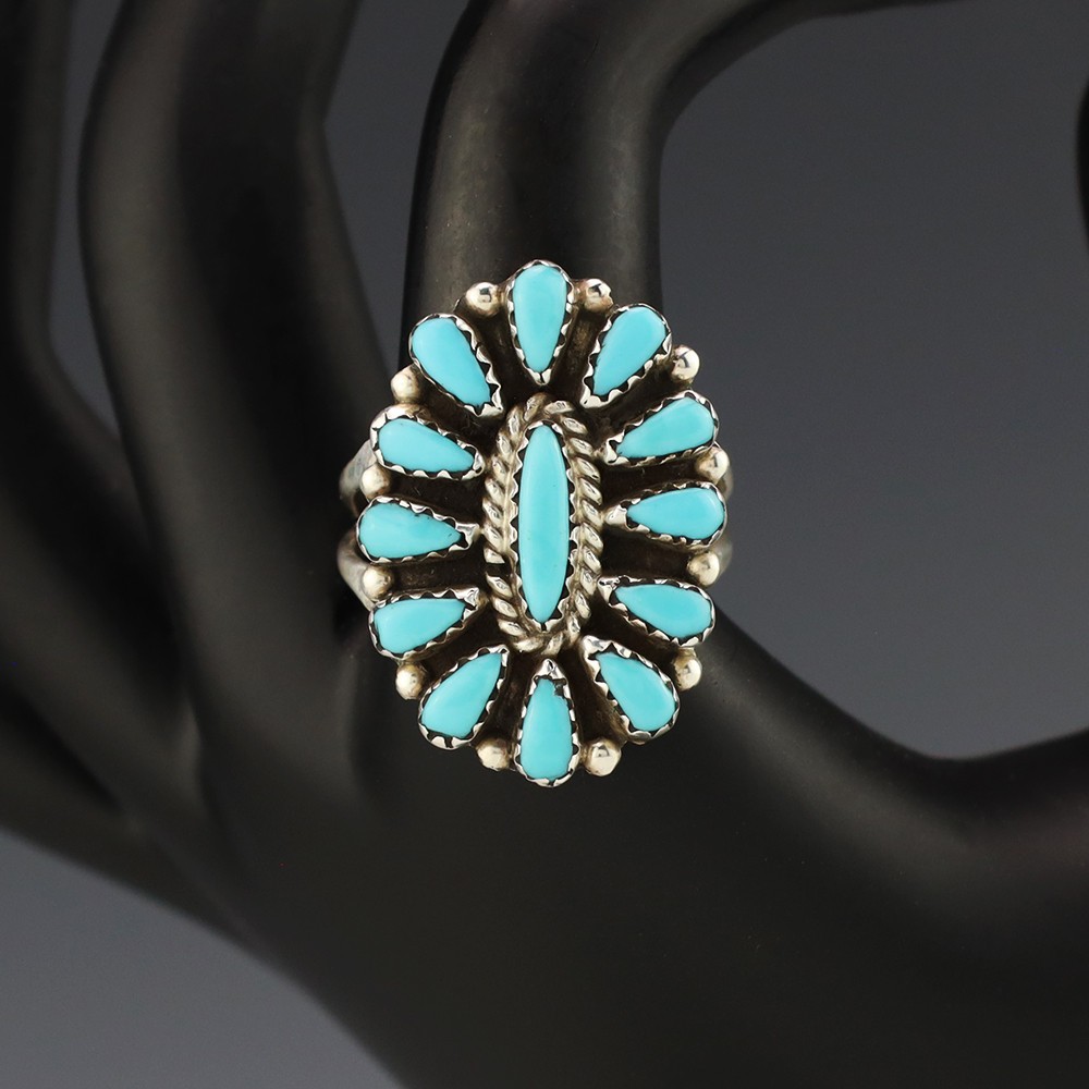 Zuni jeweler George Gasper made this lovely Turquoise ring. Zuni artists are known for their fine lapidary skills. Each stone is hand cut, polished, and set into a sterling silver setting. Weighs 6 grams. Size 9 3/4.