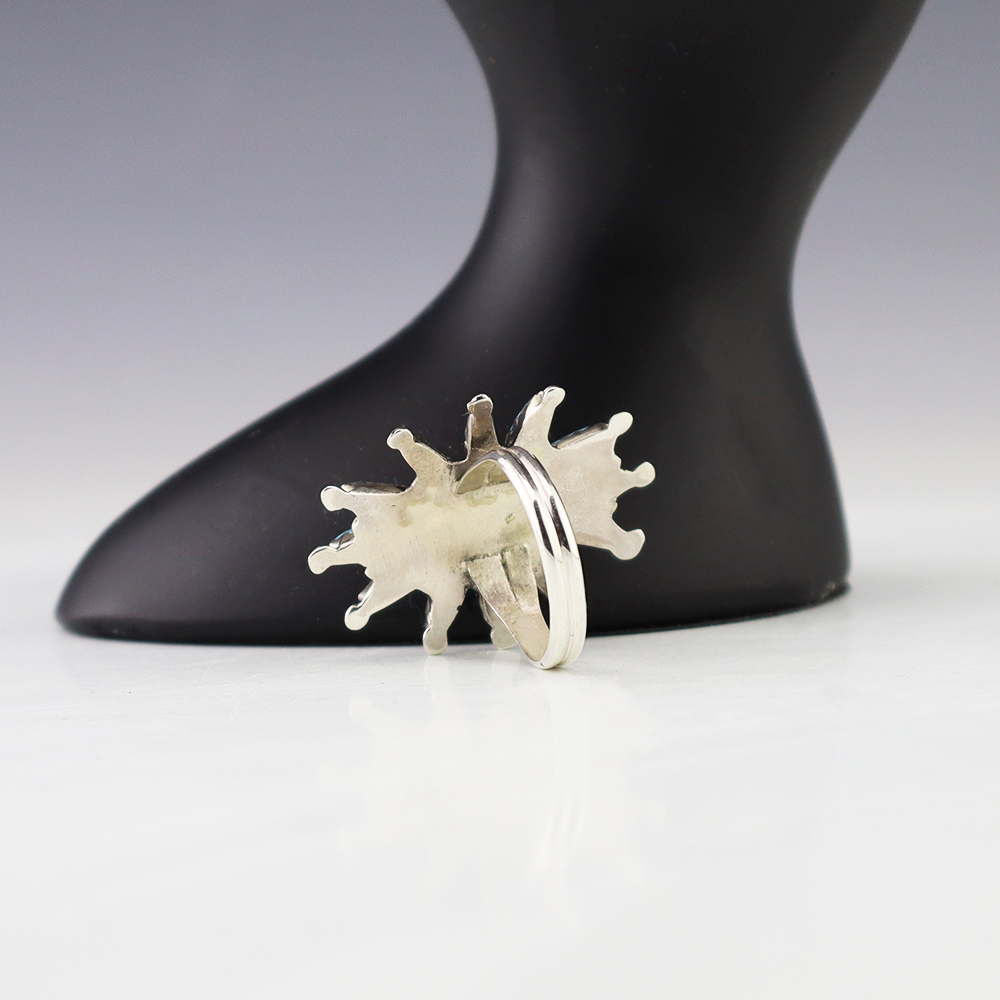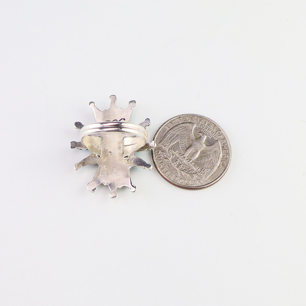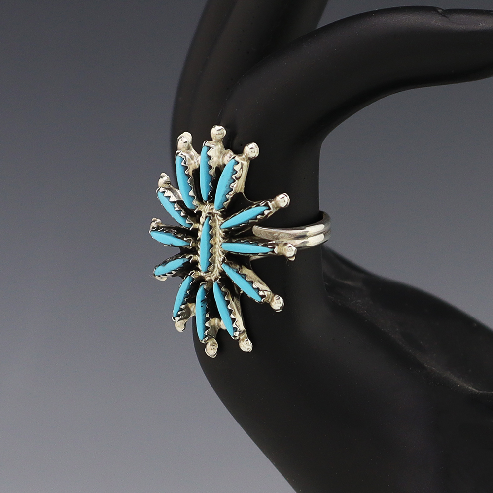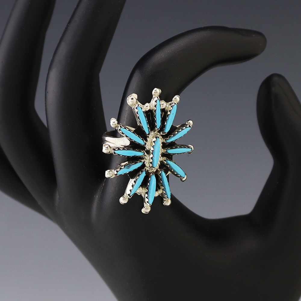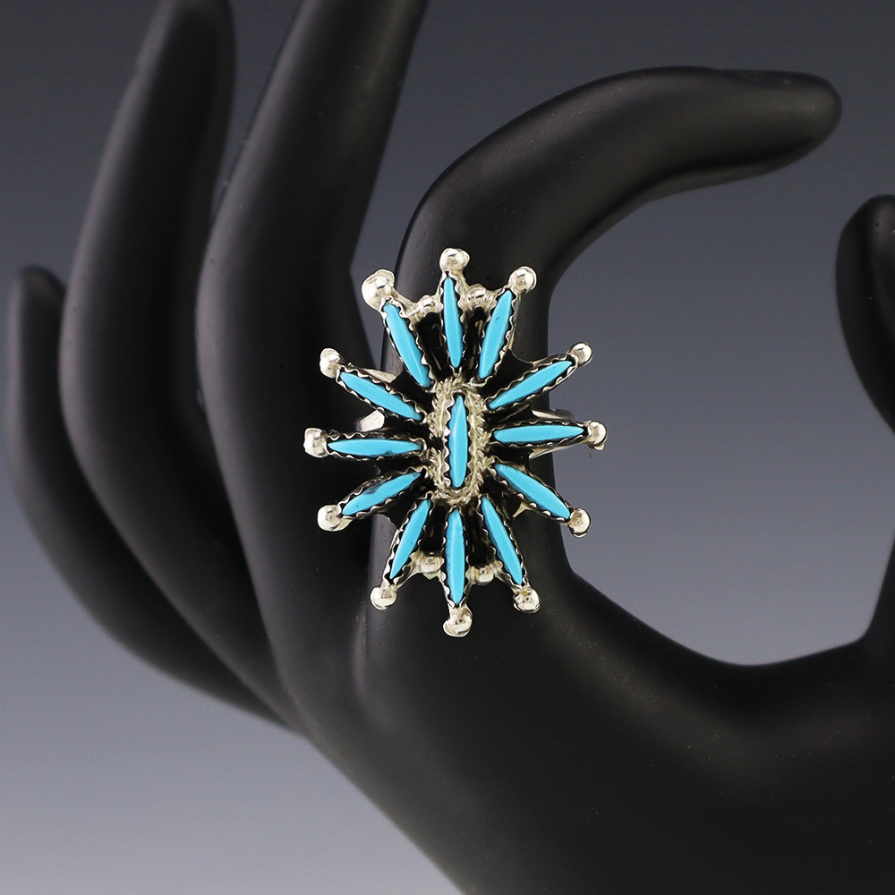 Zuni jeweler Gerald Etsate made this lovely Turquoise needlepoint ring. Zuni artists are known for their fine lapidary skills. Each stone is hand cut, polished, and set into a sterling silver setting. Weighs 6 grams. Size 7. Signed
