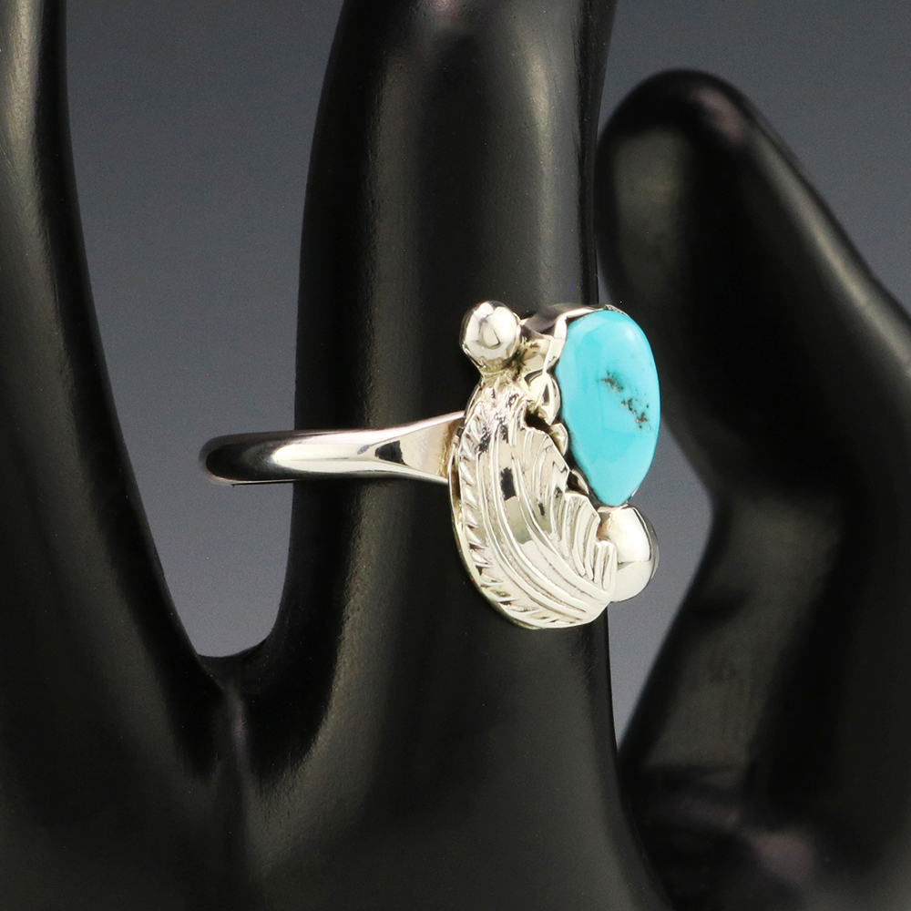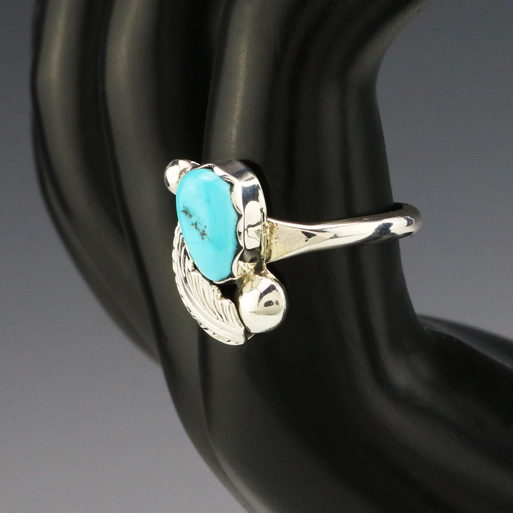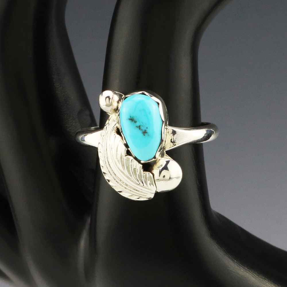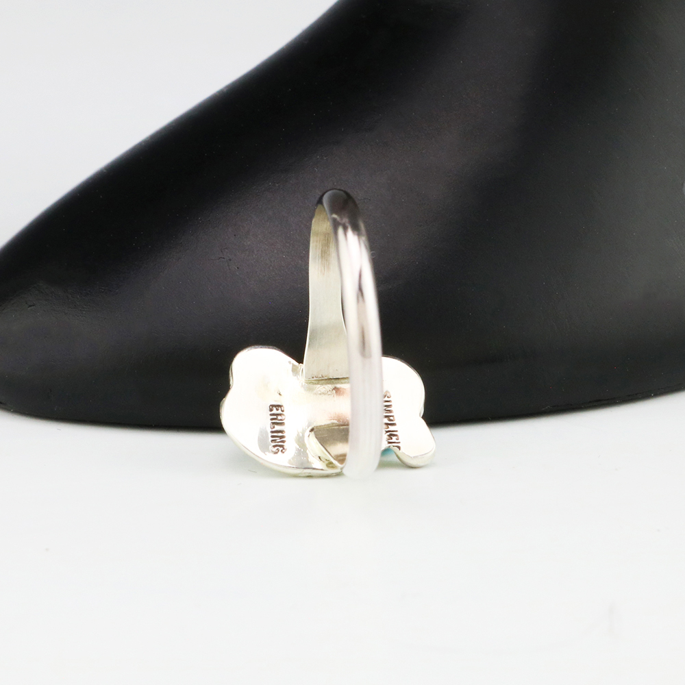 Zuni jeweler Lydia Simplicio made this lovely ring. Zuni artists are known for their fine lapidary skills. Each stone is hand cut, polished, and set into a sterling silver setting. The ring is set with a Turquoise stone. Weighs 2 grams. Size 7 1/2. Signed