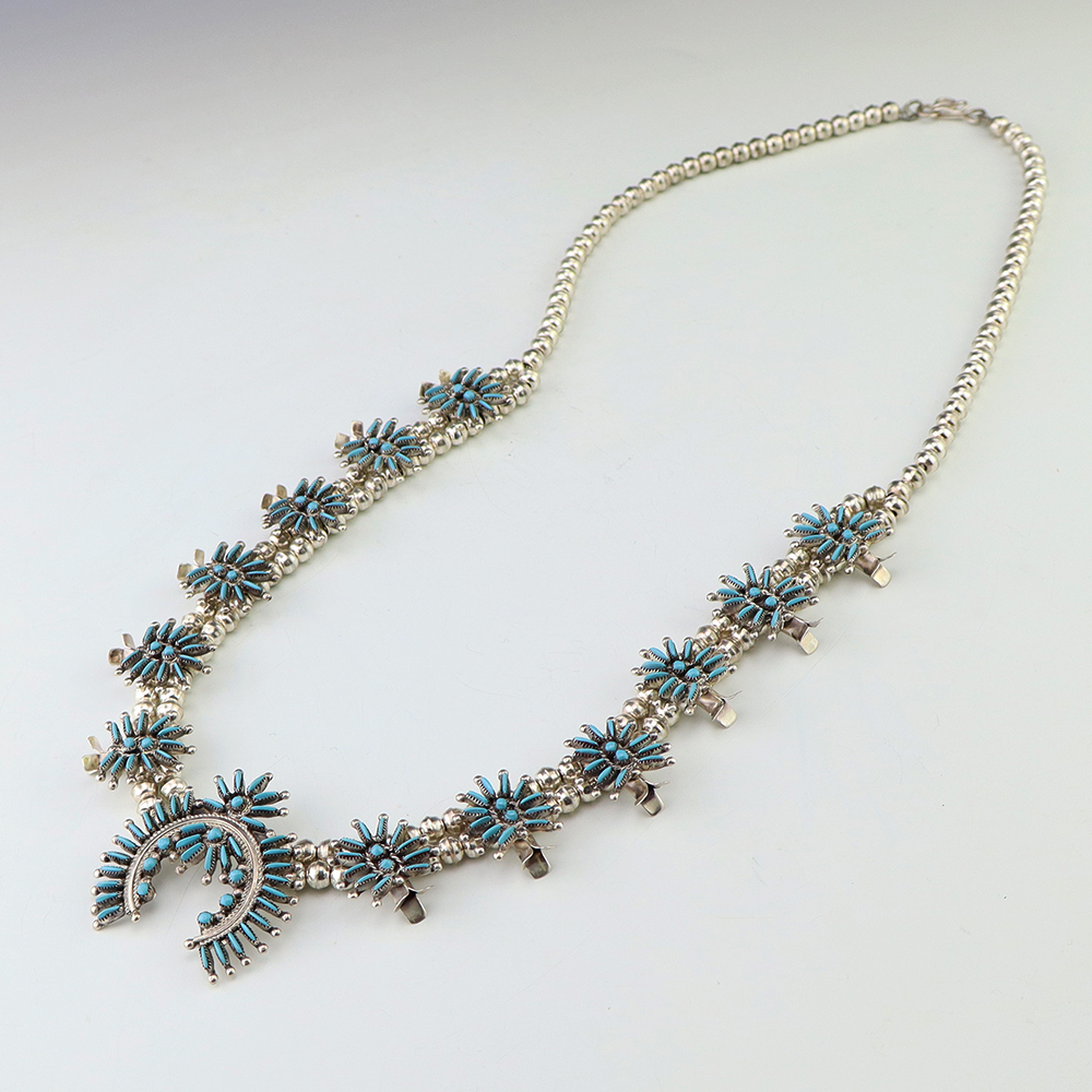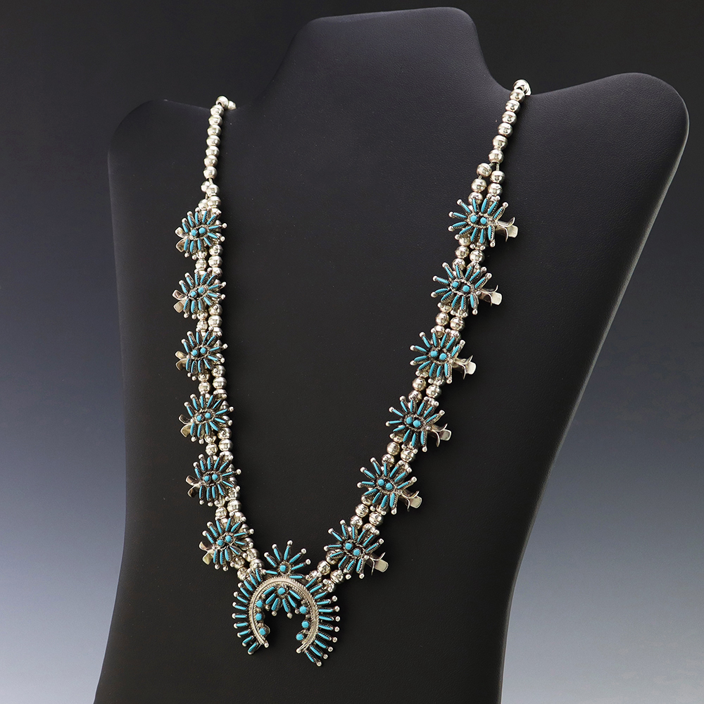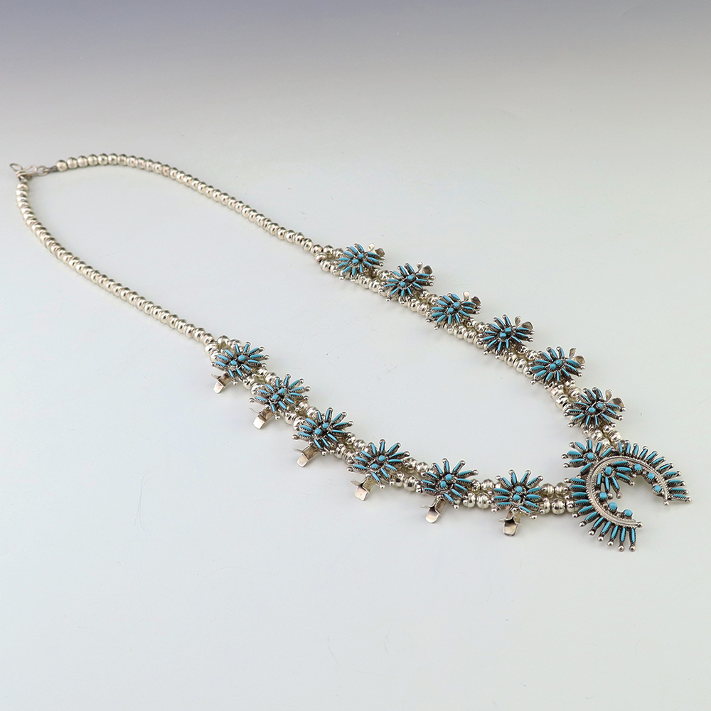 Gorgeous sterling silver and turquoise needlepoint squash blossom necklace by Zuni artist Lorna Mahkee. The squash blossoms and the naja are set with Turquoise stones. The necklace is strung with sterling silver 4 mm beads. The necklace is finished off with a sterling silver hook and eye. A timeless beauty that you will enjoy for years to come. The necklace weighs 58 grams. Signed.