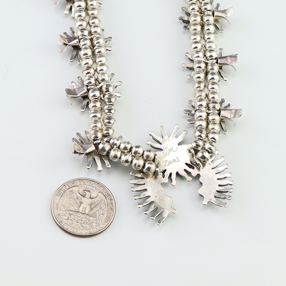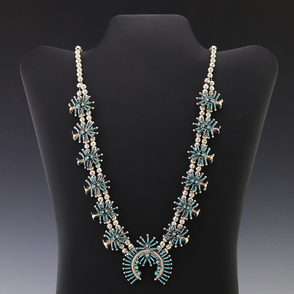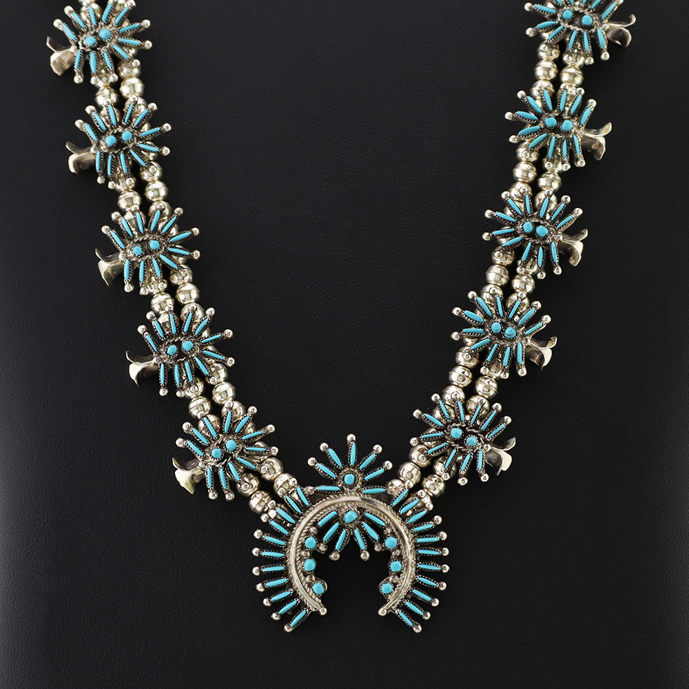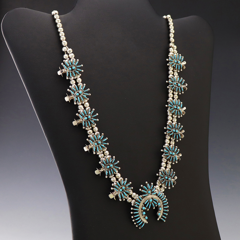 Gorgeous sterling silver and turquoise needlepoint squash blossom necklace by Zuni artist Lorna Mahkee. The squash blossoms and the naja are set with Turquoise stones. The necklace is strung with sterling silver 4 mm beads. The necklace is finished off with a sterling silver hook and eye. A timeless beauty that you will enjoy for years to come. The necklace weighs 58 grams. Signed.