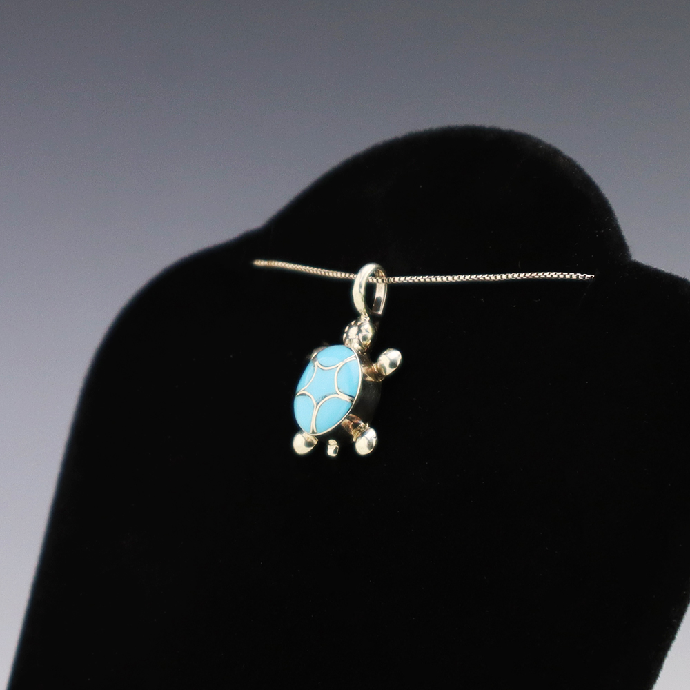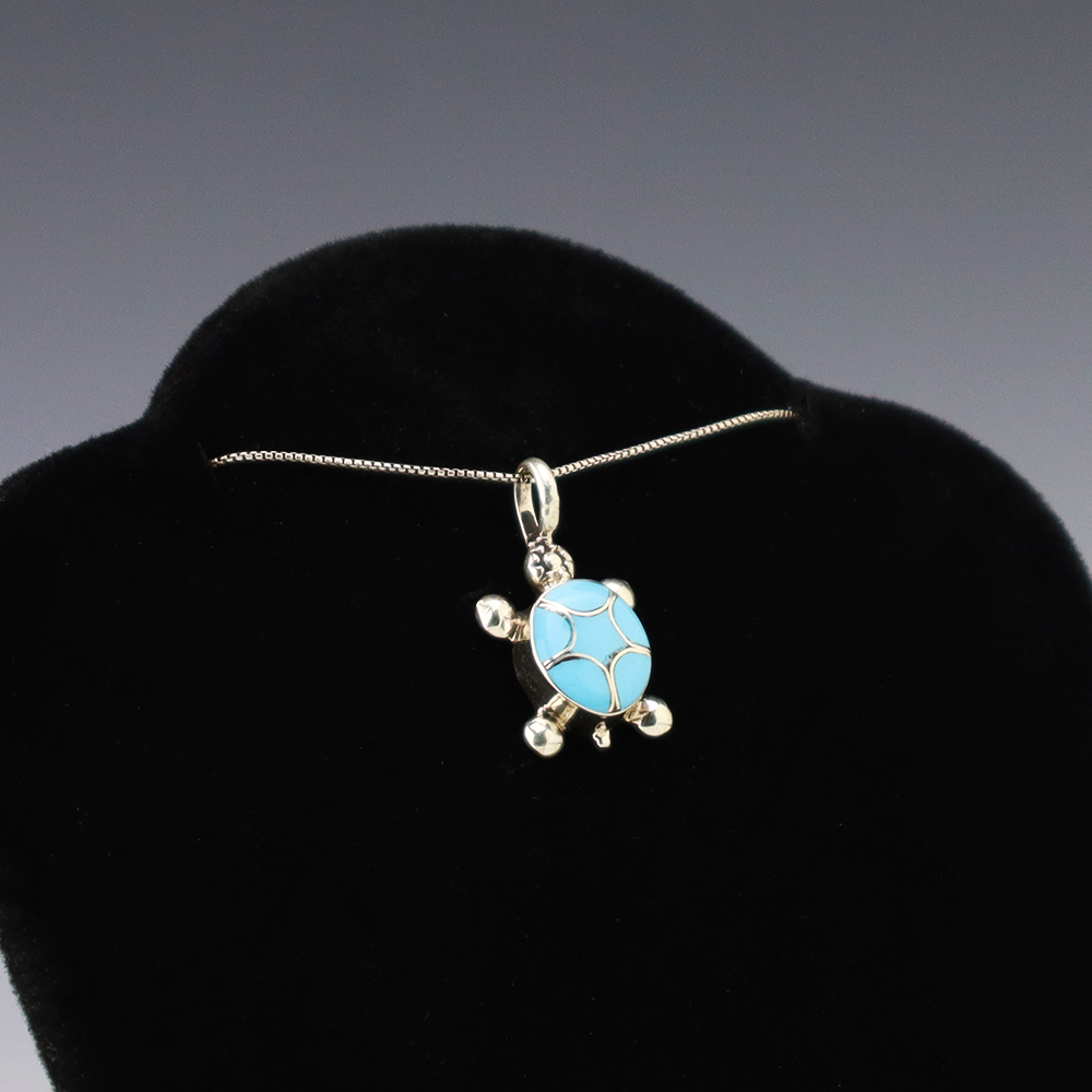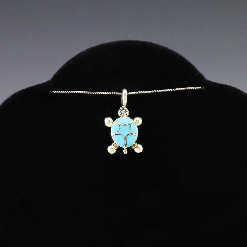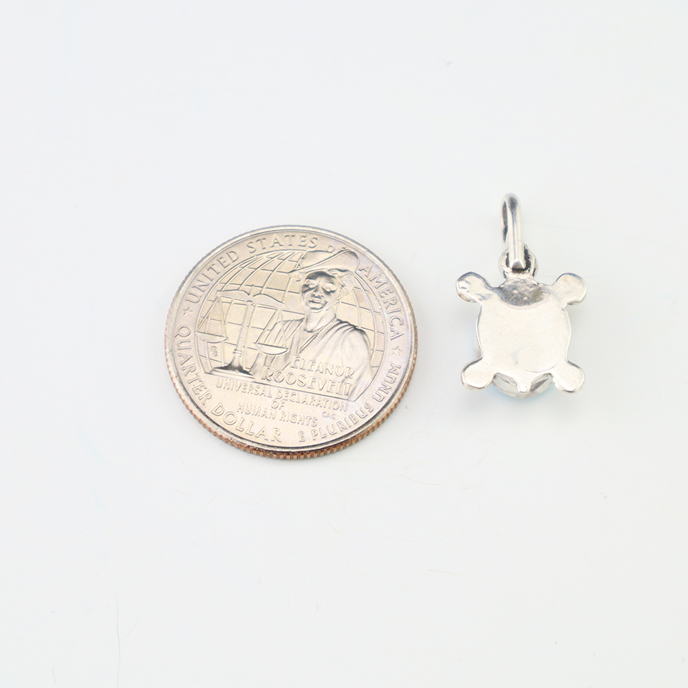 Zuni artists are known for their fine lapidary skills. Each stone is hand cut, polished, and set into a sterling silver setting. This wonderful turtle pendant is inlaid with Turquoise stones. Hand made by Zuni artist Rebecca Lalio. Weighs 2 grams. (Chain not included)