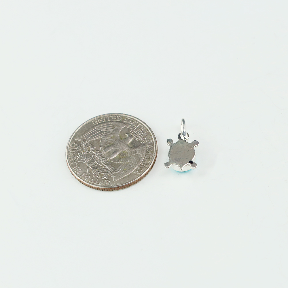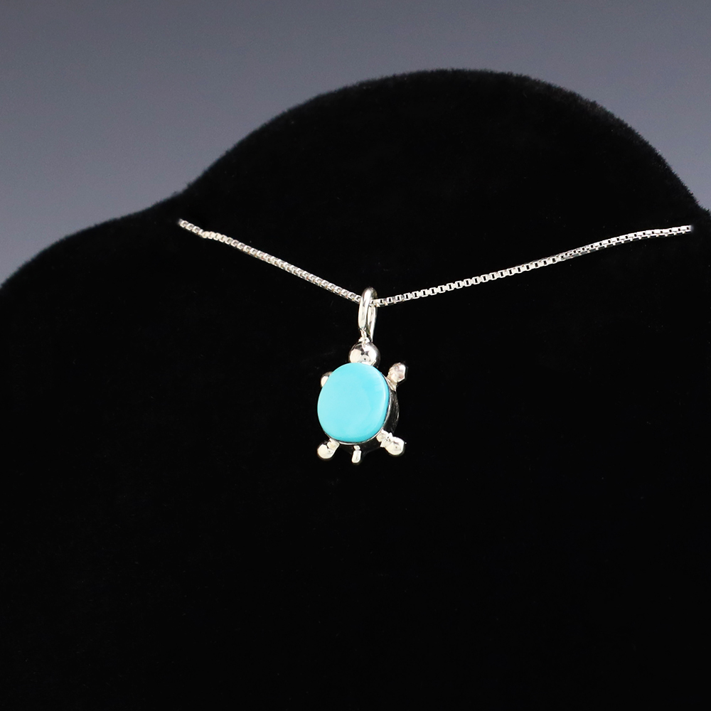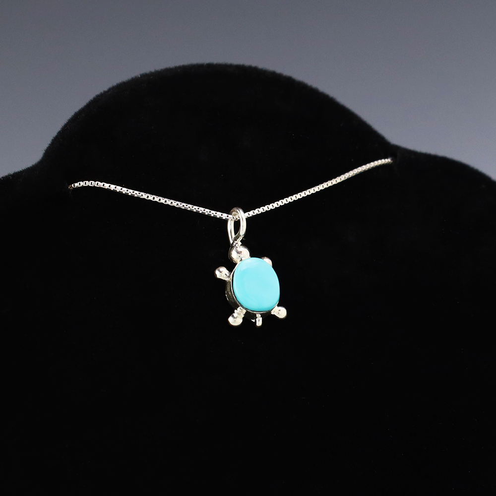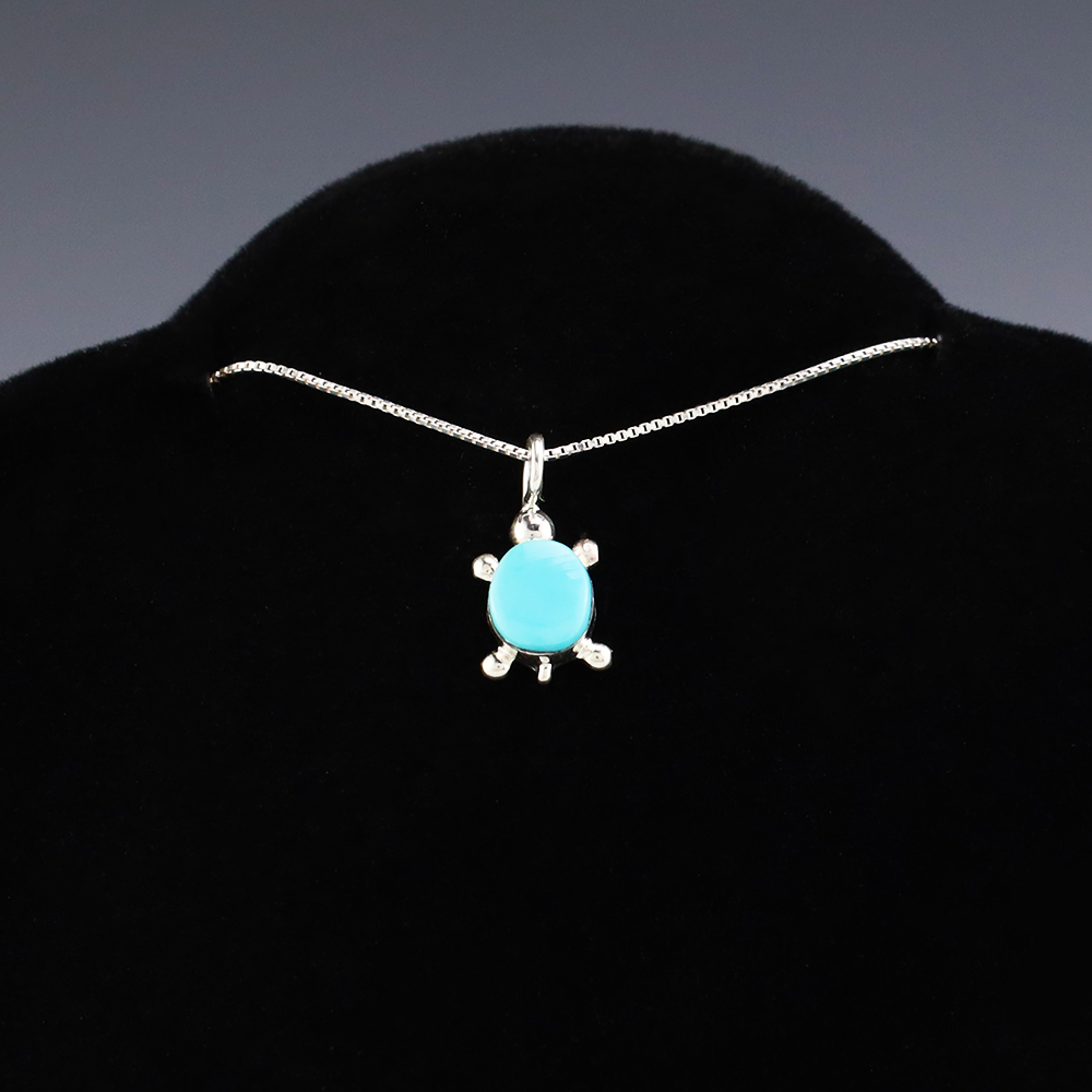 Zuni artists are known for their fine lapidary skills. Each stone is hand cut, polished, and set into a sterling silver setting. This wonderful turtle pendant is inlaid with a Turquoise stone. Hand made by Zuni artist Trista Siow. Weighs 2 grams. (Chain not included)