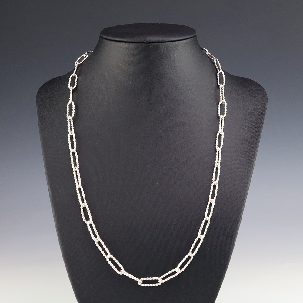Zuni artist Carlo Lonjose made this stellar twisted paperclip chain. Sterling silver. An exquisite statement piece that you will enjoy for many years. The necklace weighs 18 grams. Signed