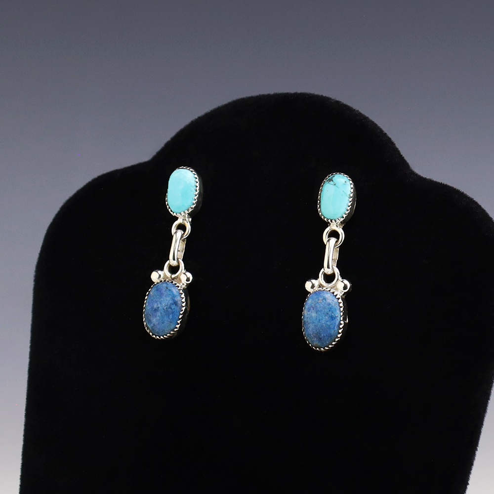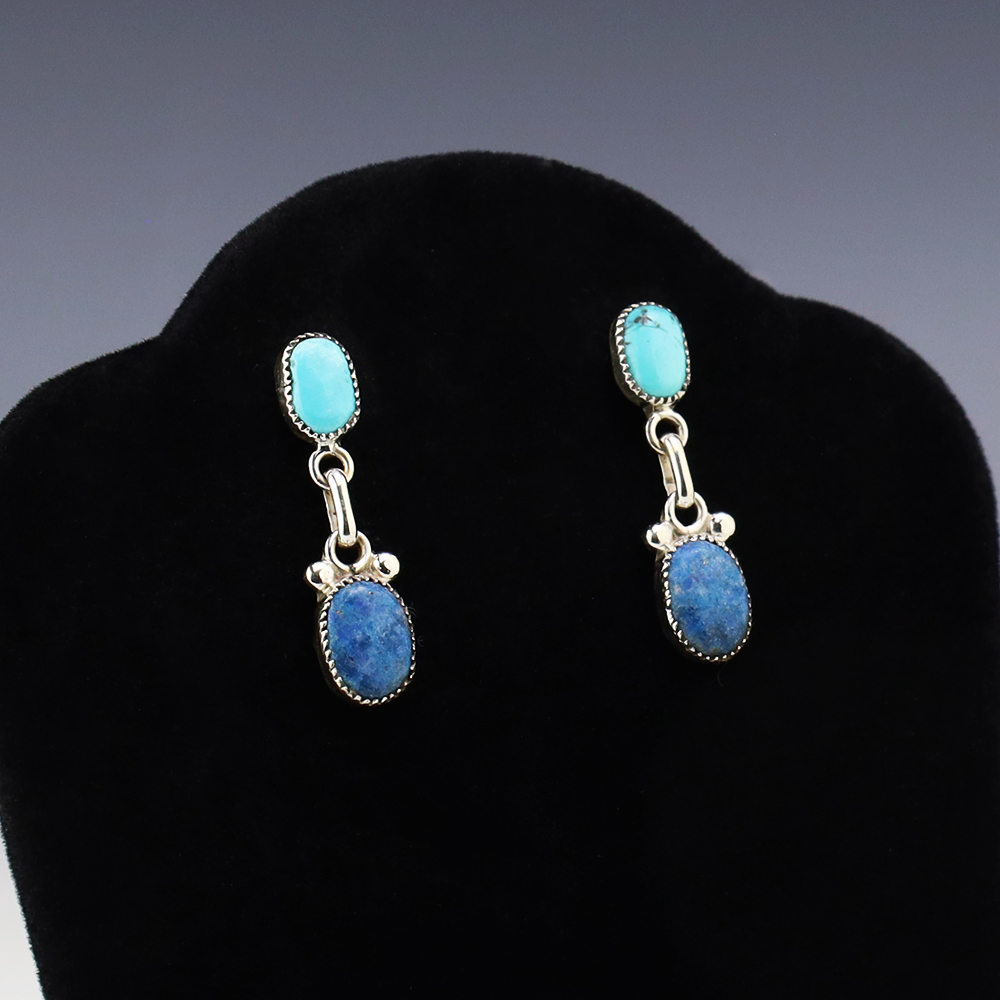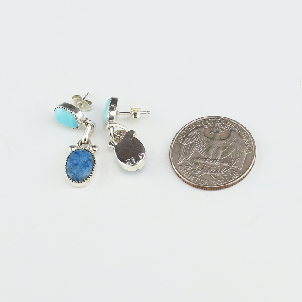 Zuni artist, Diane Lonjose made these beautiful earrings. Made out of sterling silver and set with natural Denim Lapis and Kingman Turquoise stones. The components are all hand fabricated, and the stones are all natural. Diane comes from a family of Zuni jewelers. She is the daughter of Alice and Duane Quam, and grandchild of Doris and Warren Ondelacy. Weighs 4 grams. Signed