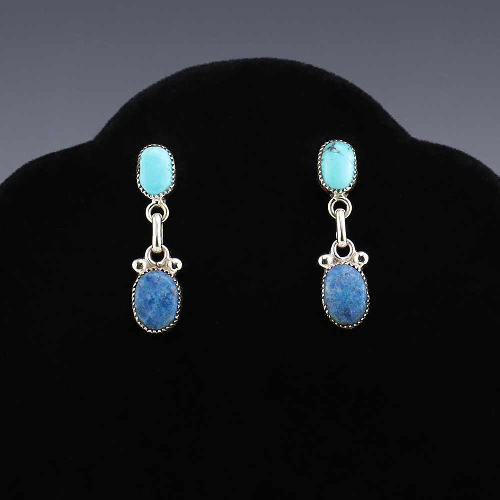 Zuni artist, Diane Lonjose made these beautiful earrings. Made out of sterling silver and set with natural Denim Lapis and Kingman Turquoise stones. The components are all hand fabricated, and the stones are all natural. Diane comes from a family of Zuni jewelers. She is the daughter of Alice and Duane Quam, and grandchild of Doris and Warren Ondelacy. Weighs 4 grams. Signed
