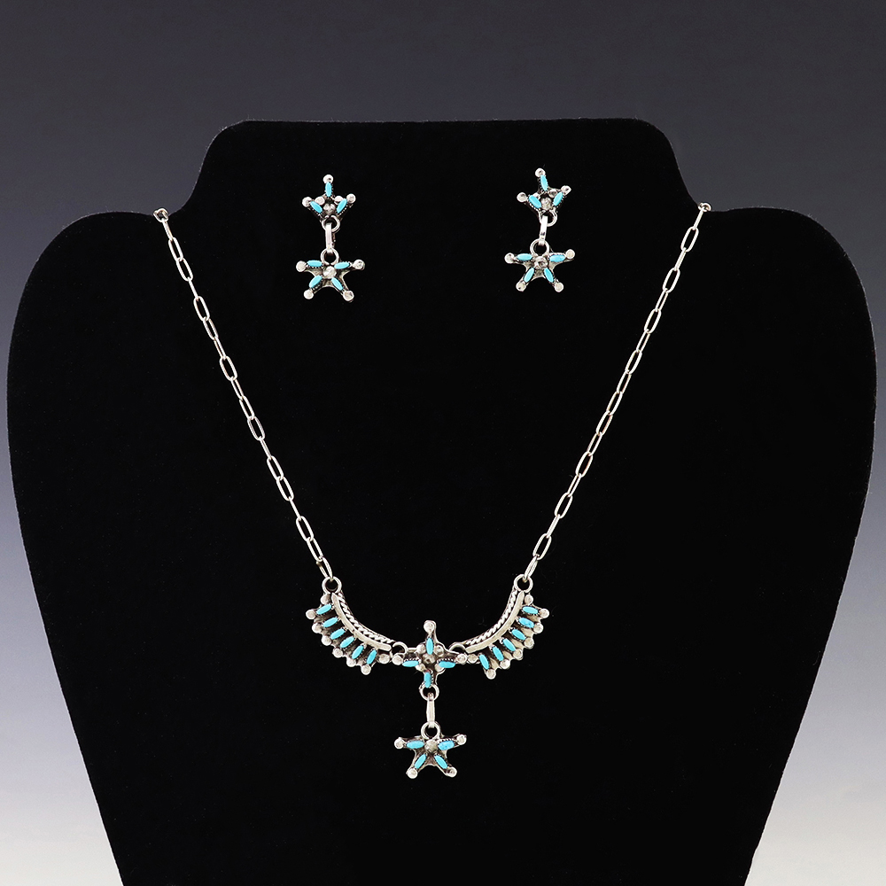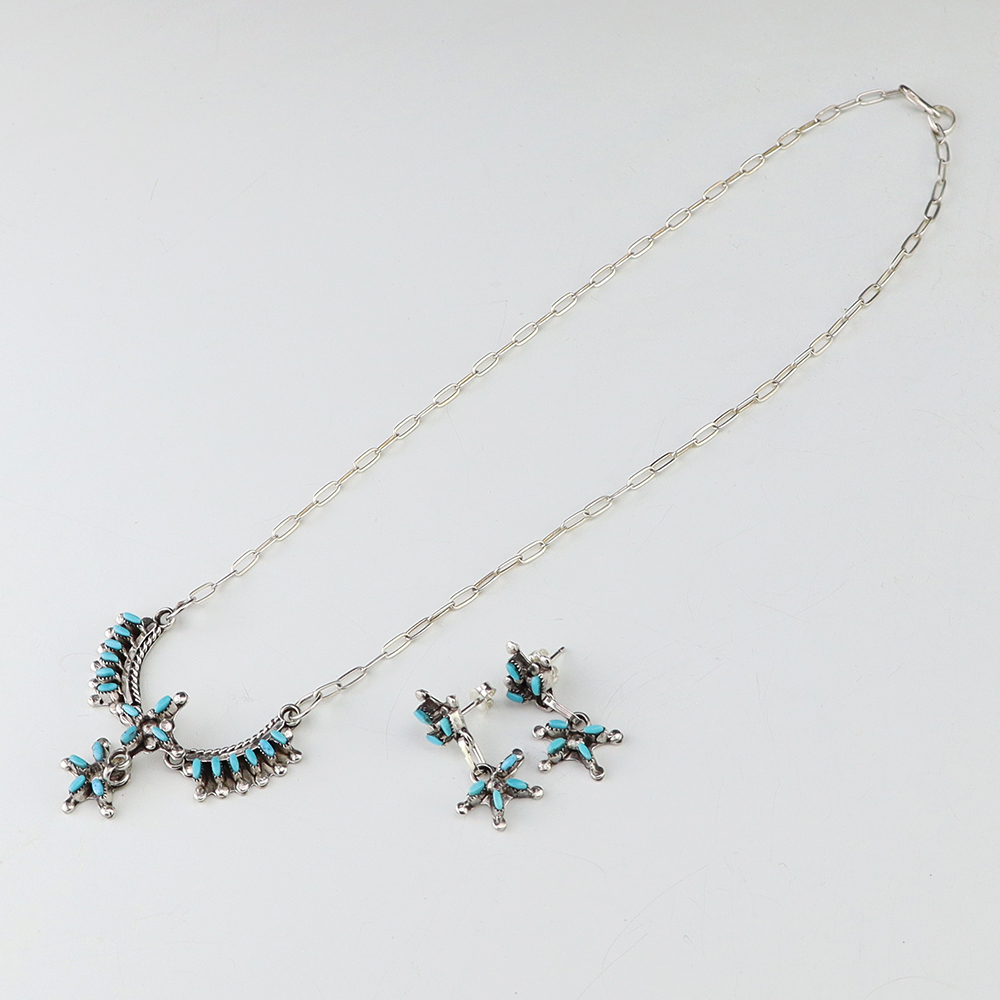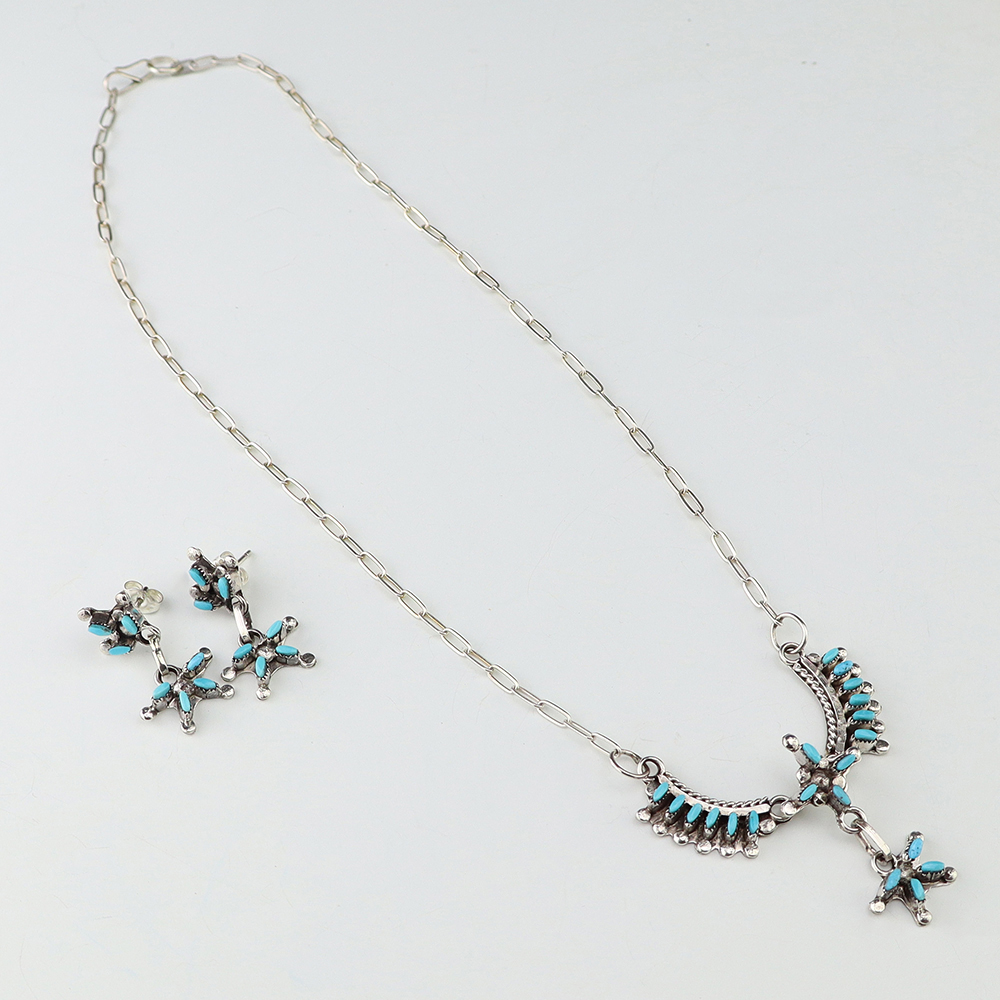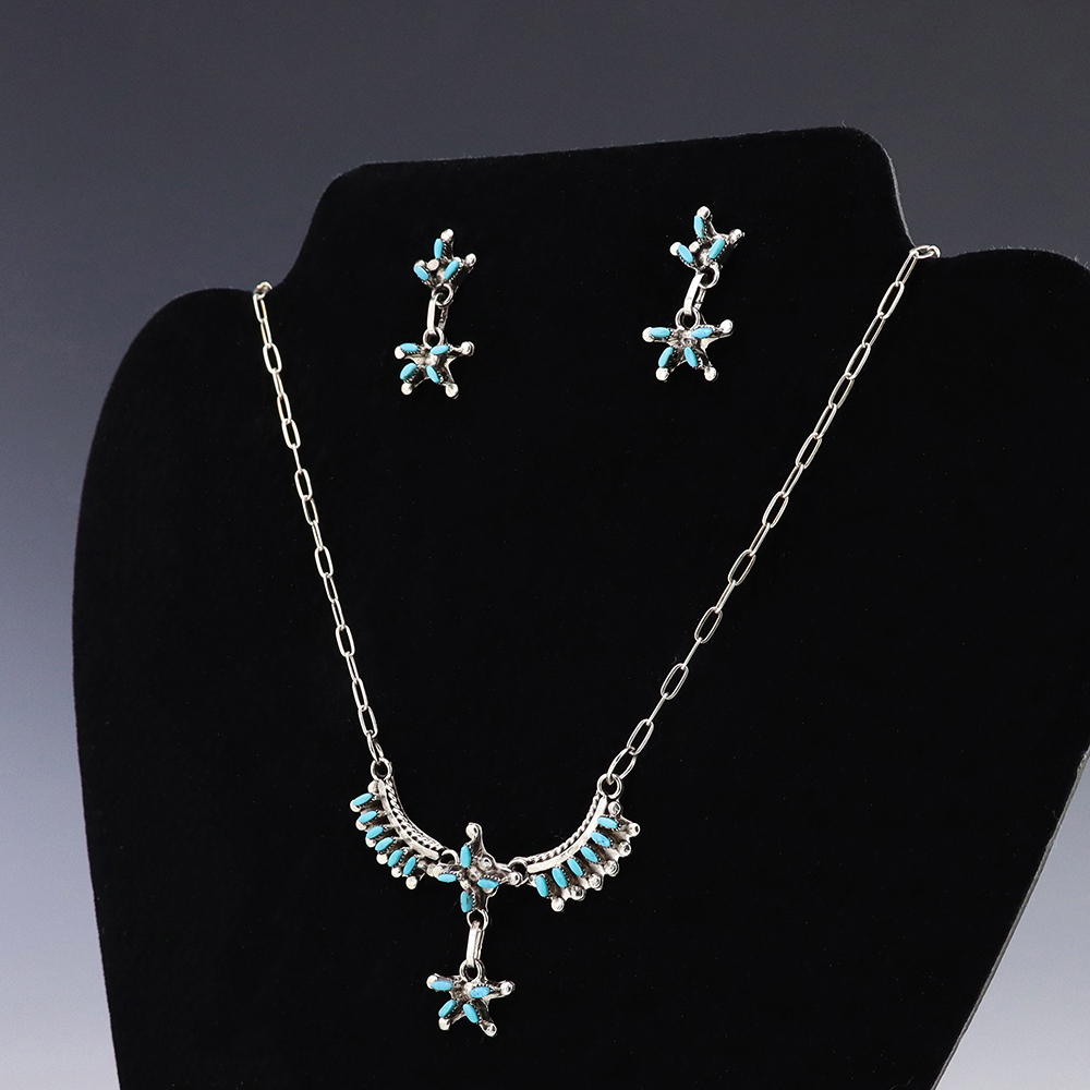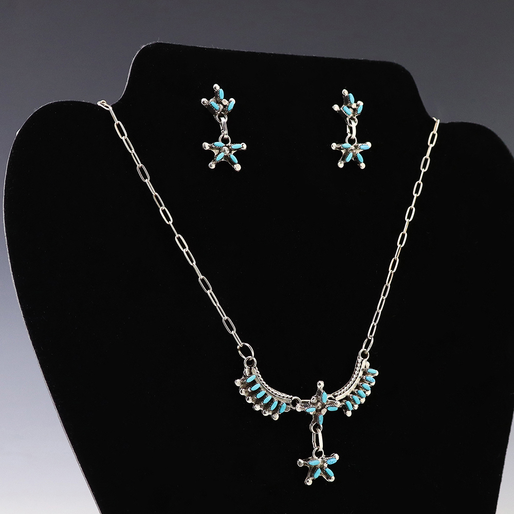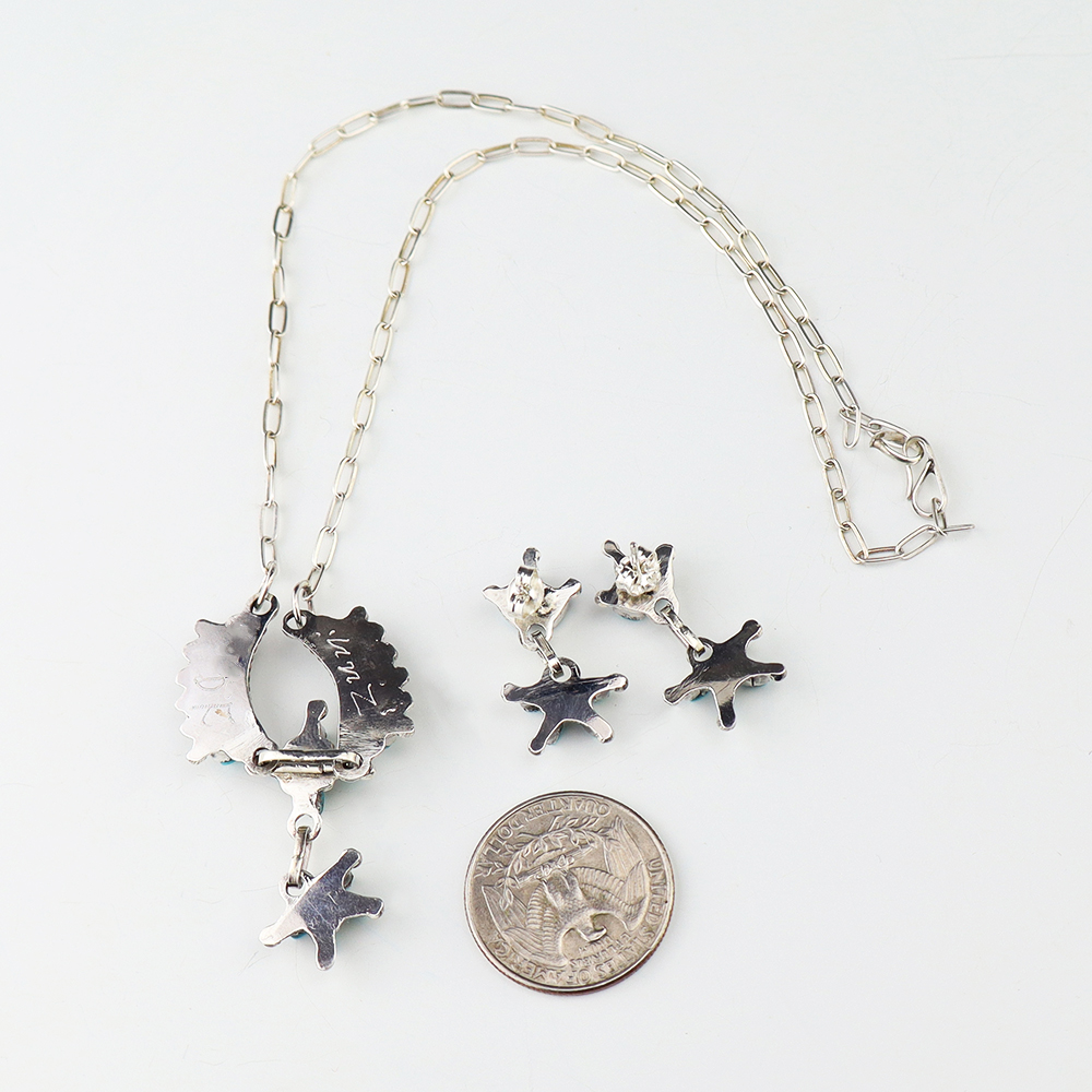 Zuni artist Darryl Fambrough made this beautiful necklace and earring set. Sterling silver and set with Turquoise An exquisite statement piece that you will enjoy for many years. The necklace weighs 8 grams. The earrings weighs 4 grams. Signed