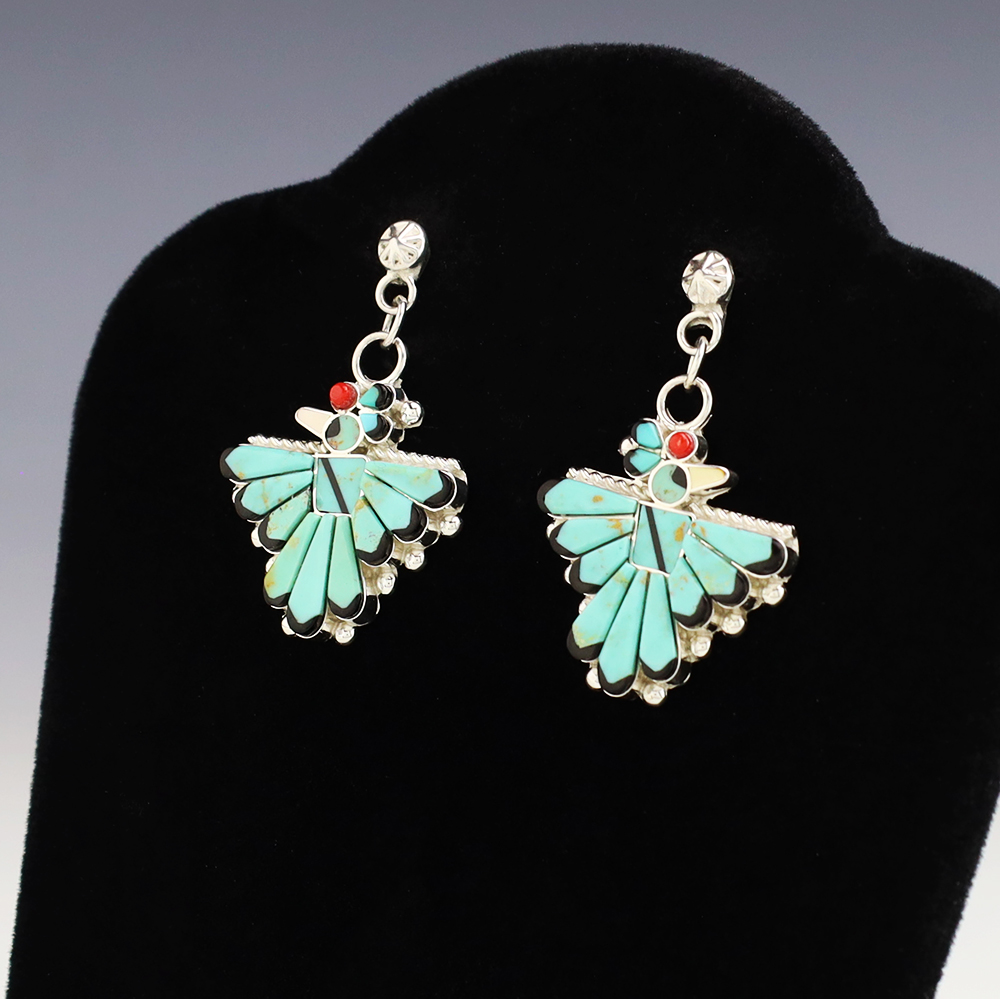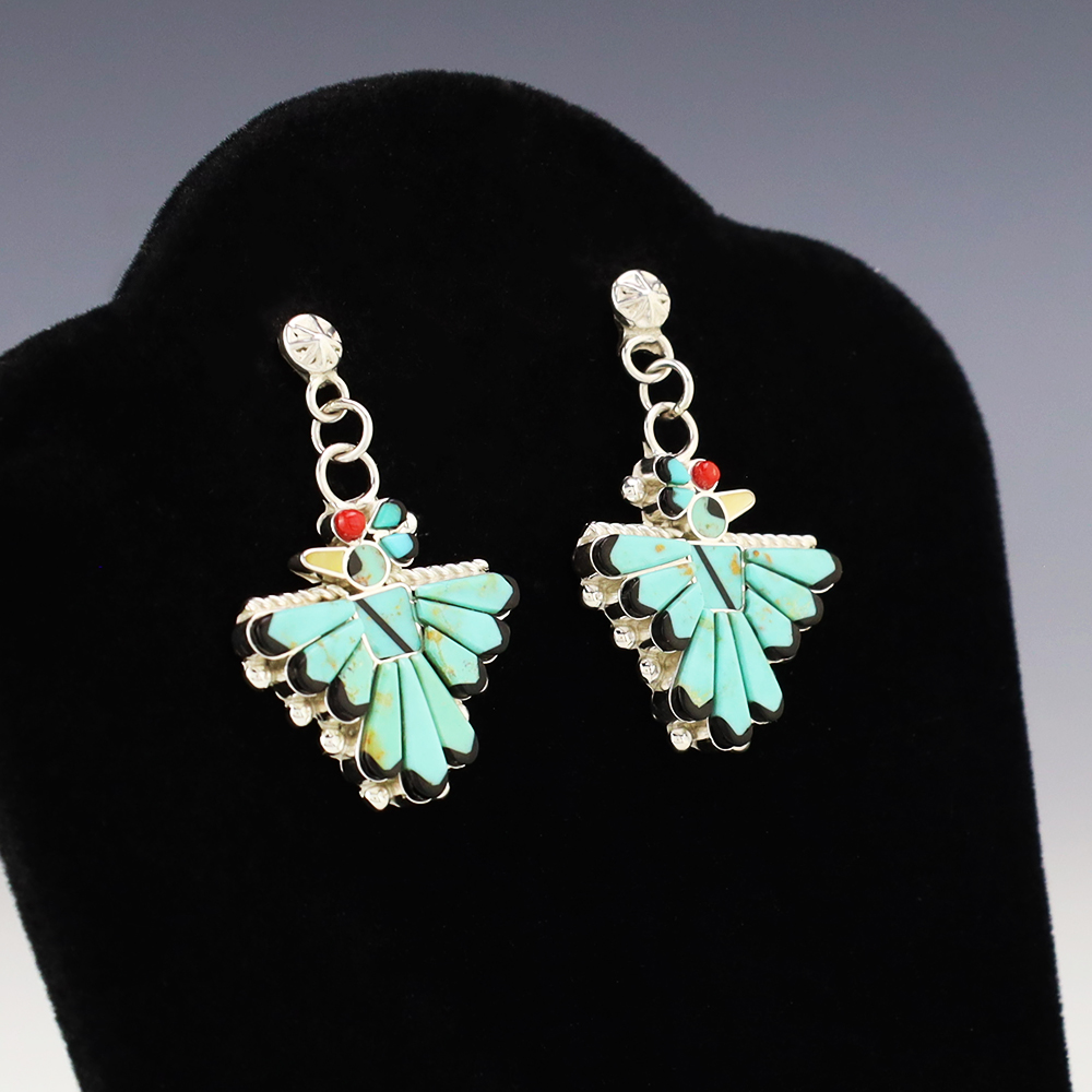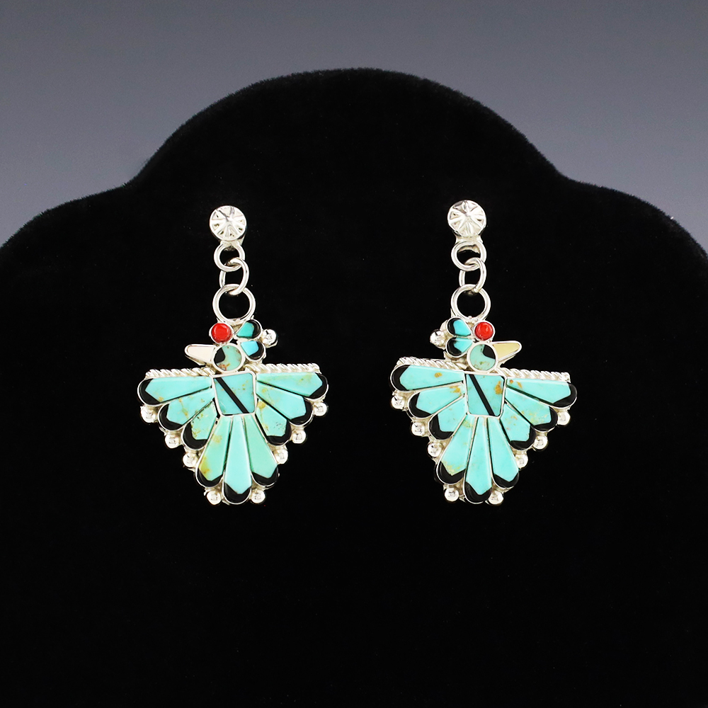 Zuni artist Michelle Peina made these fabulous Thunderbird earrings. Zuni artists are known for their fine lapidary skills. Each stone is hand cut, polished, and set into a sterling silver setting. The earrings are inlaid with Turquoise, Coral, Jet, and Mother of Pearl Shell. Weighs 8 grams. Signed