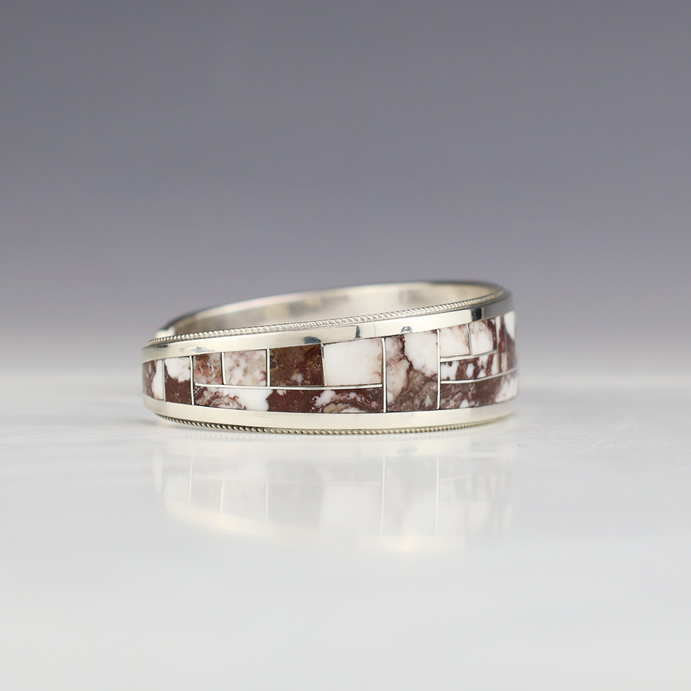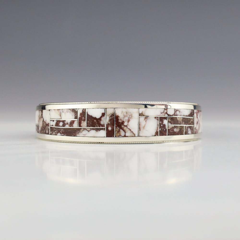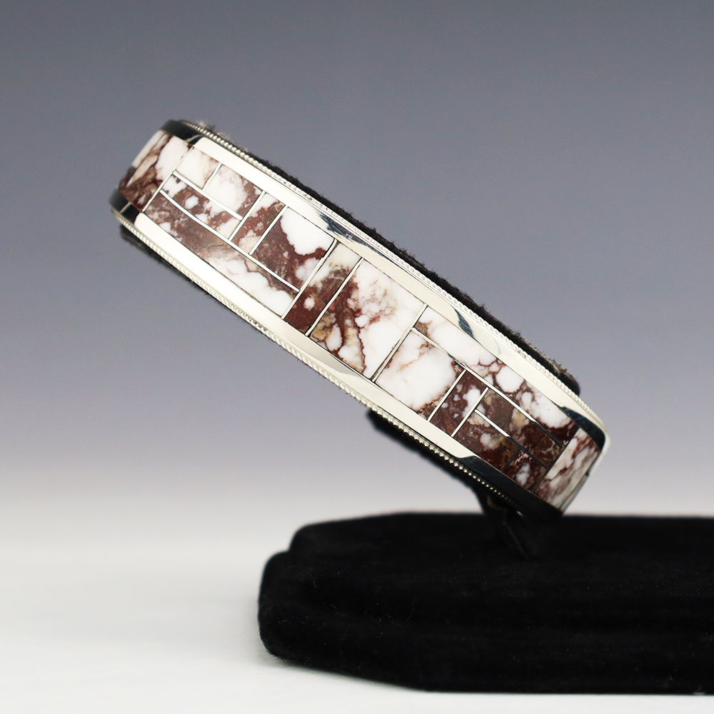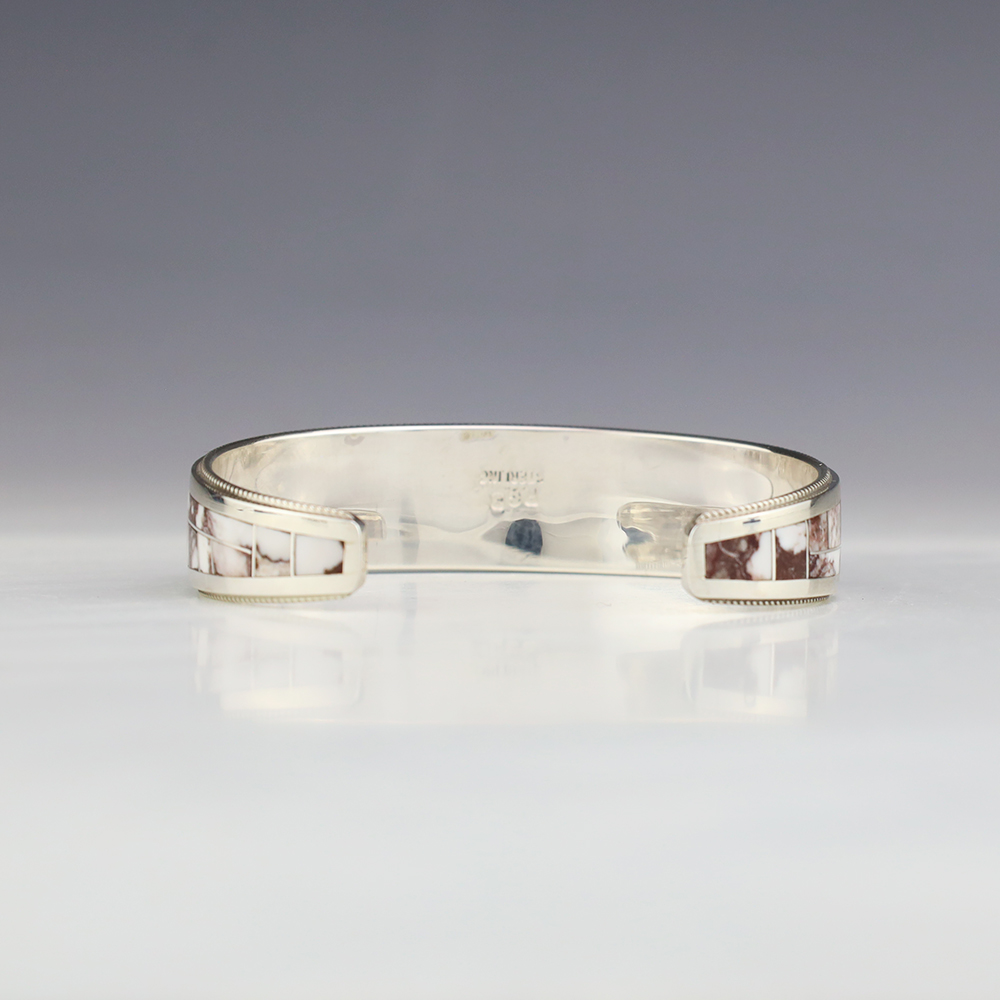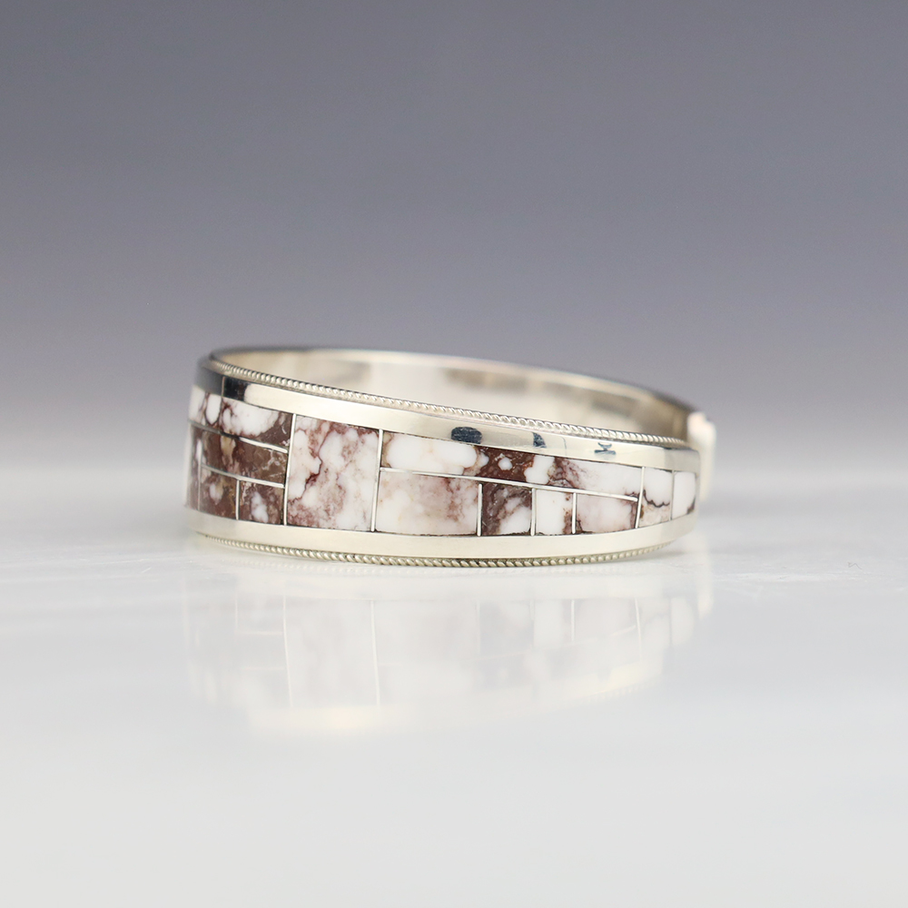 This eye-catching bracelet showcases the remarkable skill of Zuni jewelers, Rickel and Glendora Booqua. Wild Horse stones inlaid into a sterling silver setting. This beautiful bracelet will be a great addition to your Native American jewelry collection Weighs 28 grams. Signed. The entire inner circumference is about 6 3/4”, including 1 1/4” opening. (Fits a 6 3/4″ wrist). (This bracelet cannot be bent to fit your wrist.)