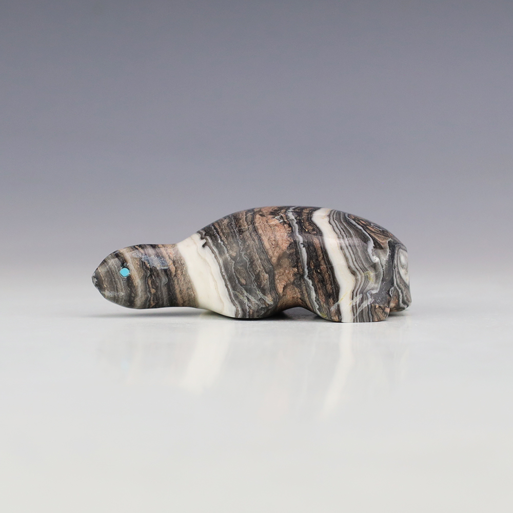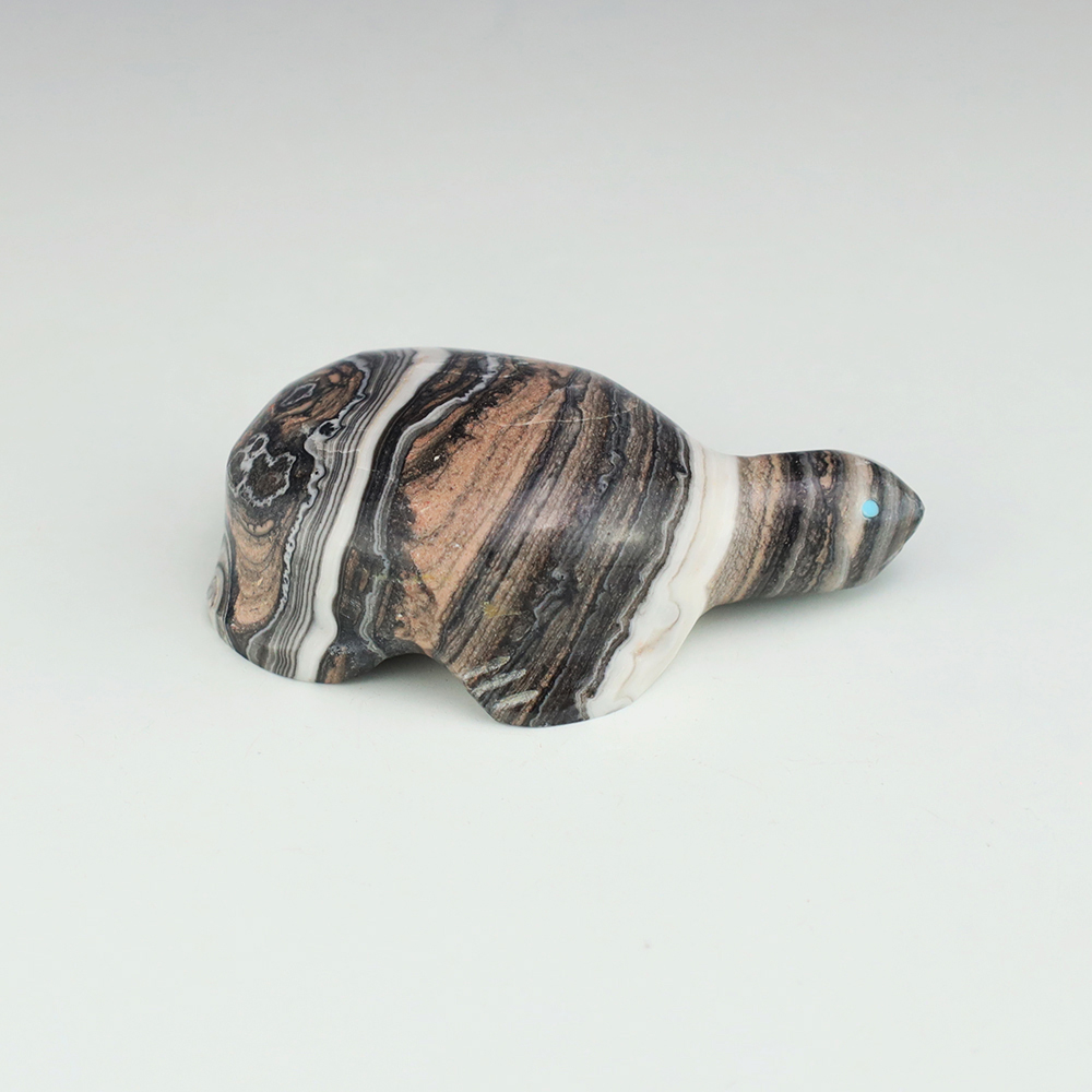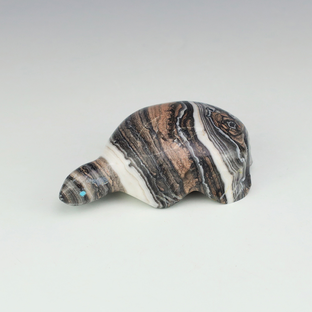 Zuni fetish artists Leland Boone and Daphne Quam made this wonderful Turtle. Hand carved out of Zebra Calcite. Zuni turtle fetishes are one of the oldest symbols of Mother Earth and they symbolize longevity. A great addition to your Native American or Zuni fetish collection. (note-there is natural fracturing in the stone)