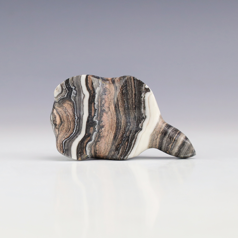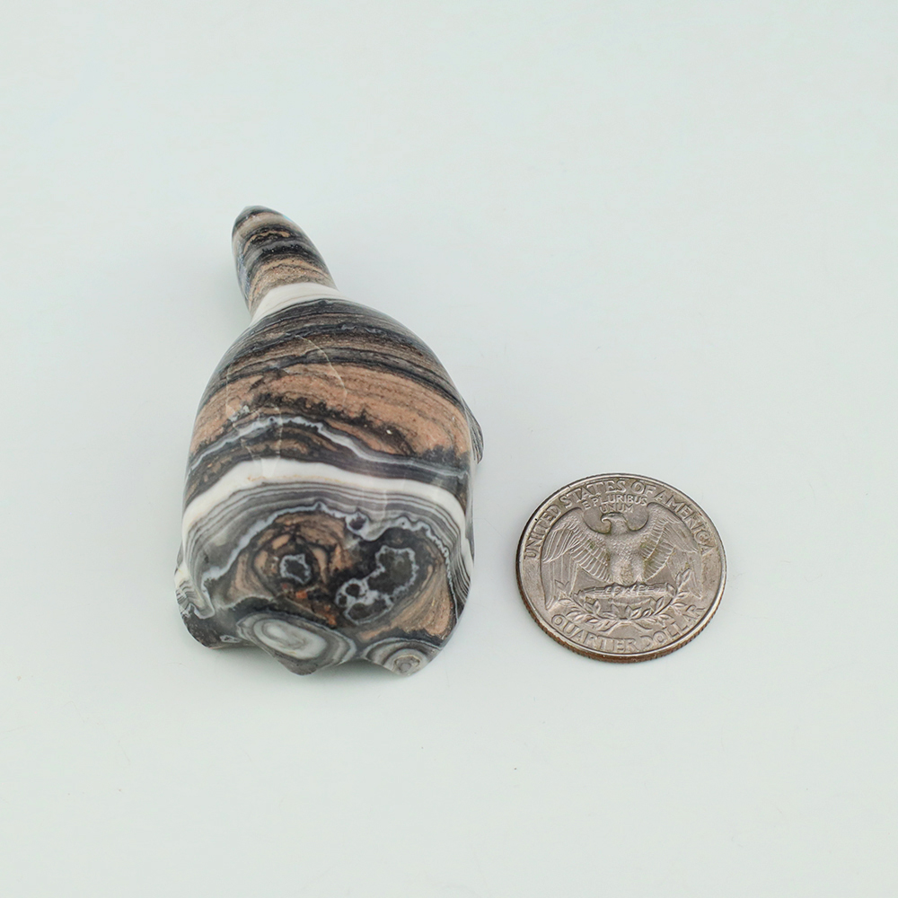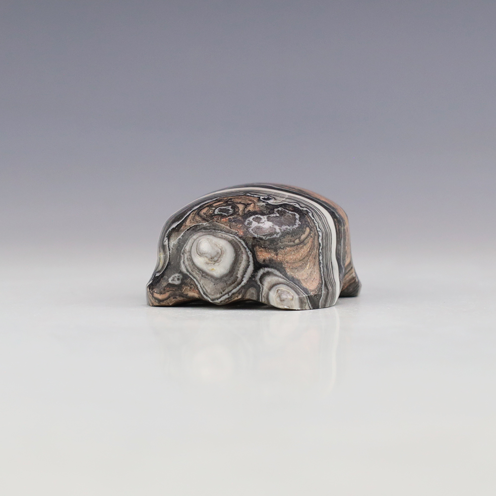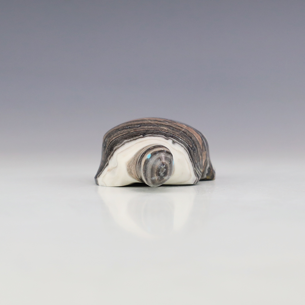 Zuni fetish artists Leland Boone and Daphne Quam made this wonderful Turtle. Hand carved out of Zebra Calcite. Zuni turtle fetishes are one of the oldest symbols of Mother Earth and they symbolize longevity. A great addition to your Native American or Zuni fetish collection. (note-there is natural fracturing in the stone)