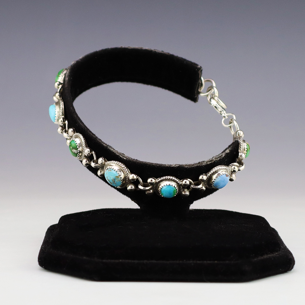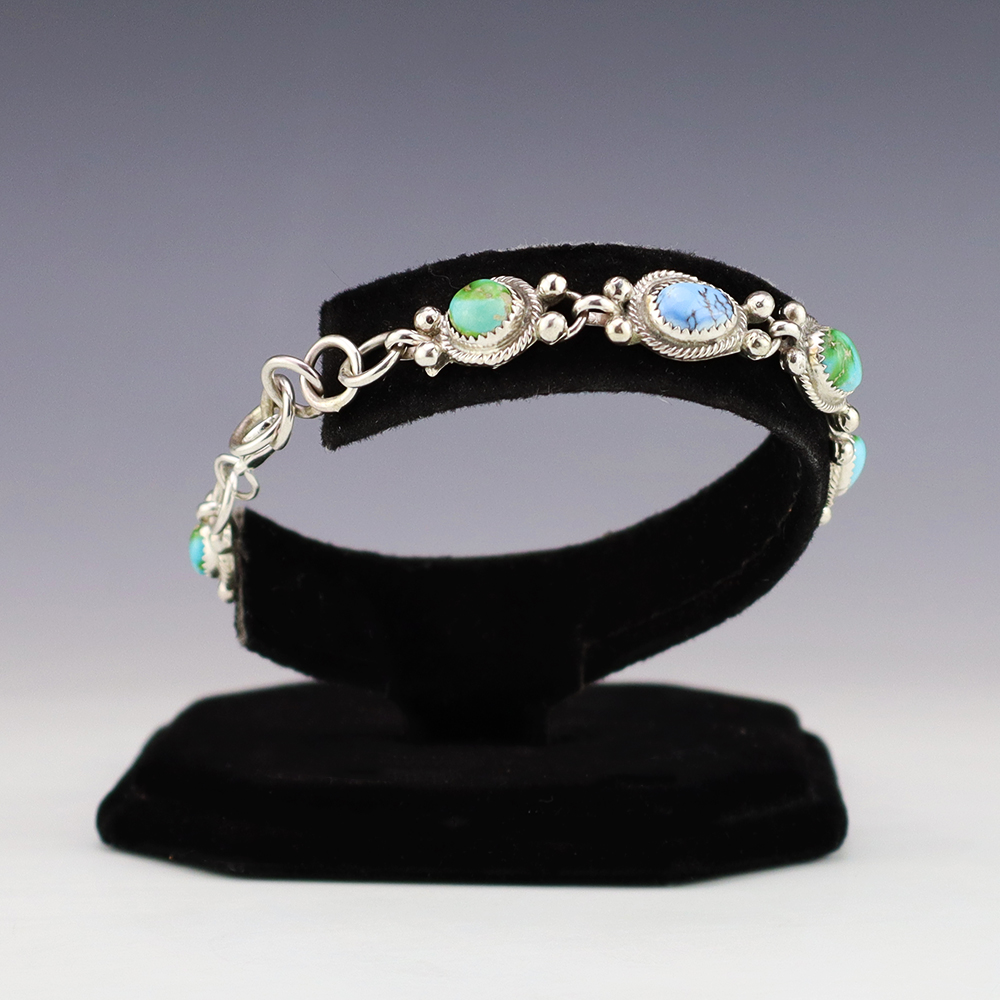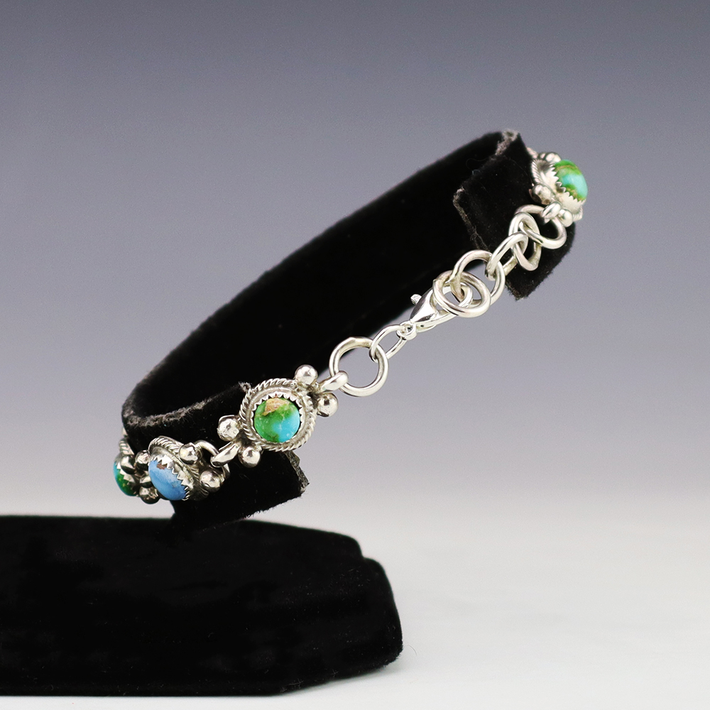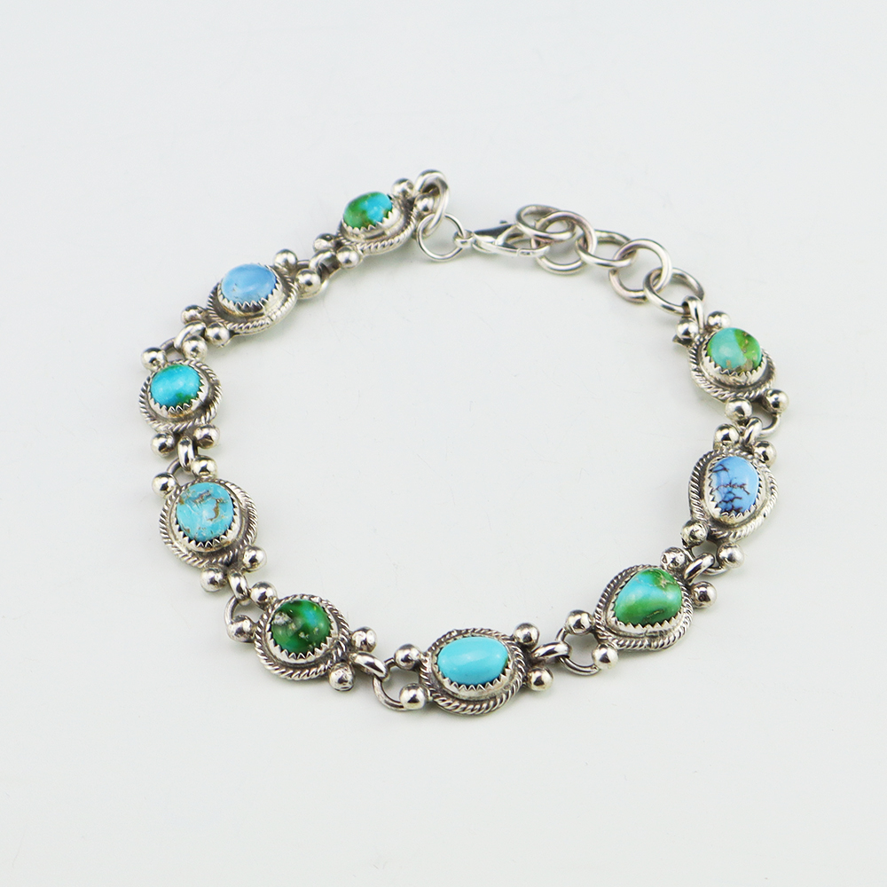 The Navajos began working with silver in the 19th century, and began making things like buckles, bridles, buttons, rings, canteens, hollow beads, earrings, crescent-shaped pendants (called “najas”), bracelets, crosses, powder chargers, tobacco canteens, and conchos (for belts). Their silversmithing skills has evolved and changed throughout the years, and in about 1880 Navajo silversmiths started to set turquoise in their silver work. Traditionally, Navajo artists worked with jewelry techniques like repousee and stamp work, but today they explored in other Native American jewelry making techniques like Zuni inlay work and Hopi overlay work
