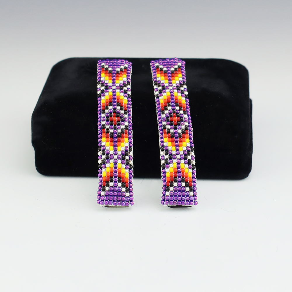Navajo artist Geri Hatathli hand beaded these stellar earrings. Great pattern! With ear wires are 3” in length. 7/8″ x 2 1/2″ When trade beads were introduced to Native Americans, they made these colorful glass beads part of their jewelry. Over the years, glass beads have been used to complement...