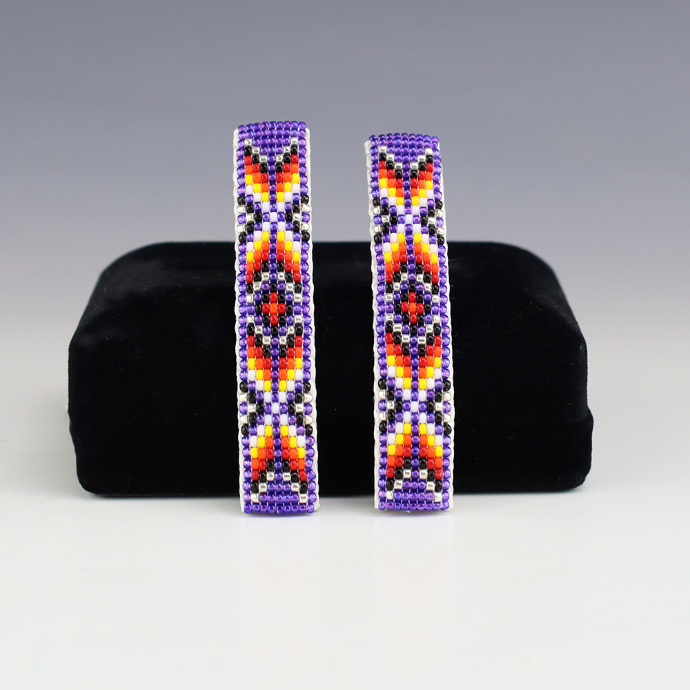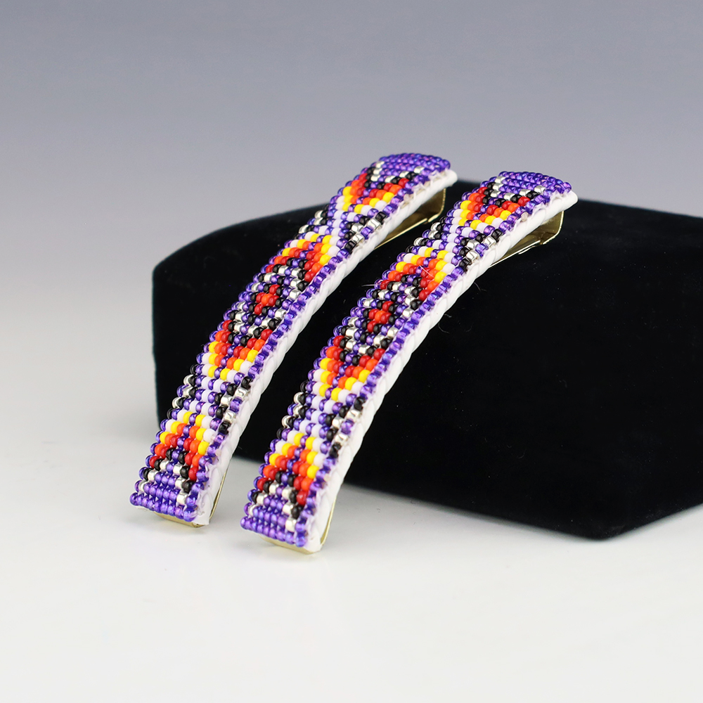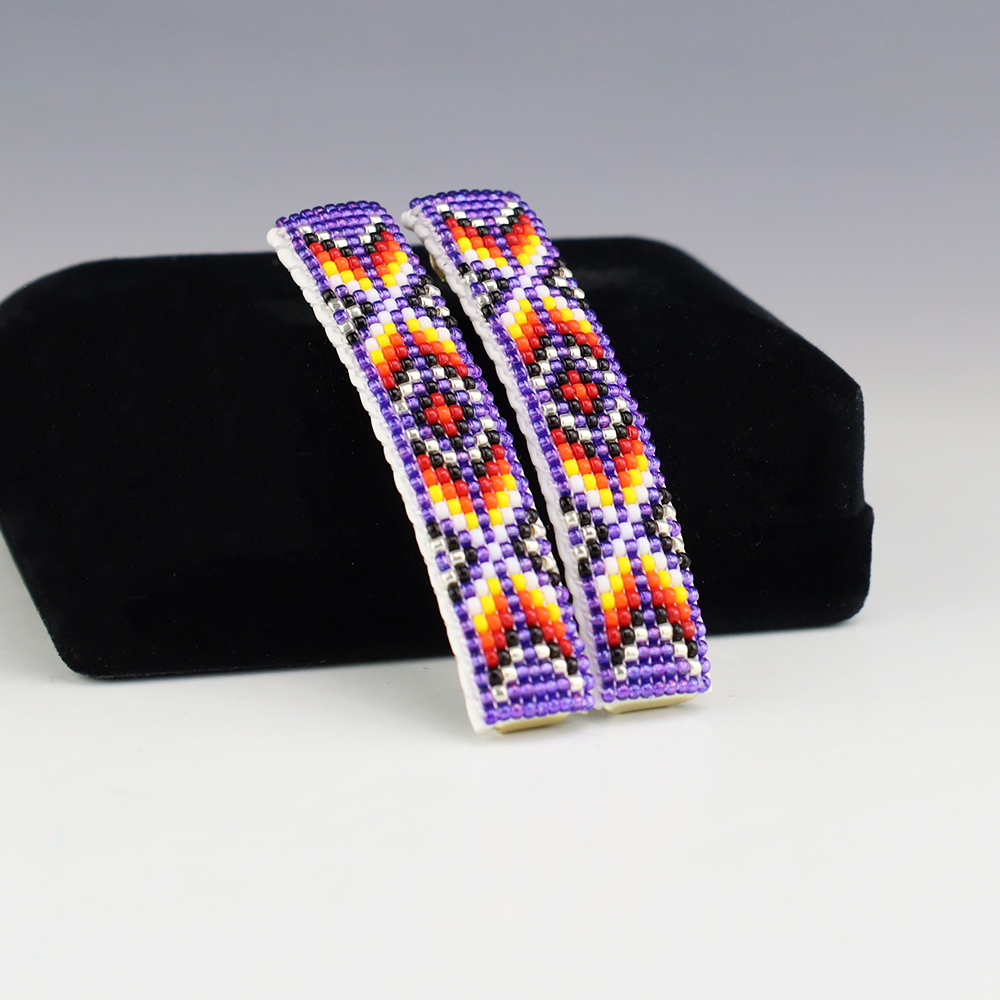 Navajo artist Sharon Hunt hand beaded these beautiful barrettes. Great colors that compliment the design. Sharon uses tiny seed beads to create his jewelry and backs it with soft leather.