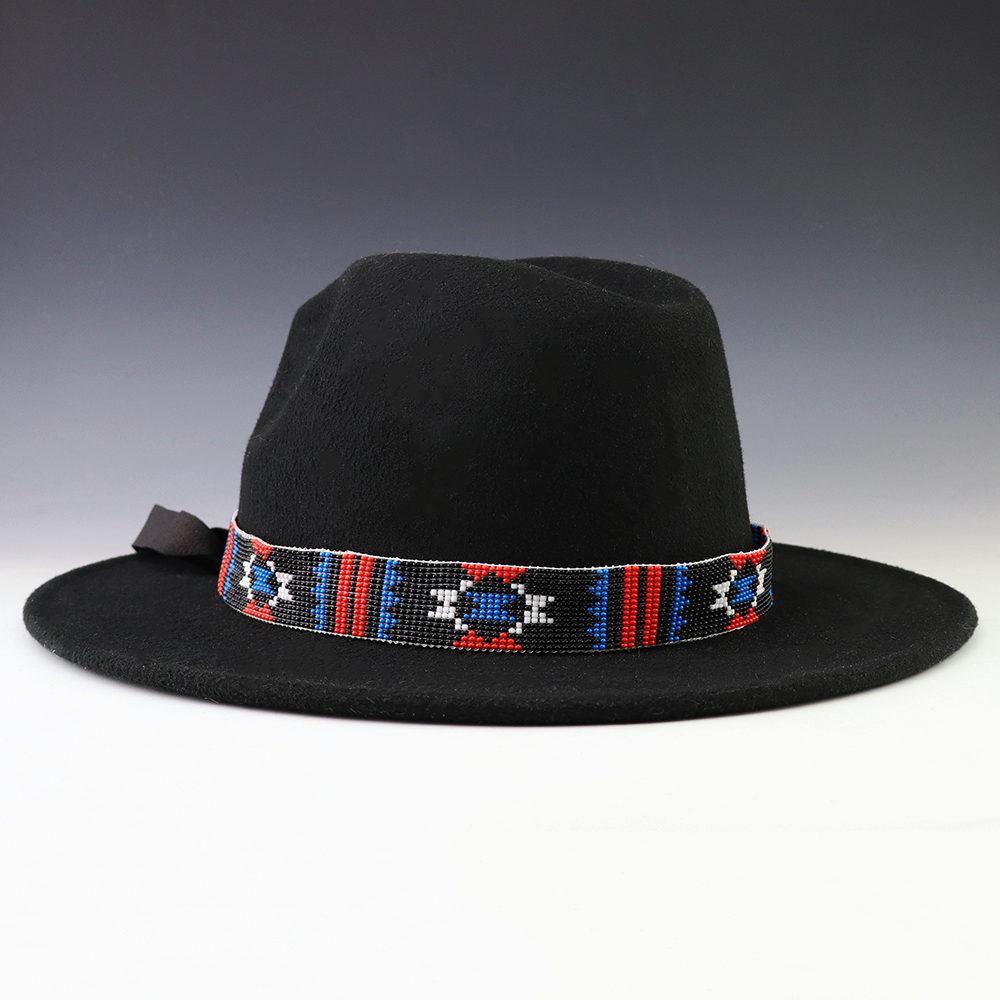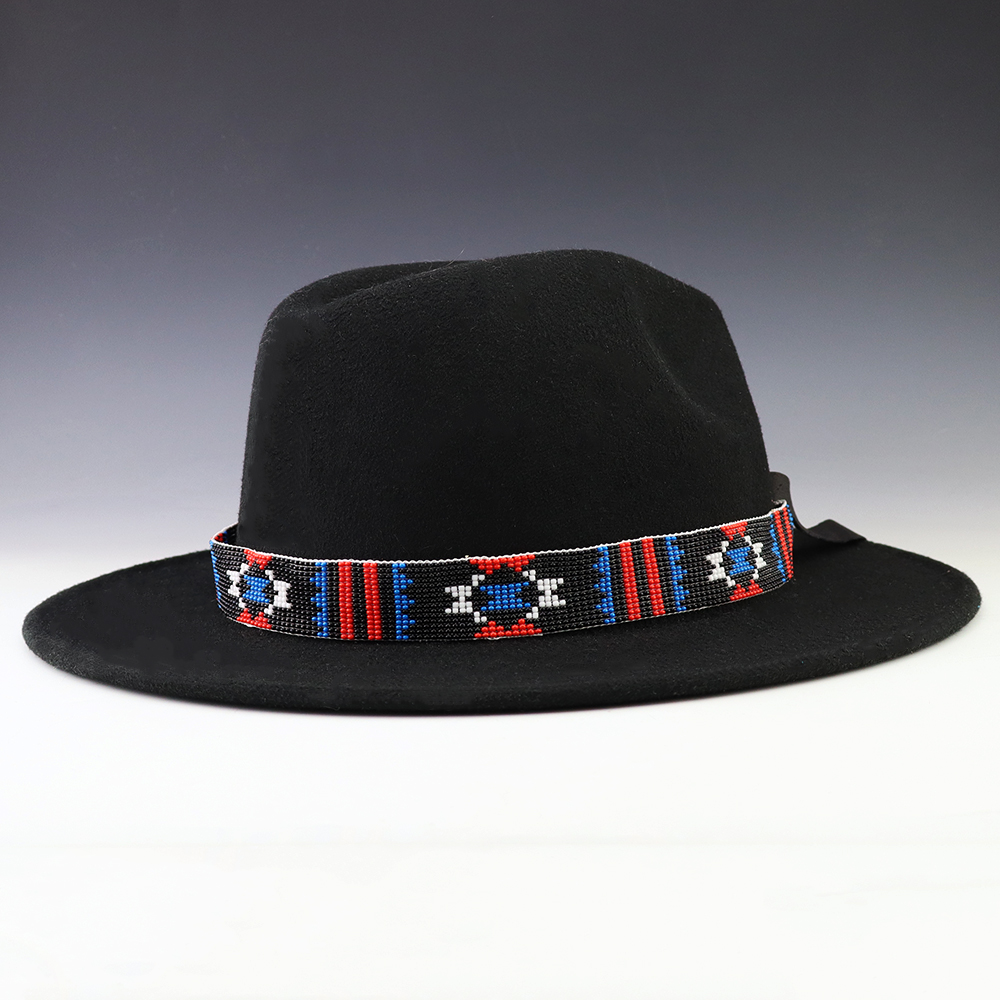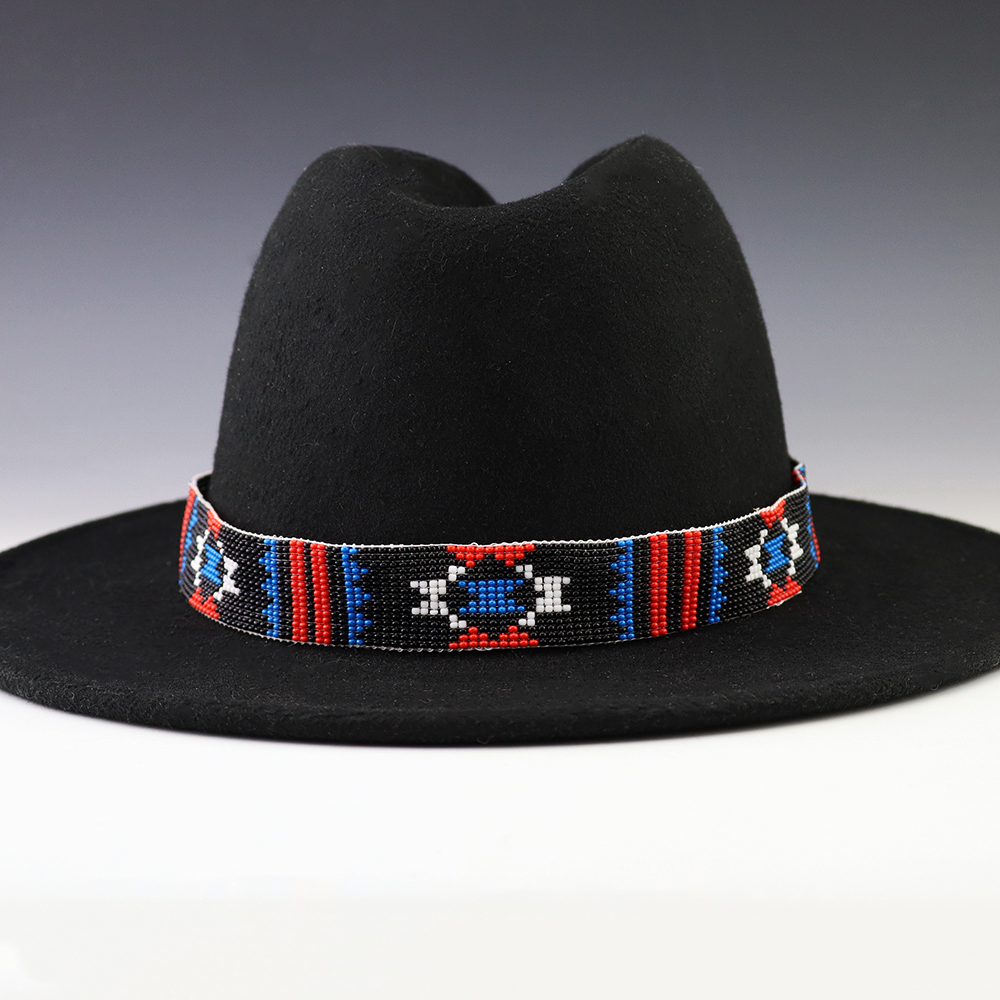 Great colors and patterns in this hand made beaded hat band. Tiny seed beads are used and with soft leather on the ends. Hand made by Navajo artist, Charlene Jackson.