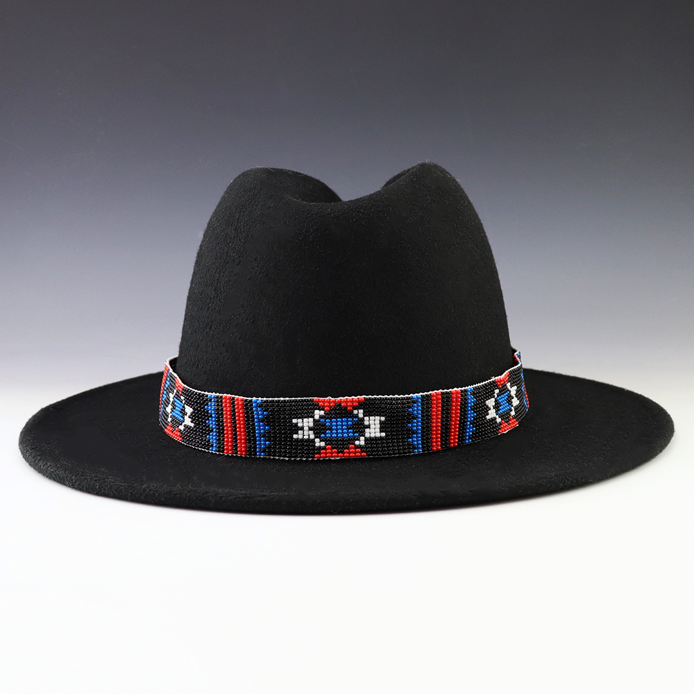 Great colors and patterns in this hand made beaded hat band. Tiny seed beads are used and with soft leather on the ends. Hand made by Navajo artist, Charlene Jackson.