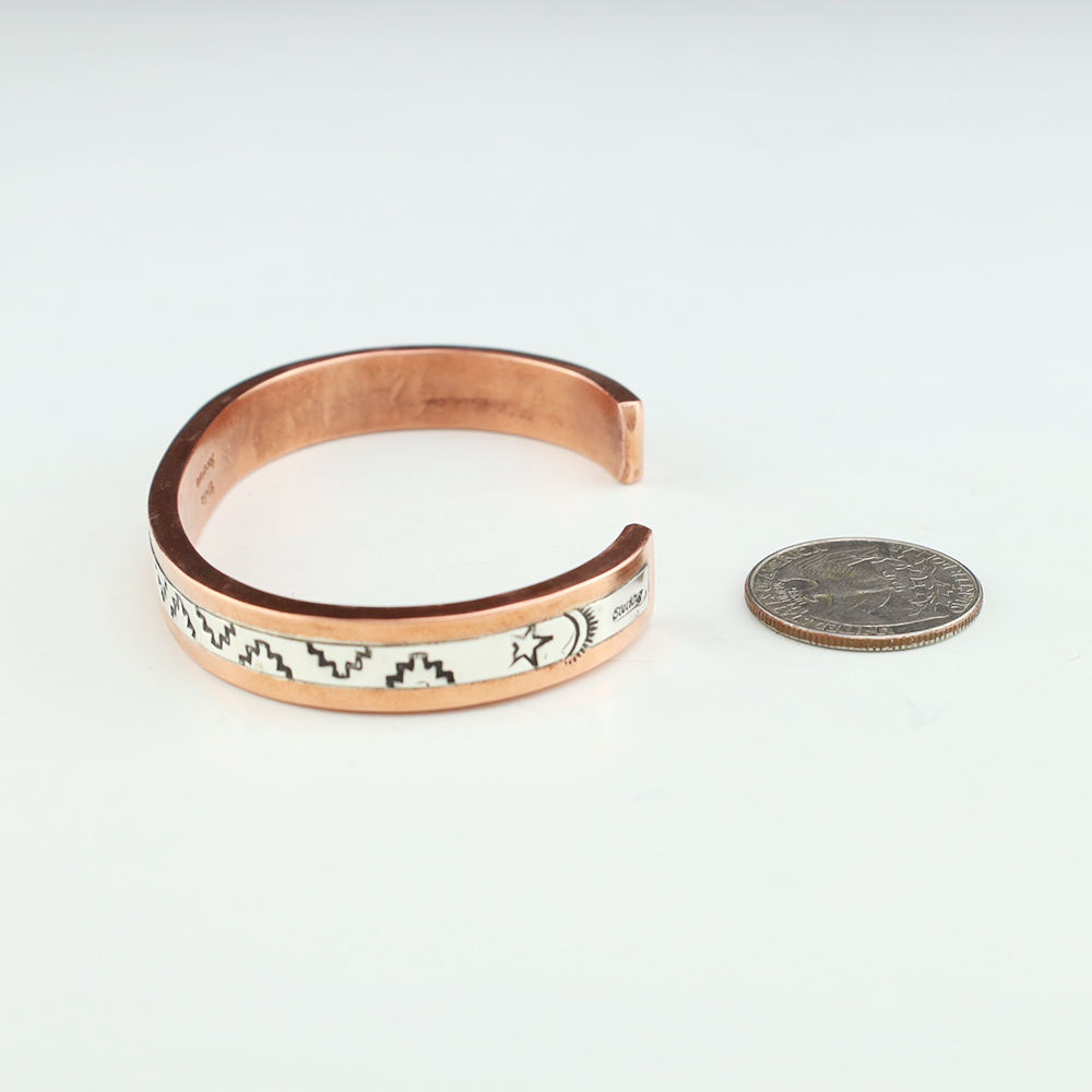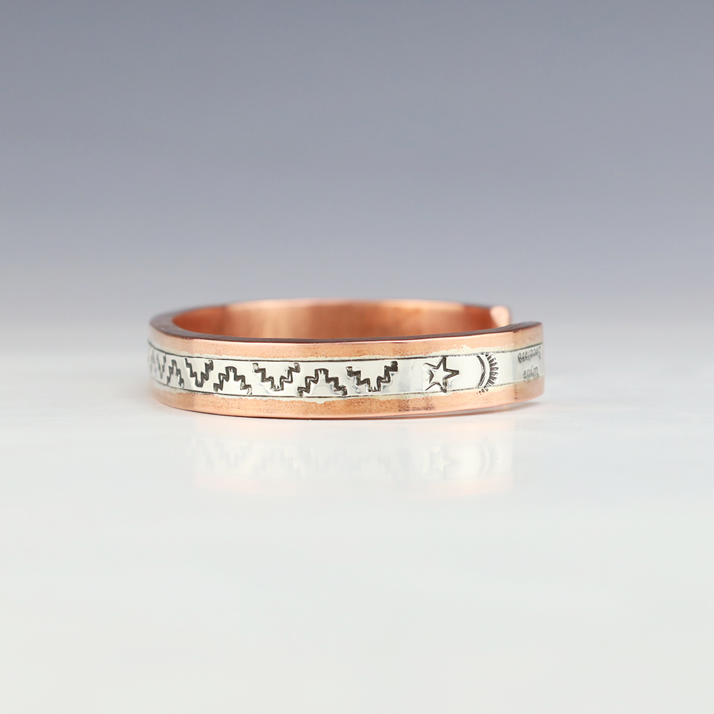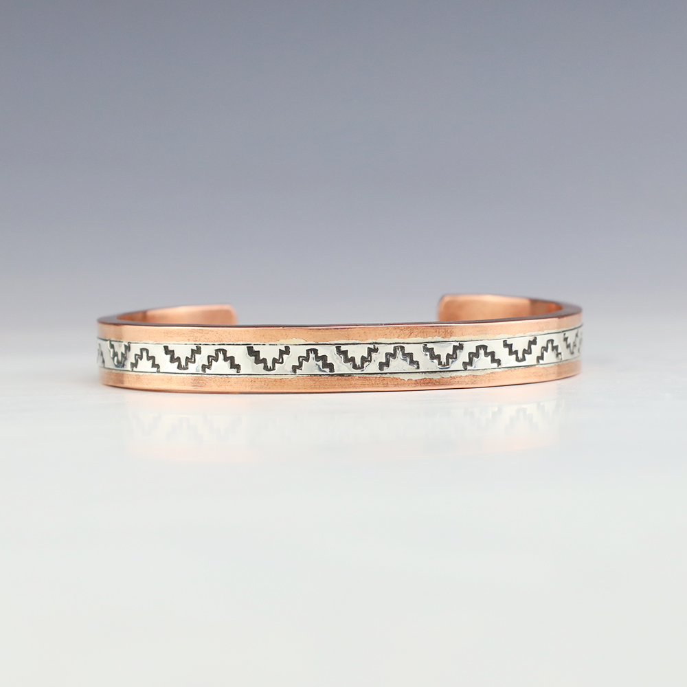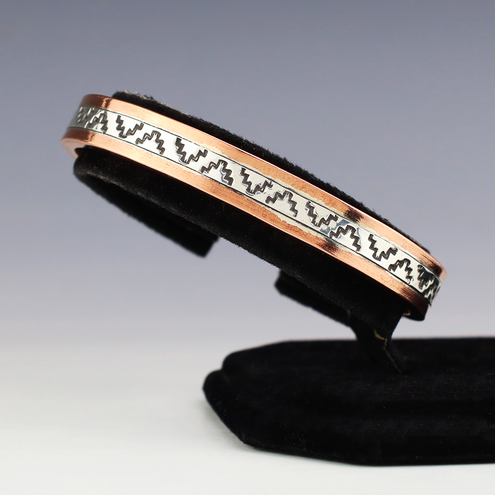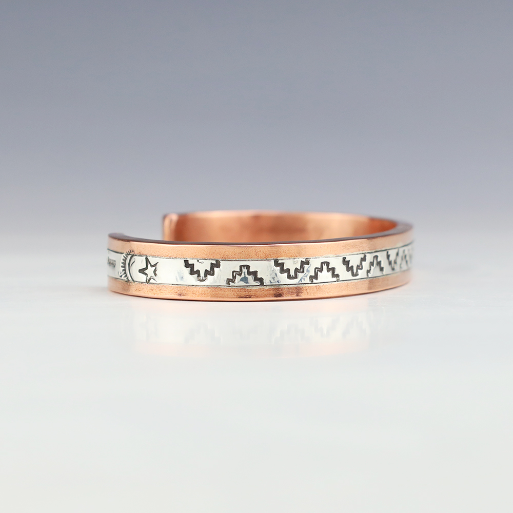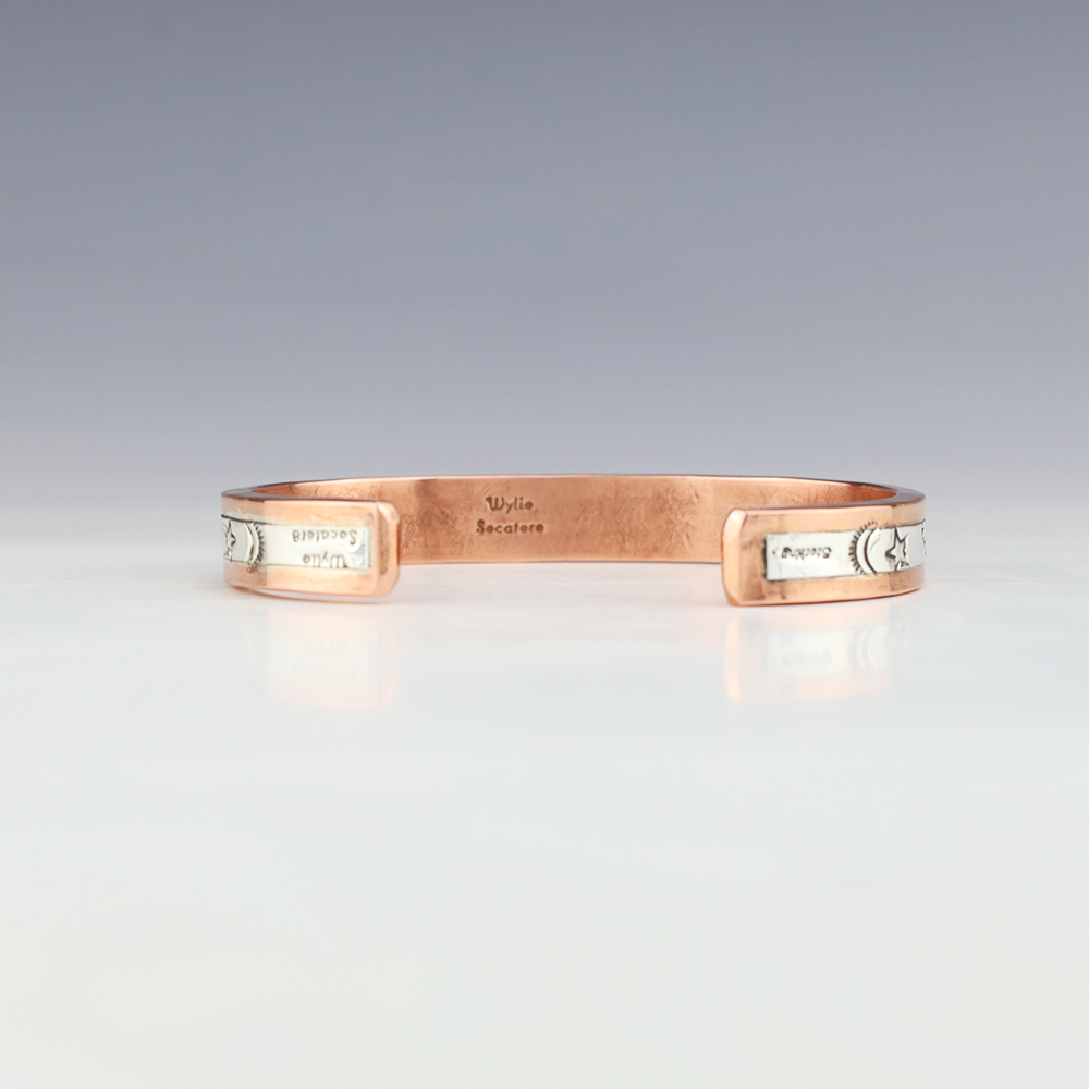 Navajo artist Wylie Secatero made this marvelous bracelet. Sterling silver and Copper with a traditional hand stamped design. Weighs 44 grams. The entire inner circumference is about 7 1/4”, including 1 3/16” opening. (Fits a 7 1/4″ wrist). Signed