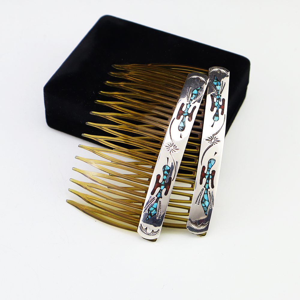 Great stamp work! Lovely combs made out of sterling silver with Coral and Turquoise chip inlay by Navajo artist Jolene Yazzie. Great representation of Navajo silver work. Weighs 14 grams.
