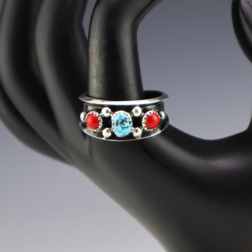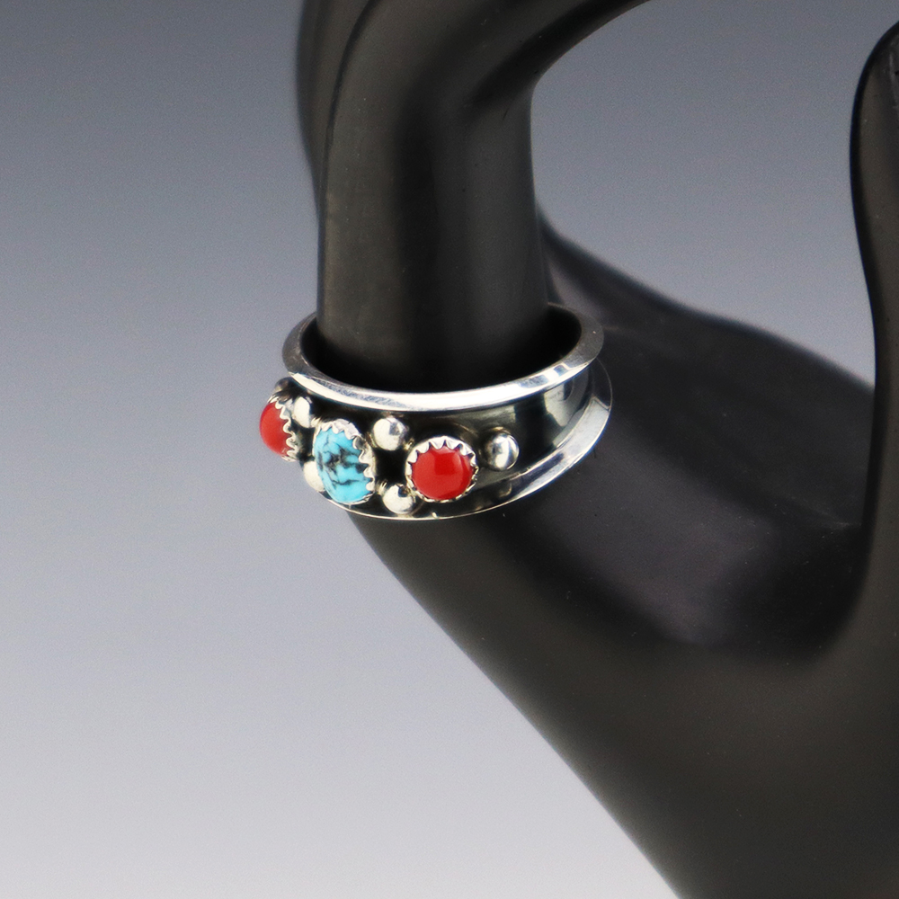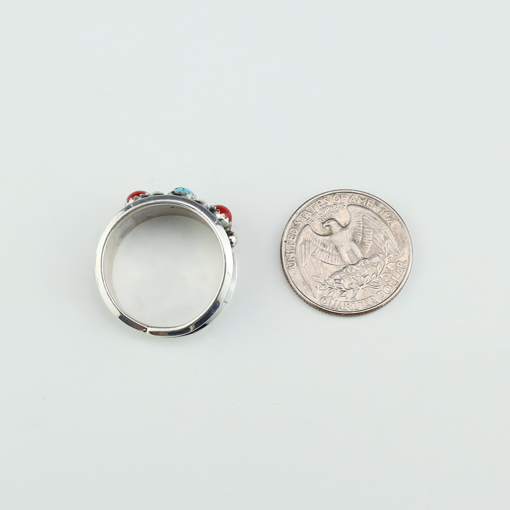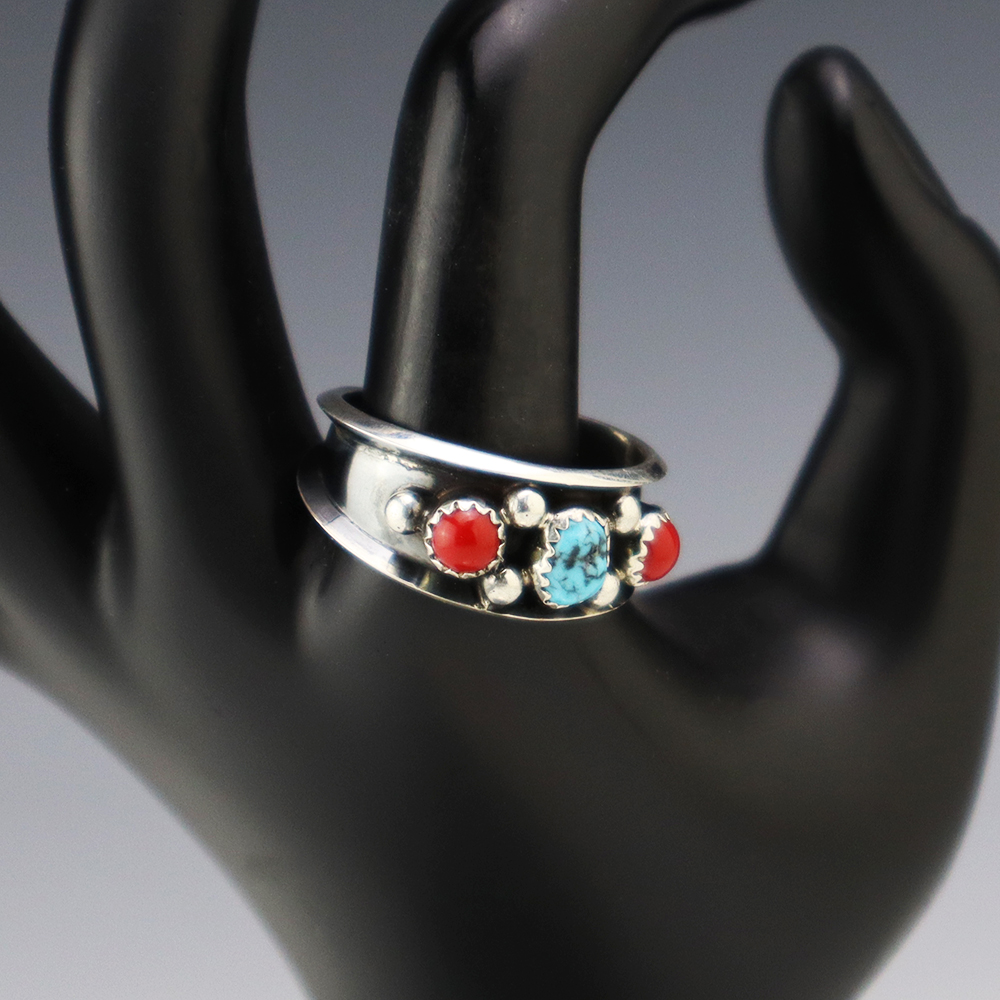 This ring is a great representation of hand made Navajo jewelry and will make a statement on your hand. Beautiful pieces of Turquoise and Coral are set into a sterling silver setting. Hand made by Navajo artist Paul Largo. Weighs 6 grams. Size 12.