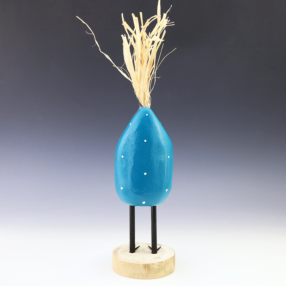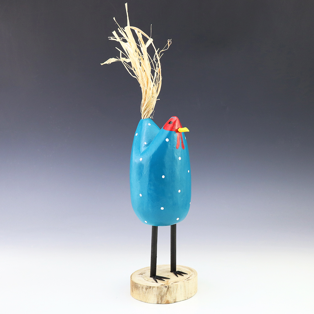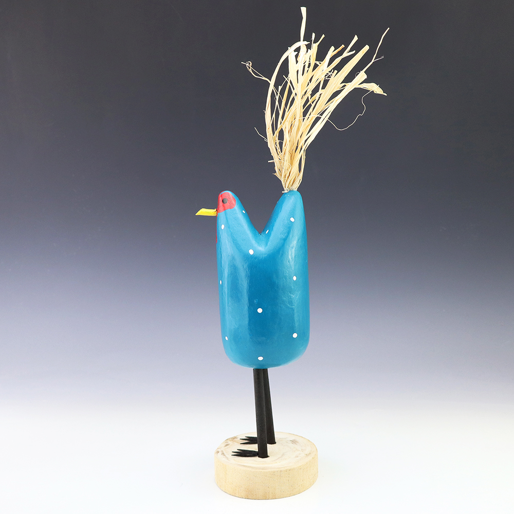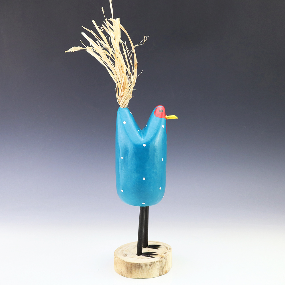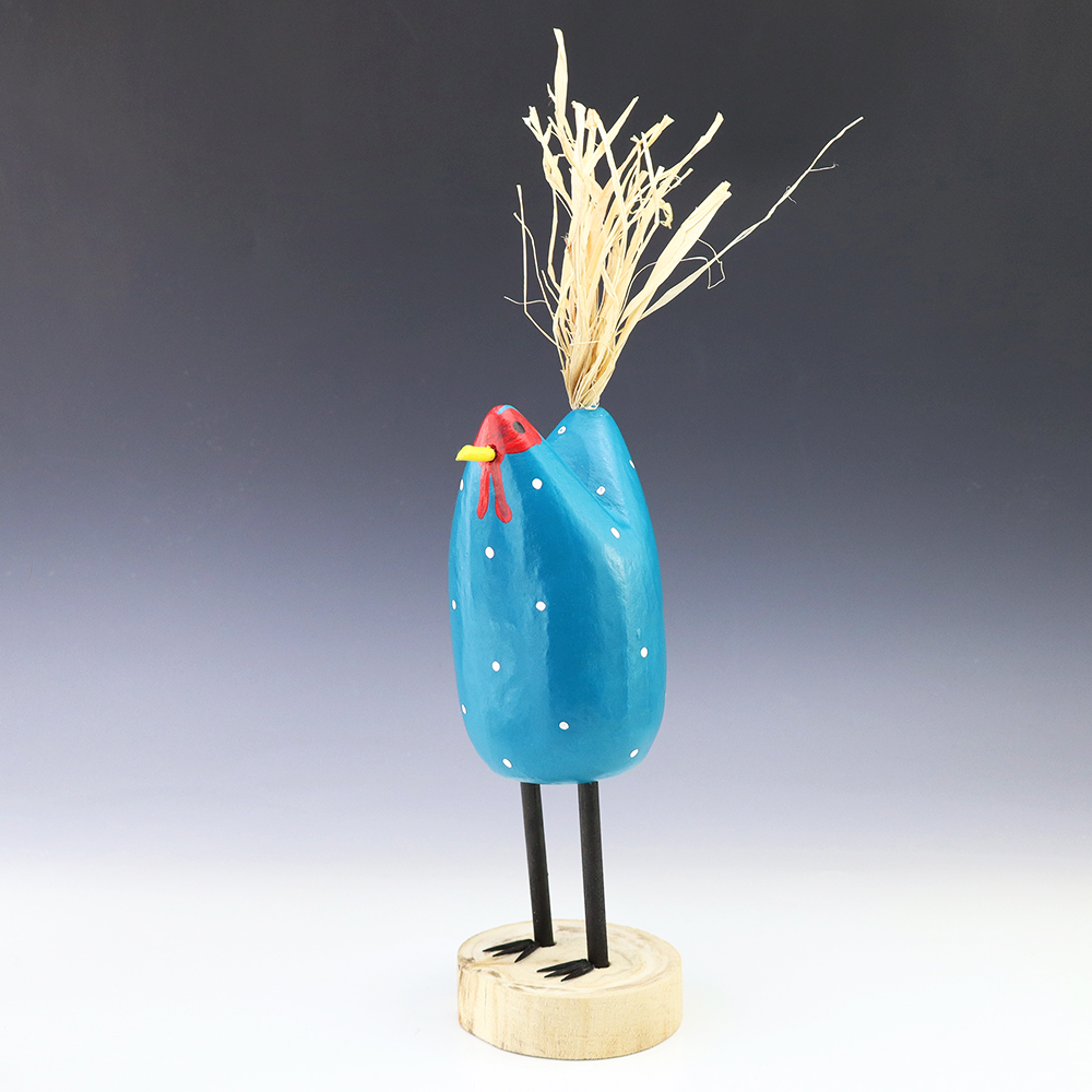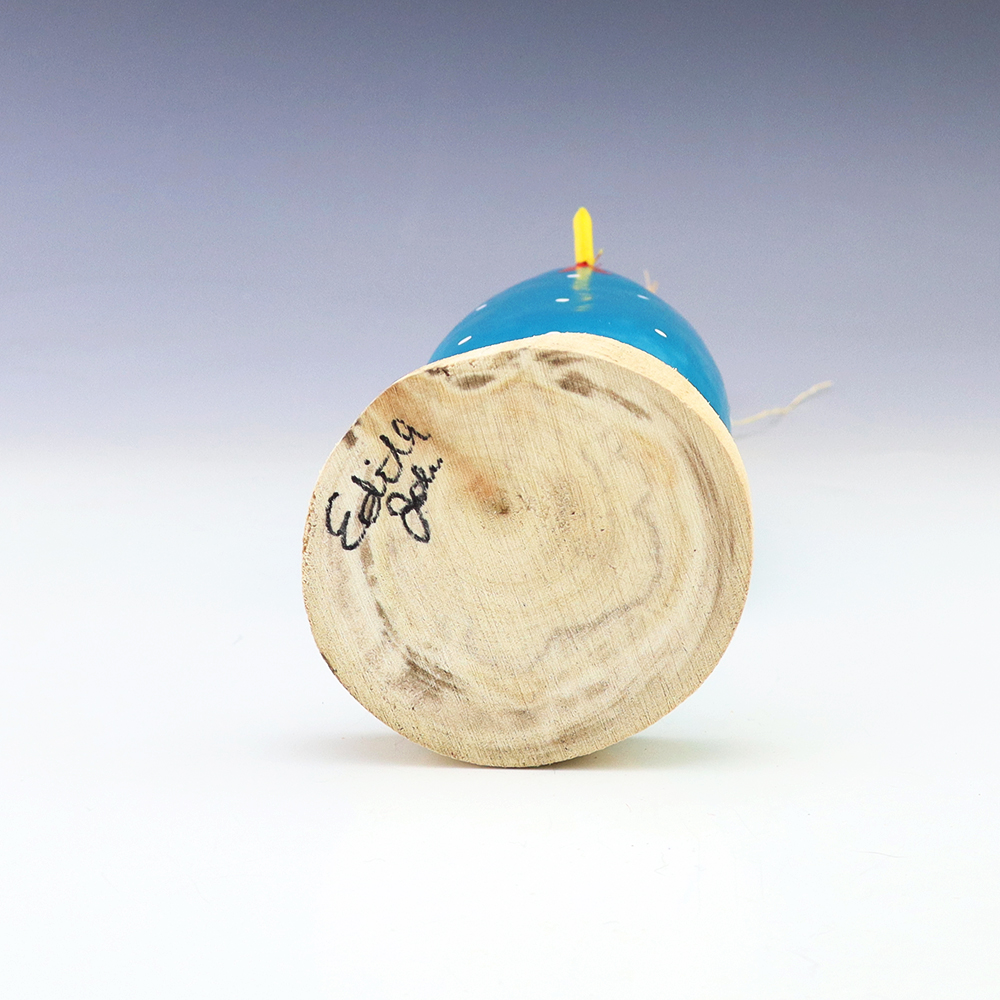 Edith John is the daughter of the late Woody Herbert who was known for his folk art Brahma bulls. Edith started carving while helping her father. Edith’s folk art chickens elicit happiness wherever they roost! Bold colors and patterns, that will brighten your Navajo folk art collection. Hand carved out of wood with a straw tail. Signed