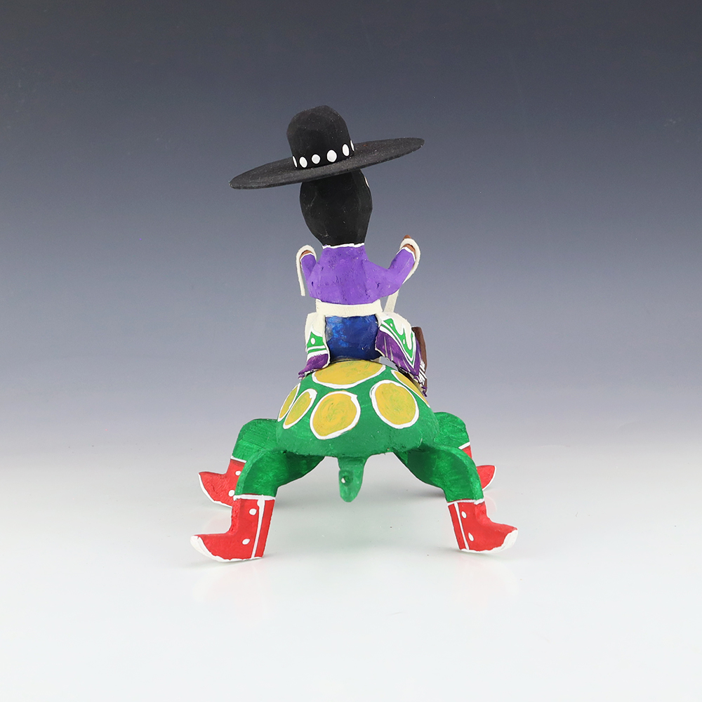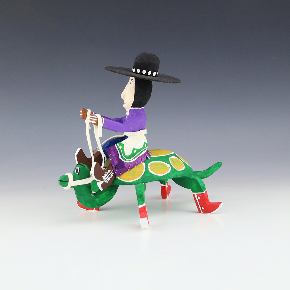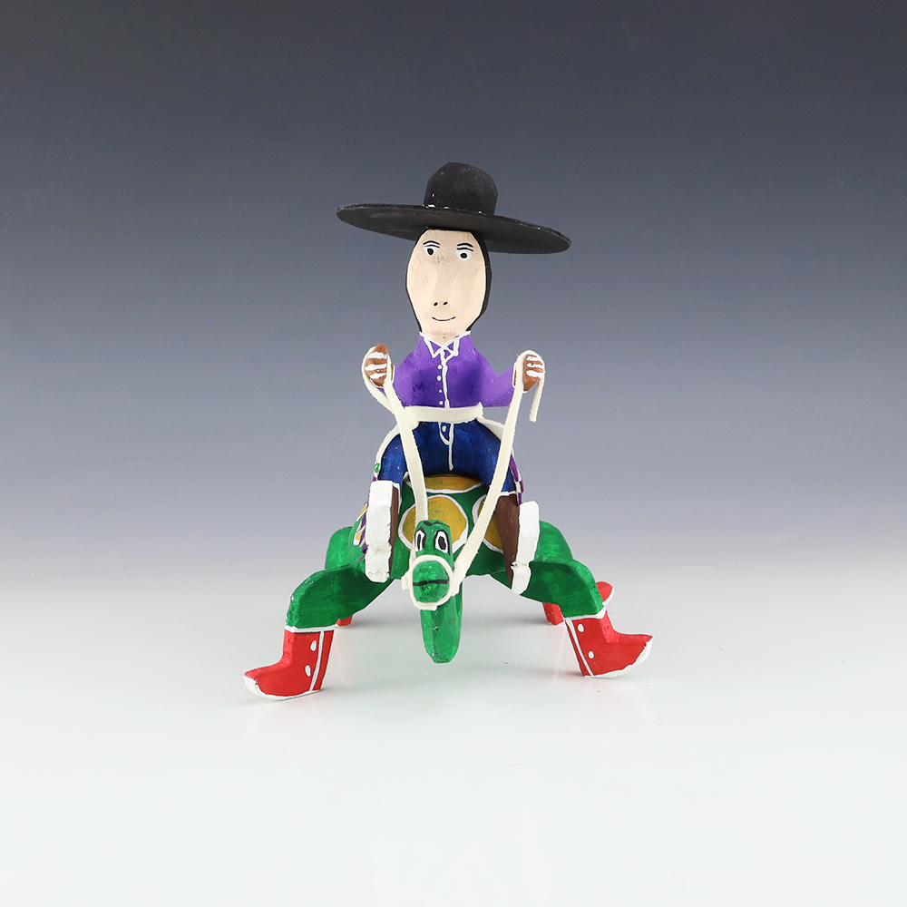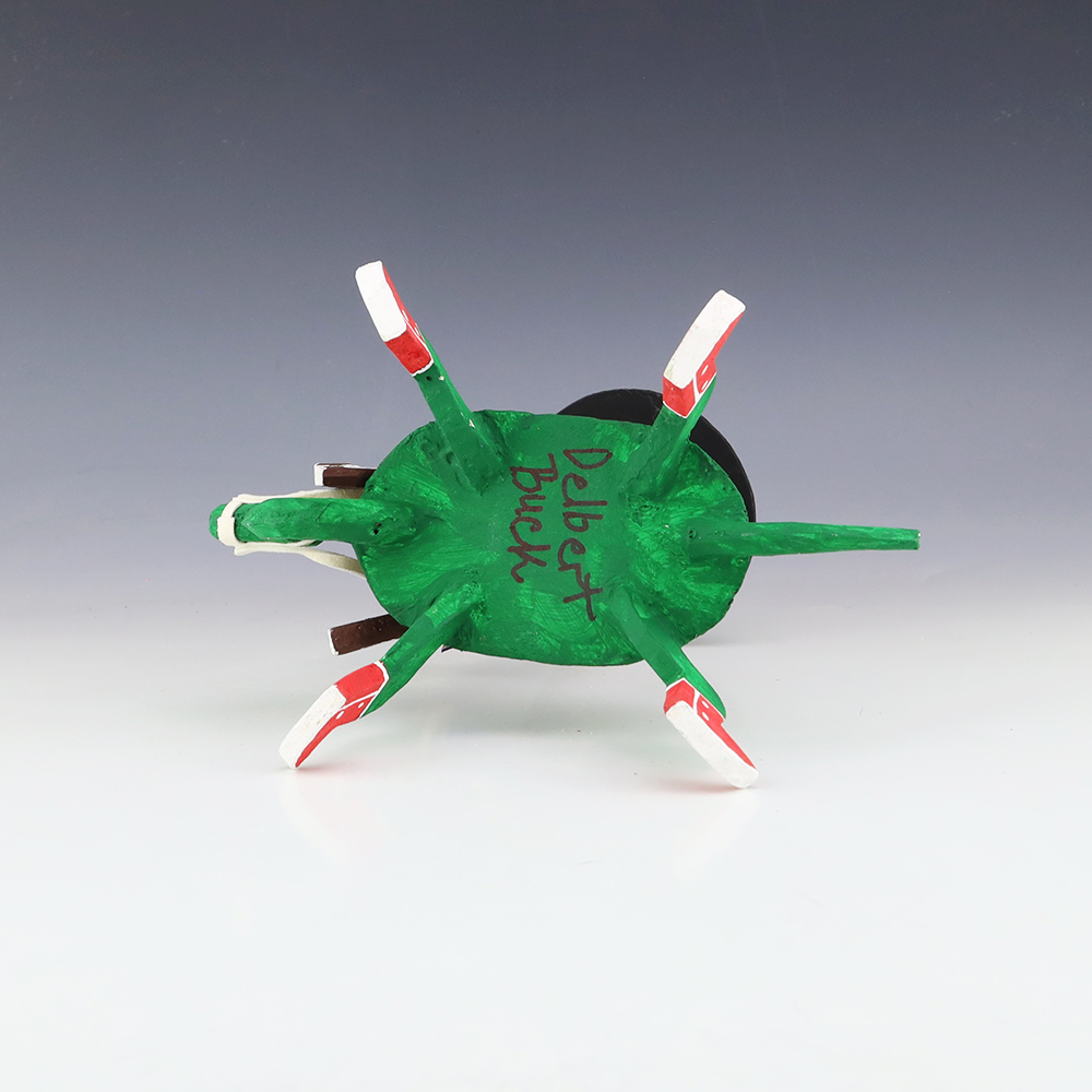 Whimsical folk art by Navajo artist Delbert Buck. Fabulous colors and designs throughout the piece. Delbert started to make folk art in 1988, when he just 12 years old. He uses cottonwood and found objects, such as wool, paper, yarn, and fabric to create his whimsical pieces. His folk art is inspired by the ordinary aspects of daily life infused with humor. From sheep driving cars to bucking broncos, Delbert’s folk art brings joy to the collector and his art will be a great addition to any Native American or Navajo folk art collection. Signed