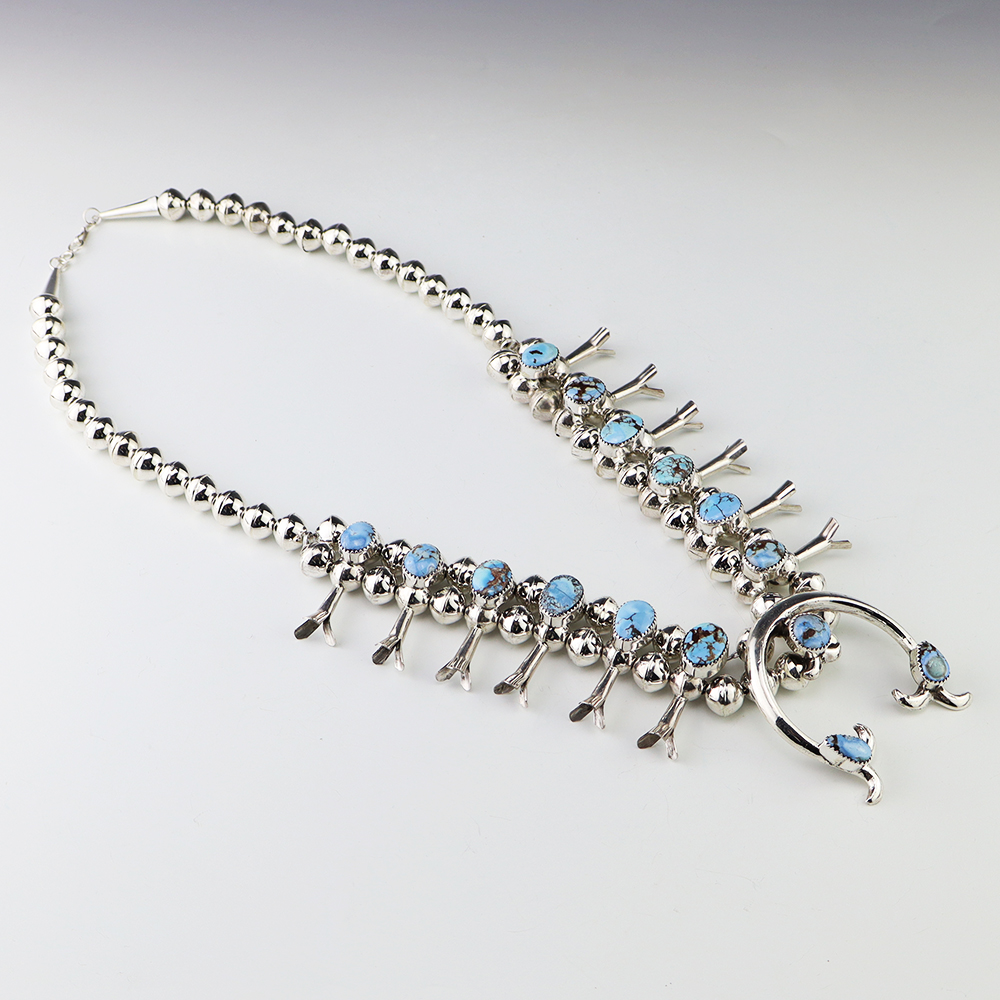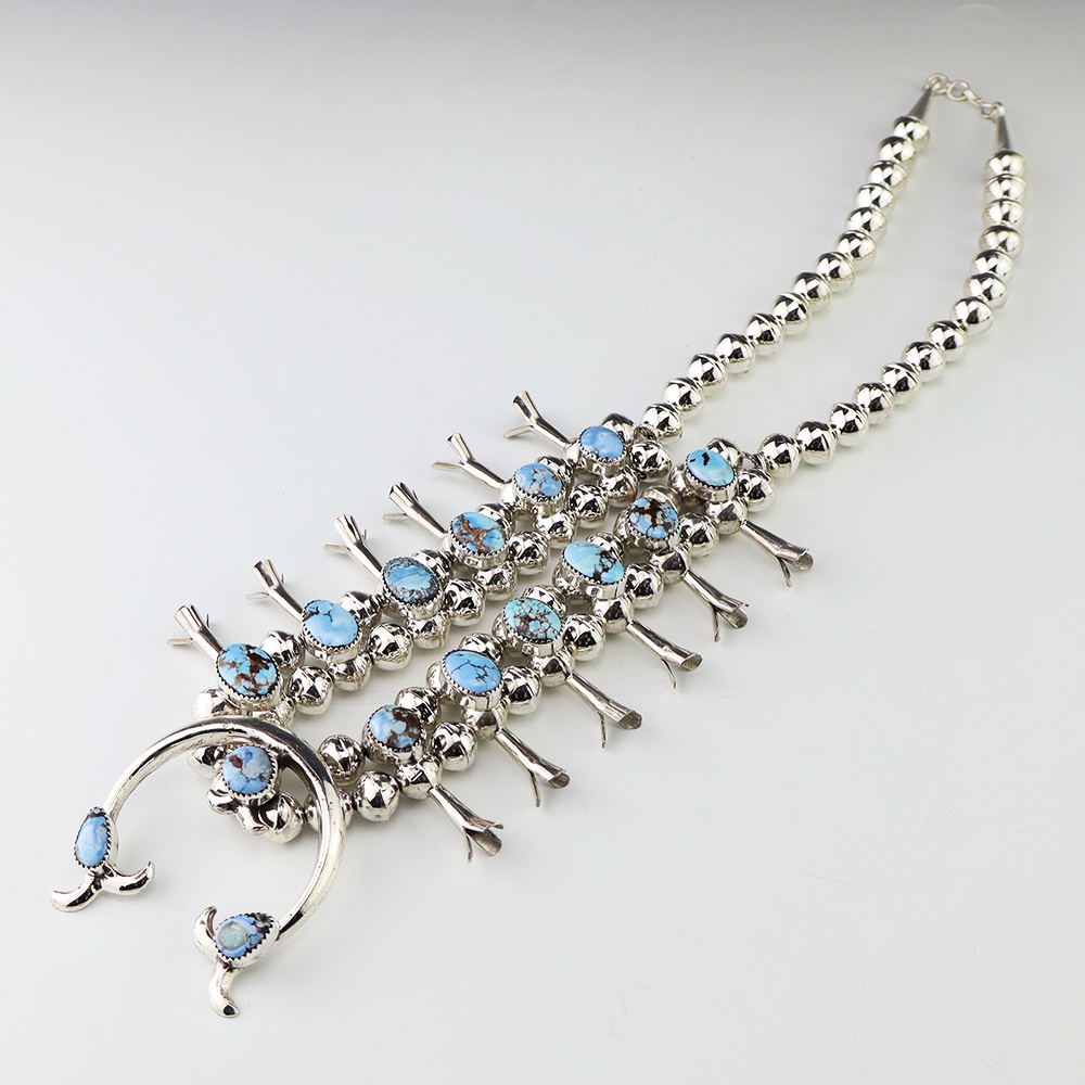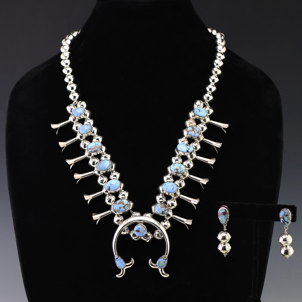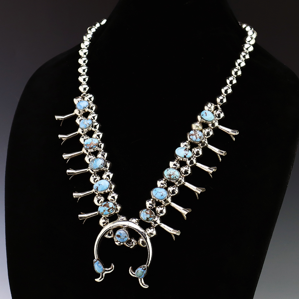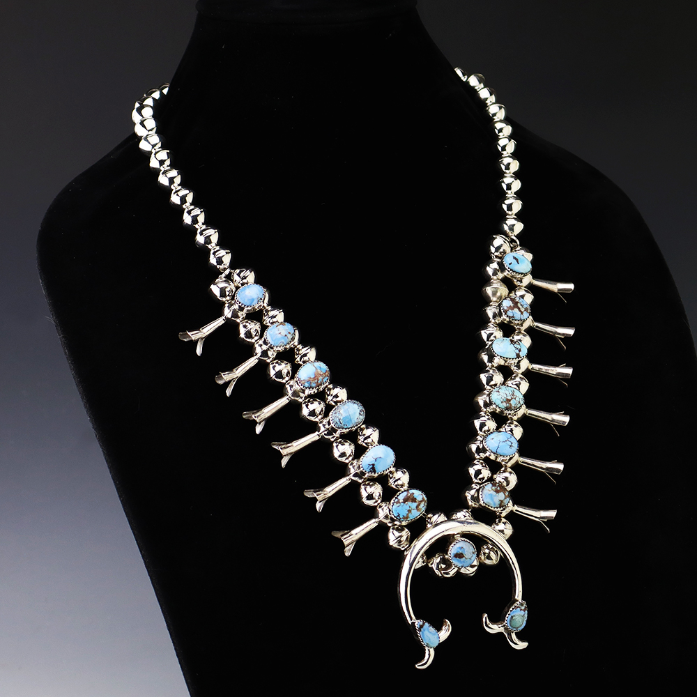 Gorgeous sterling silver squash blossom necklace. The squash blossoms and the naja are set with Golden Hills Turquoise stones. The necklace is strung with sterling silver 12 mm bench beads. The necklace is finished off with a sterling silver hook and eye. Comes with matching earrings. A timeless beauty that you will enjoy for years to come. The necklace weighs 136 grams and the earrings weigh 6 grams. Signed.