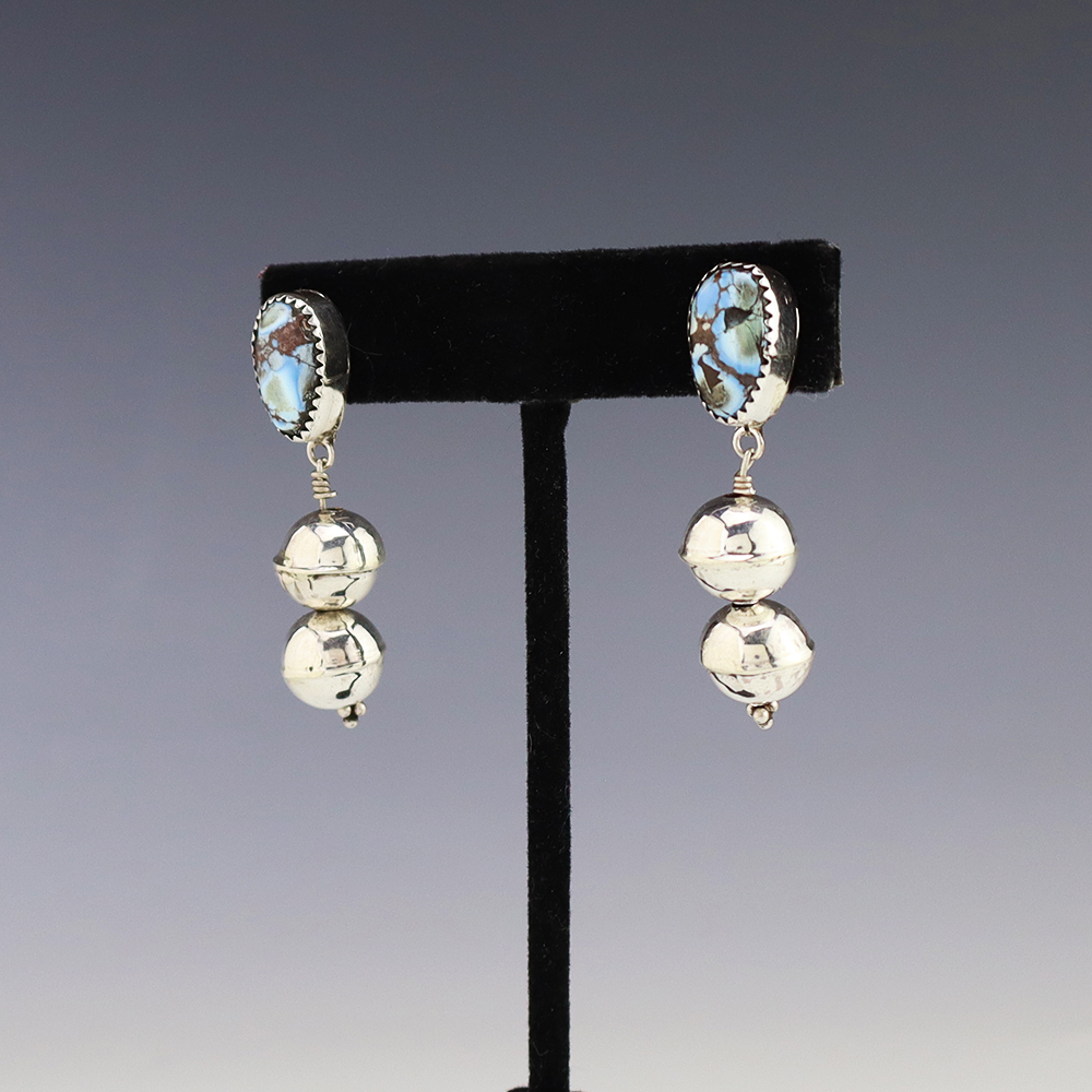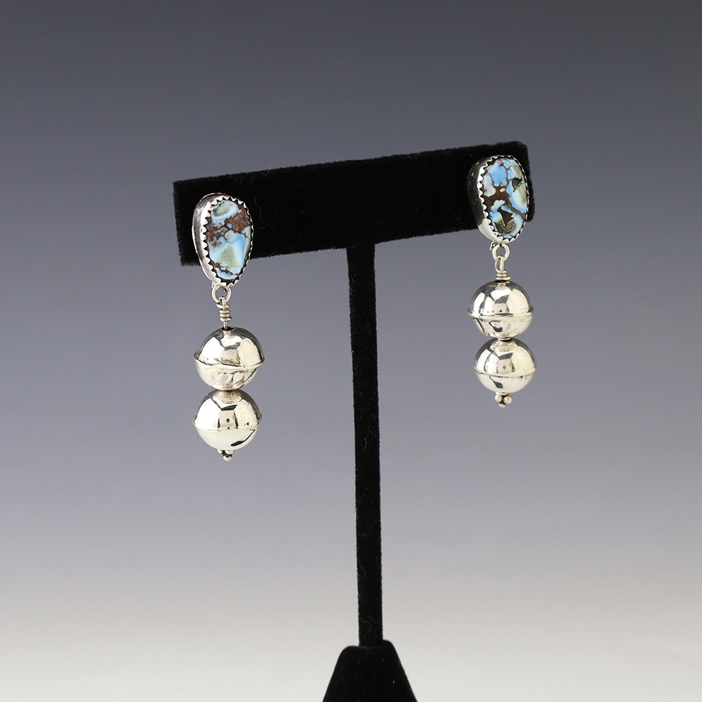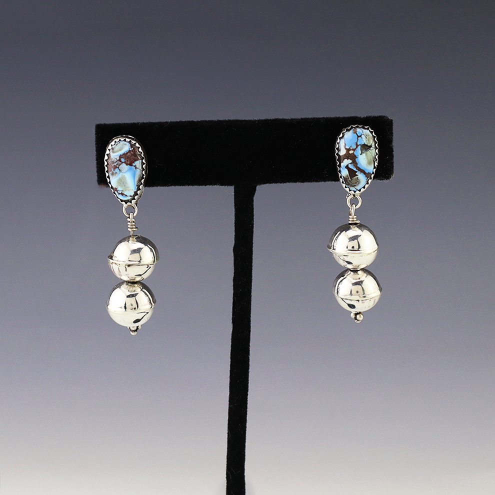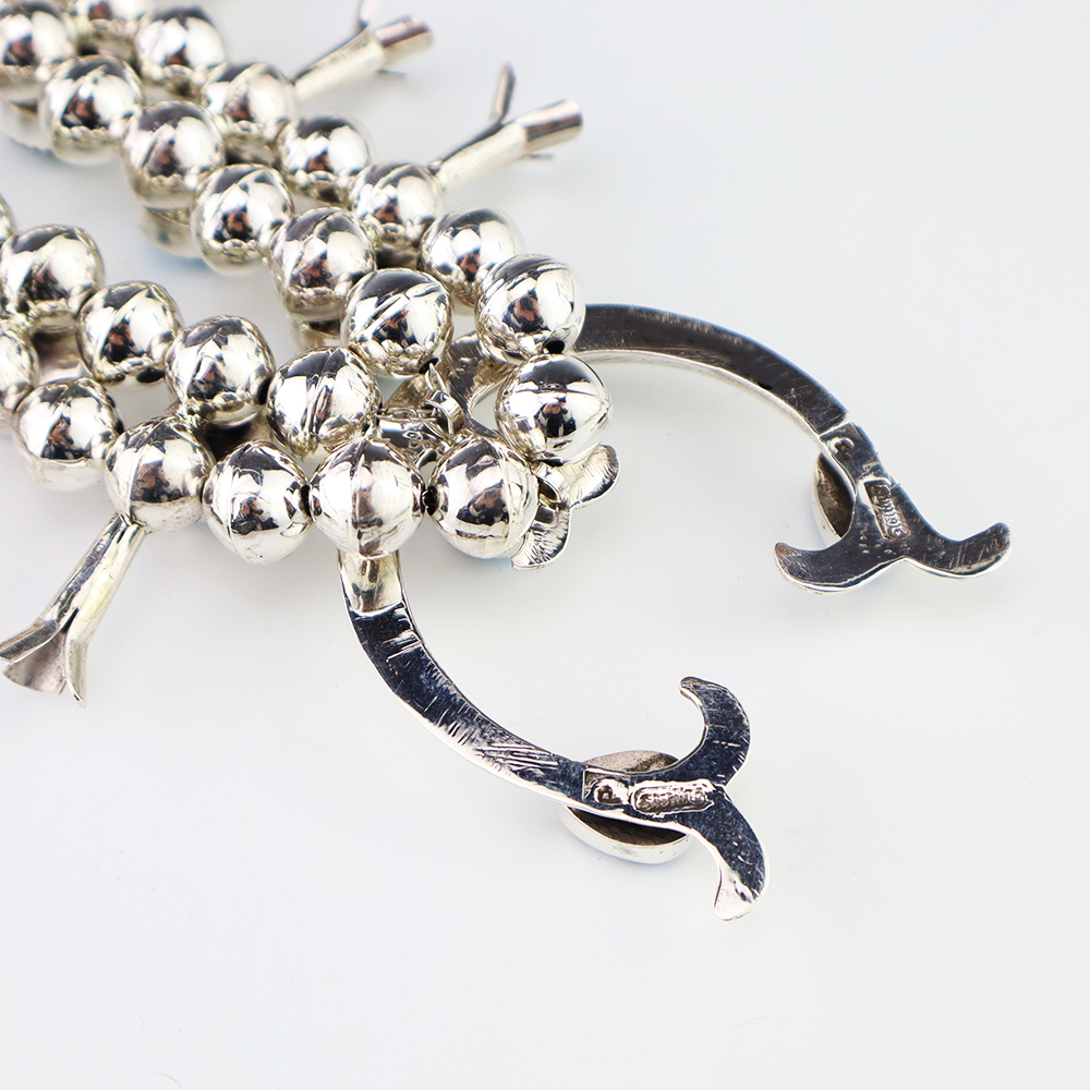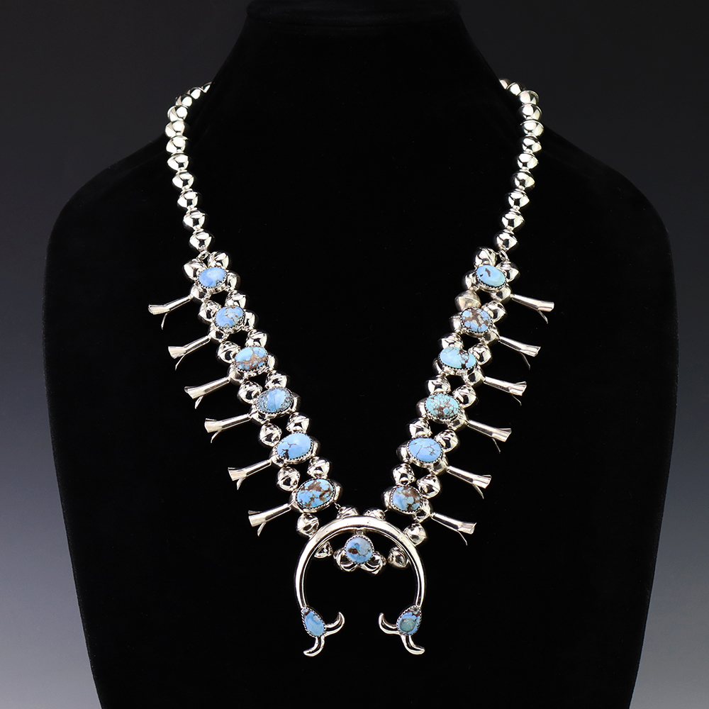 Gorgeous sterling silver squash blossom necklace. The squash blossoms and the naja are set with Golden Hills Turquoise stones. The necklace is strung with sterling silver 12 mm bench beads. The necklace is finished off with a sterling silver hook and eye. Comes with matching earrings. A timeless beauty that you will enjoy for years to come. The necklace weighs 136 grams and the earrings weigh 6 grams. Signed.