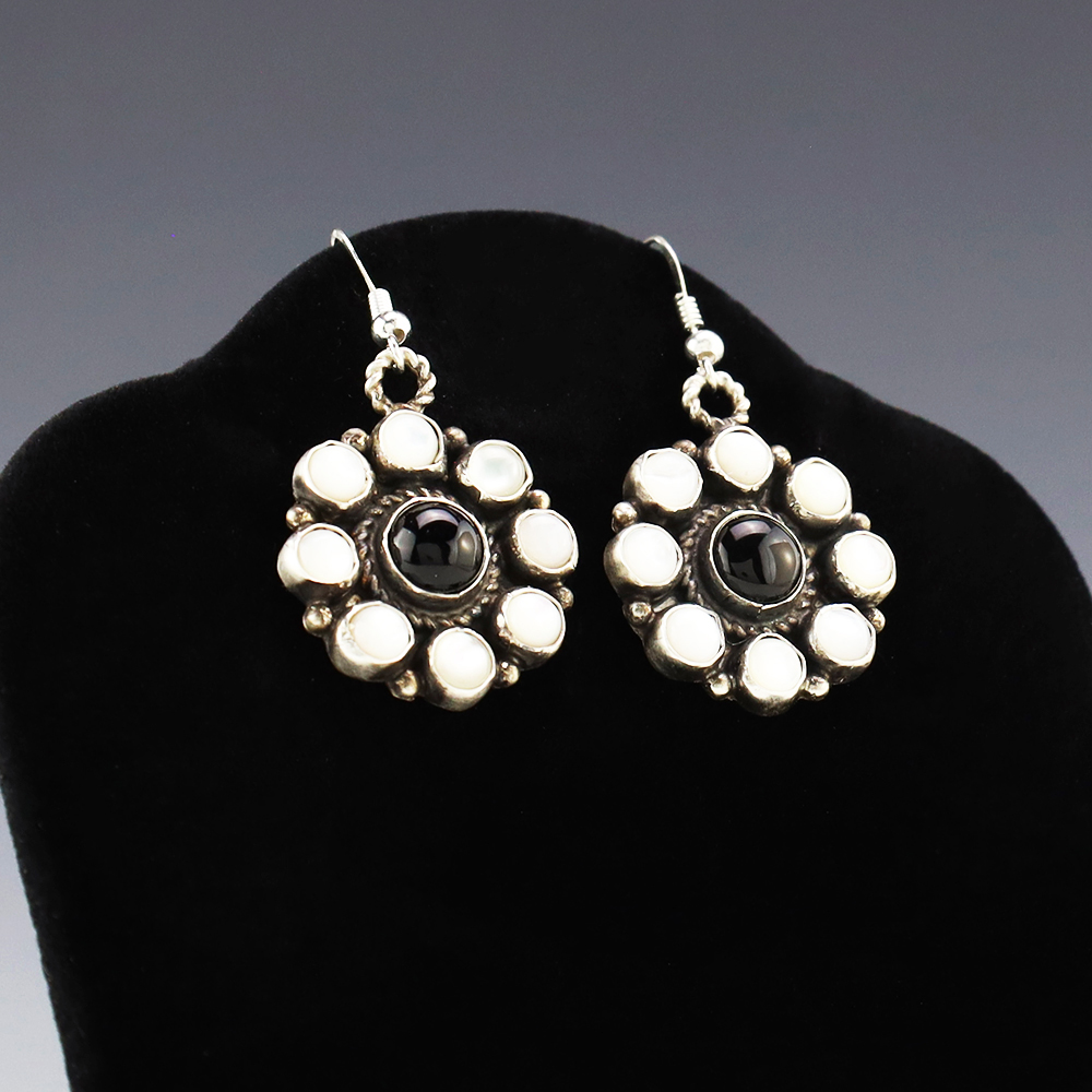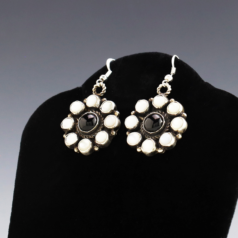 Beautiful earrings hand made out of sterling silver, Mother of Pearl Shell, and Onyx by Navajo artist Devin Brown. These wonderful earrings will become a versatile accessory in your jewelry collection. Weighs 10 grams. Signed