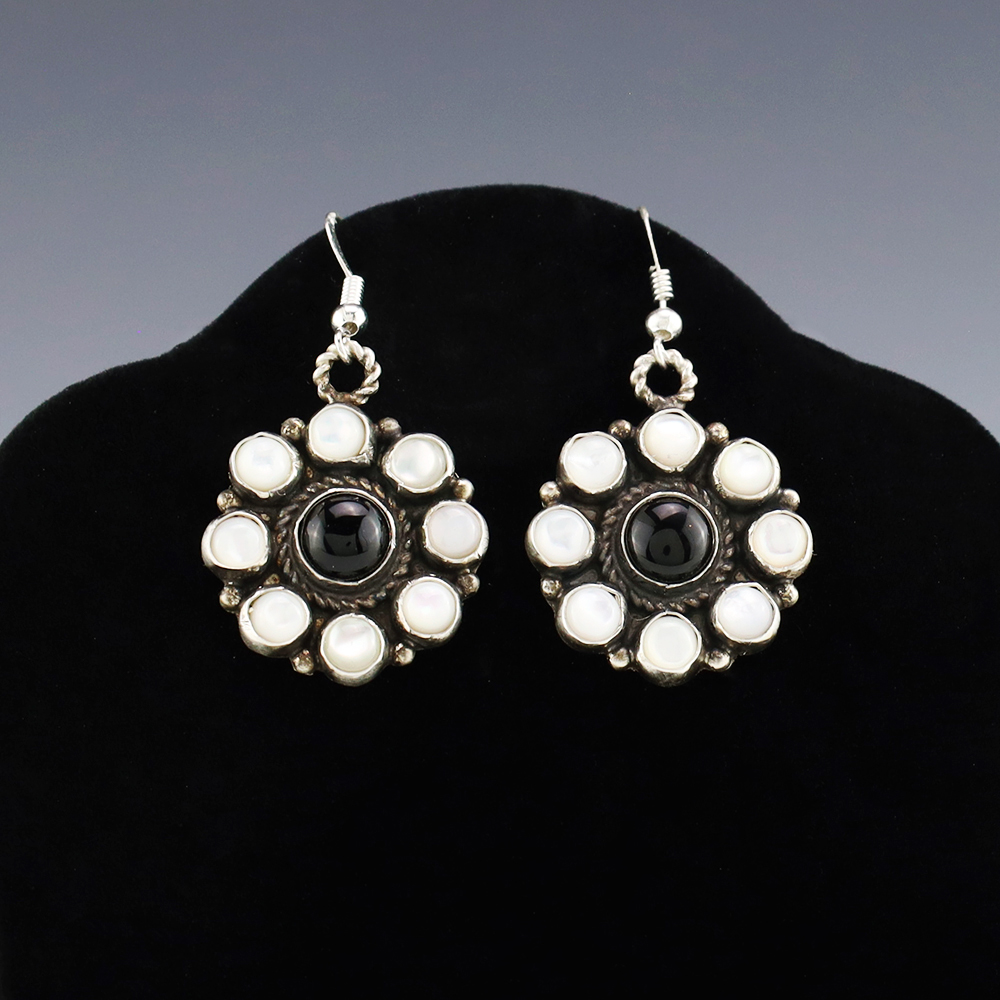 Beautiful earrings hand made out of sterling silver, Mother of Pearl Shell, and Onyx by Navajo artist Devin Brown. These wonderful earrings will become a versatile accessory in your jewelry collection. Weighs 10 grams. Signed