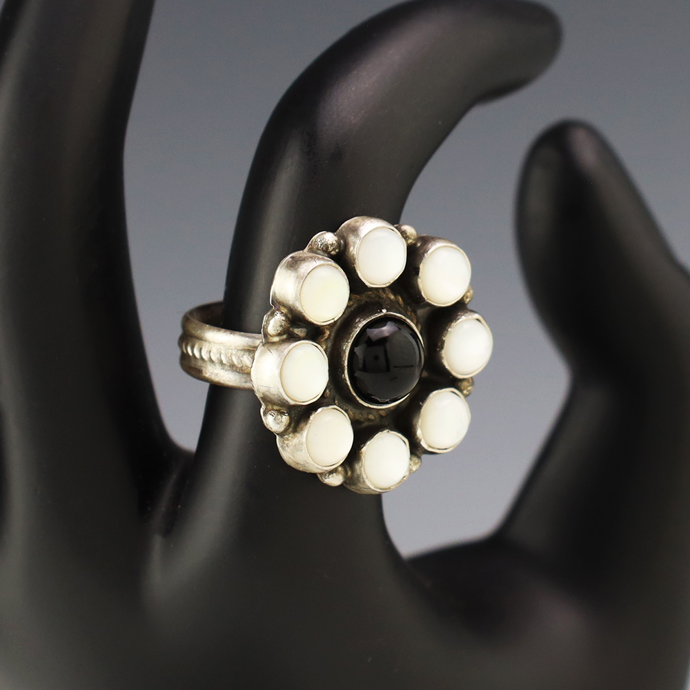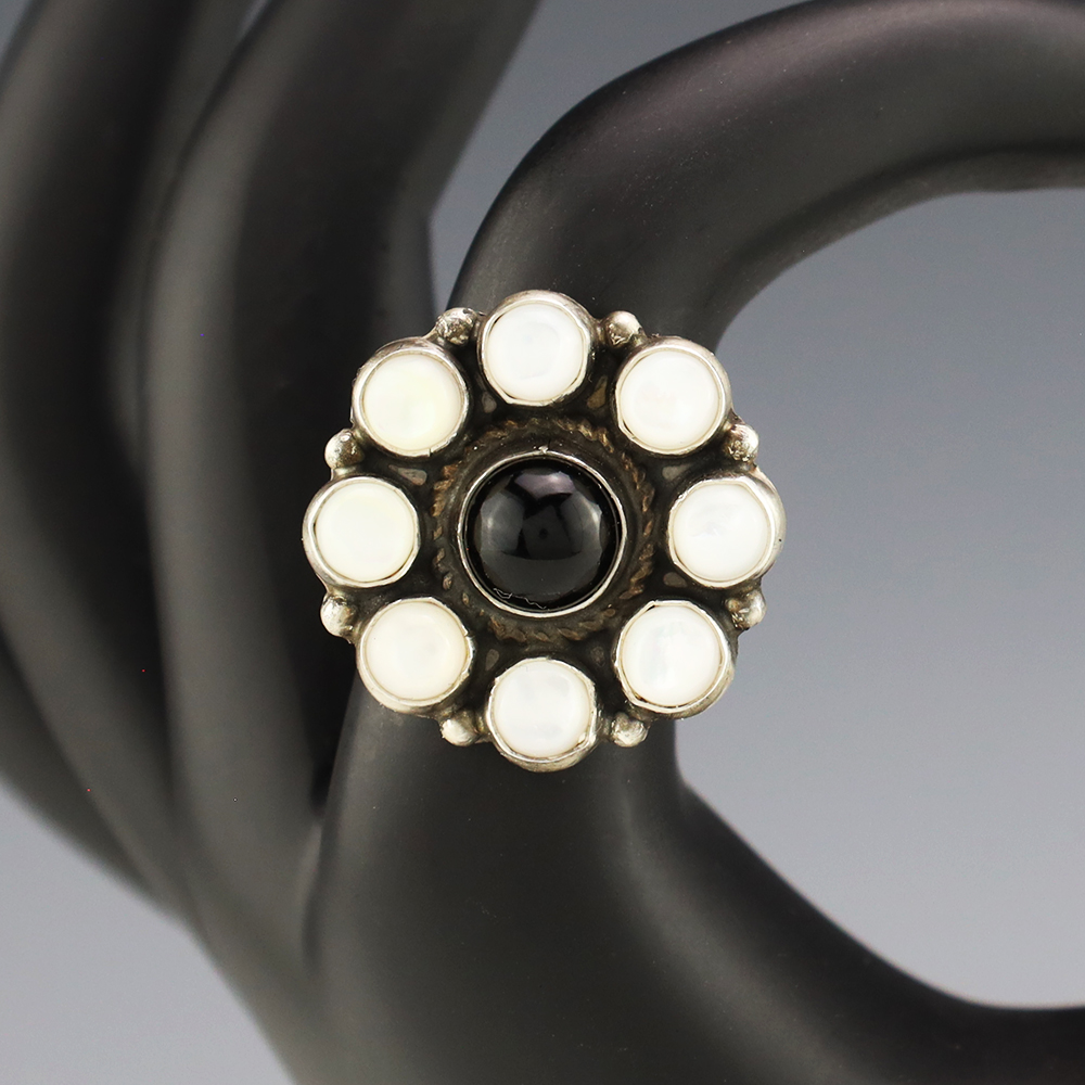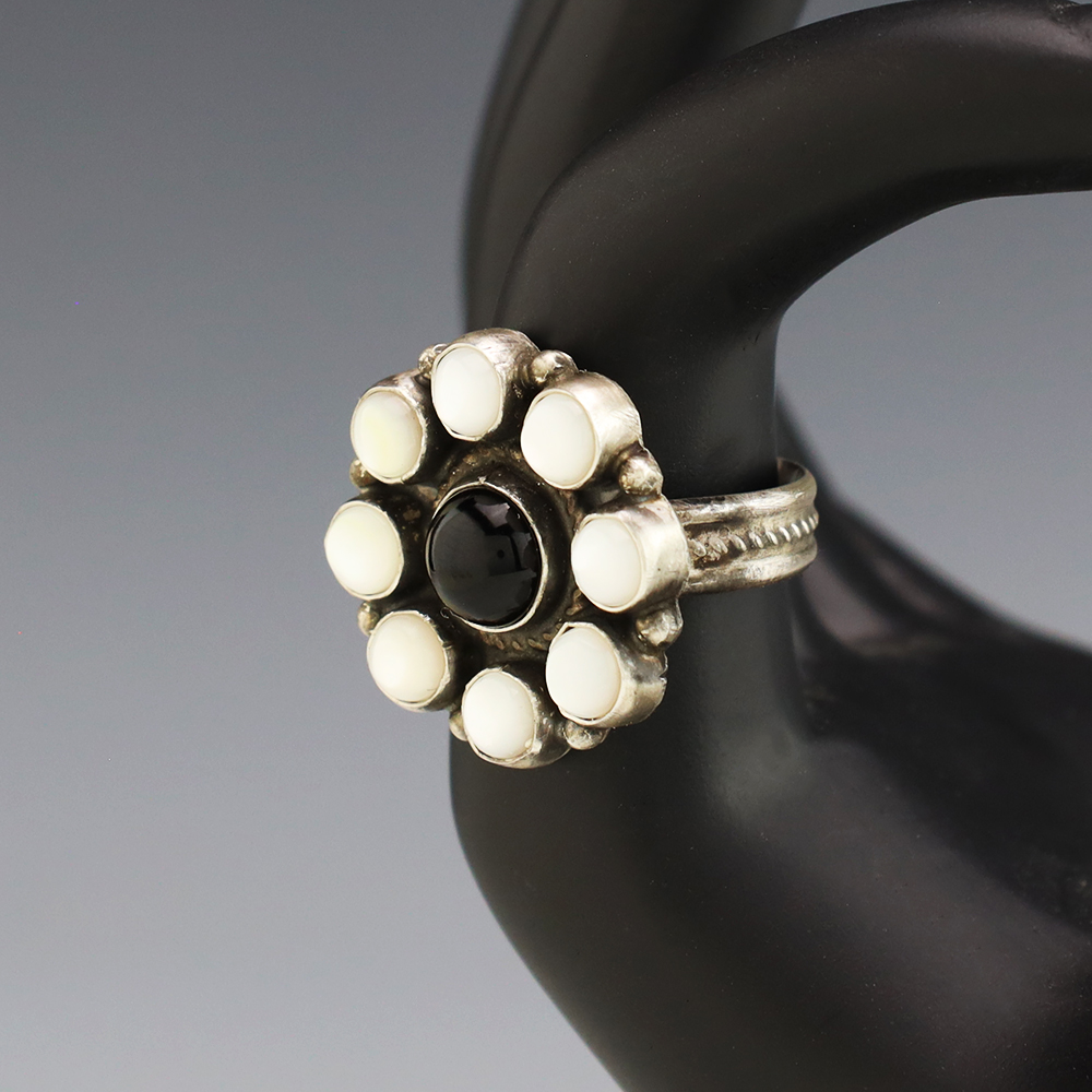 This ring is a great representation of hand made Navajo jewelry and will make a statement on your hand. Beautiful pieces of Mother of Pearl Shell and Onyx are set into a sterling silver setting. Hand made by Navajo artist Devin Brown. Weighs 8 grams. Size 7 1/2 and slightly adjustable. Signed
