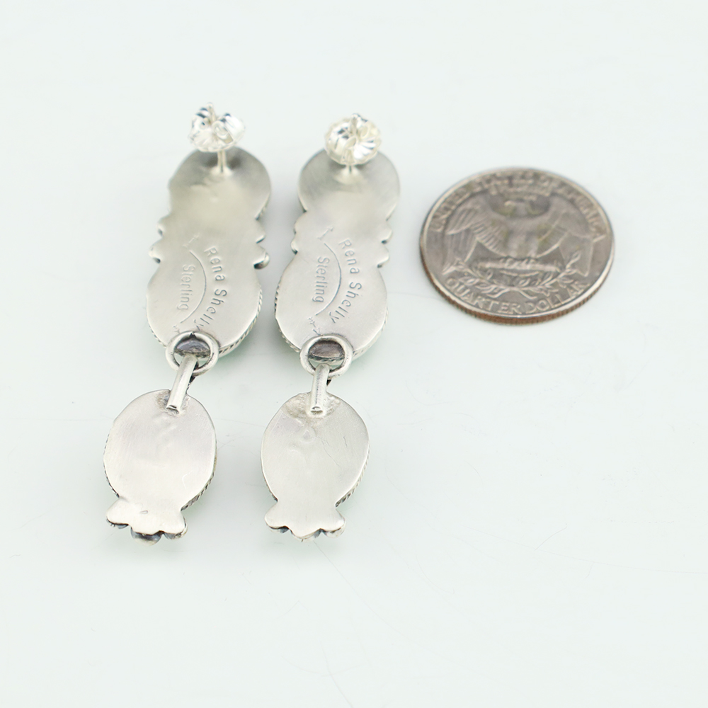 Lovely dangle earrings hand made by Navajo silversmith Rena Shelly. The earrings are sterling silver and set with Sonoran Turquoise stones. These fabulous earrings will become a versatile accessory in your jewelry collection. Weighs 14 grams. Signed.