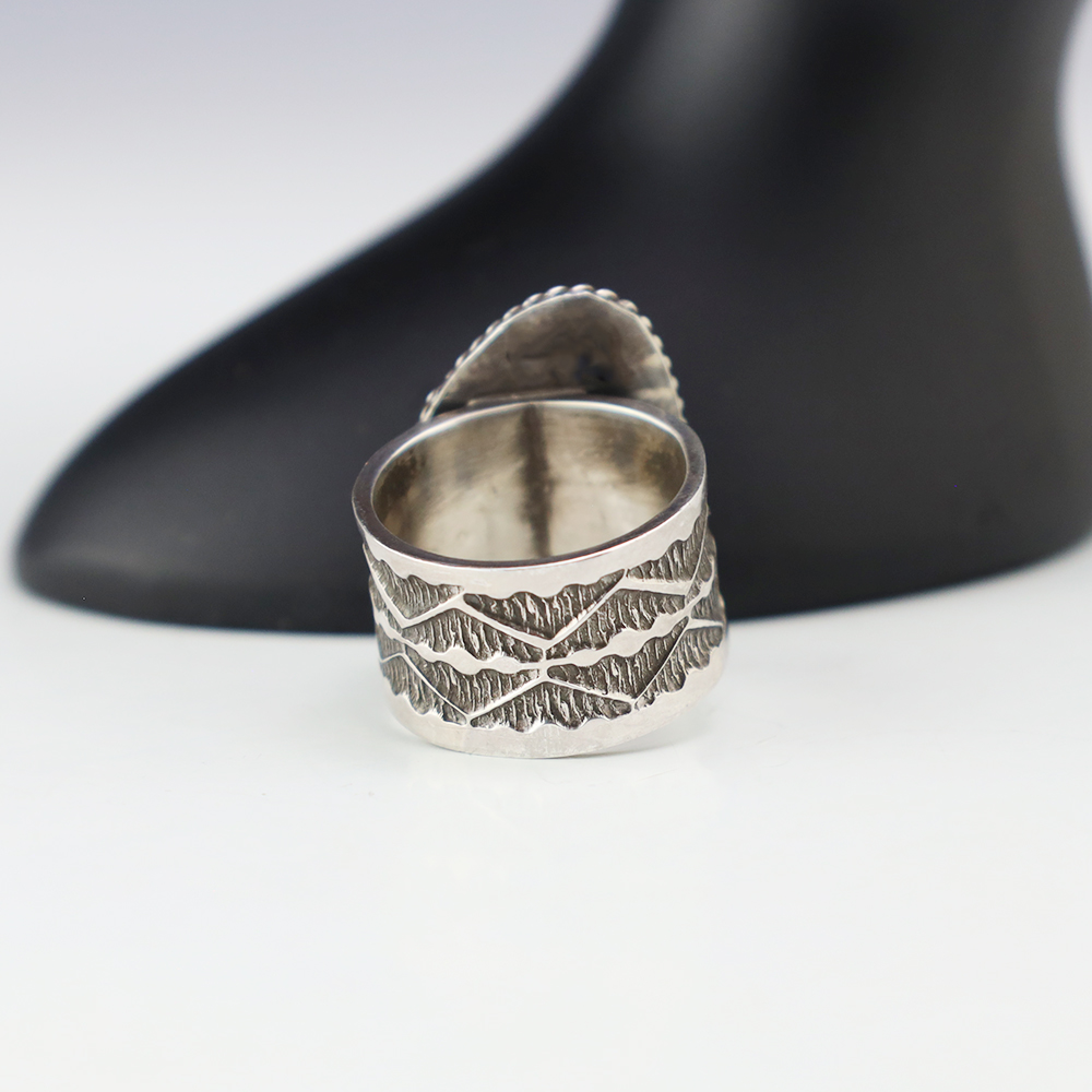 Navajo artist Sunshine Reeves hand crafted this exquisite ring out of sterling silver. Great design. Weighs 14 grams. Signed. Size 7 3/4. note-ring measures at size 7 3/4, but fits about 7 1/4 because of the width of the band.