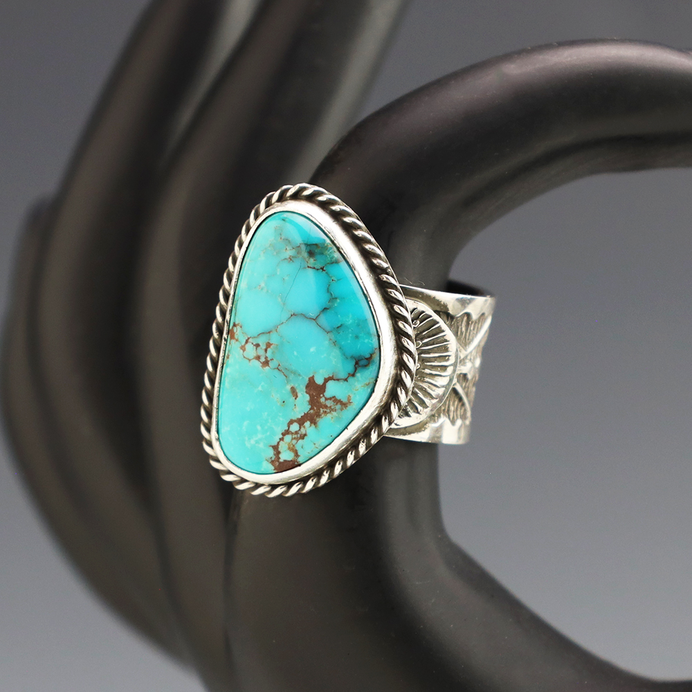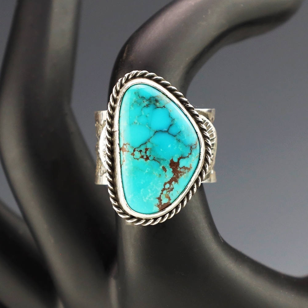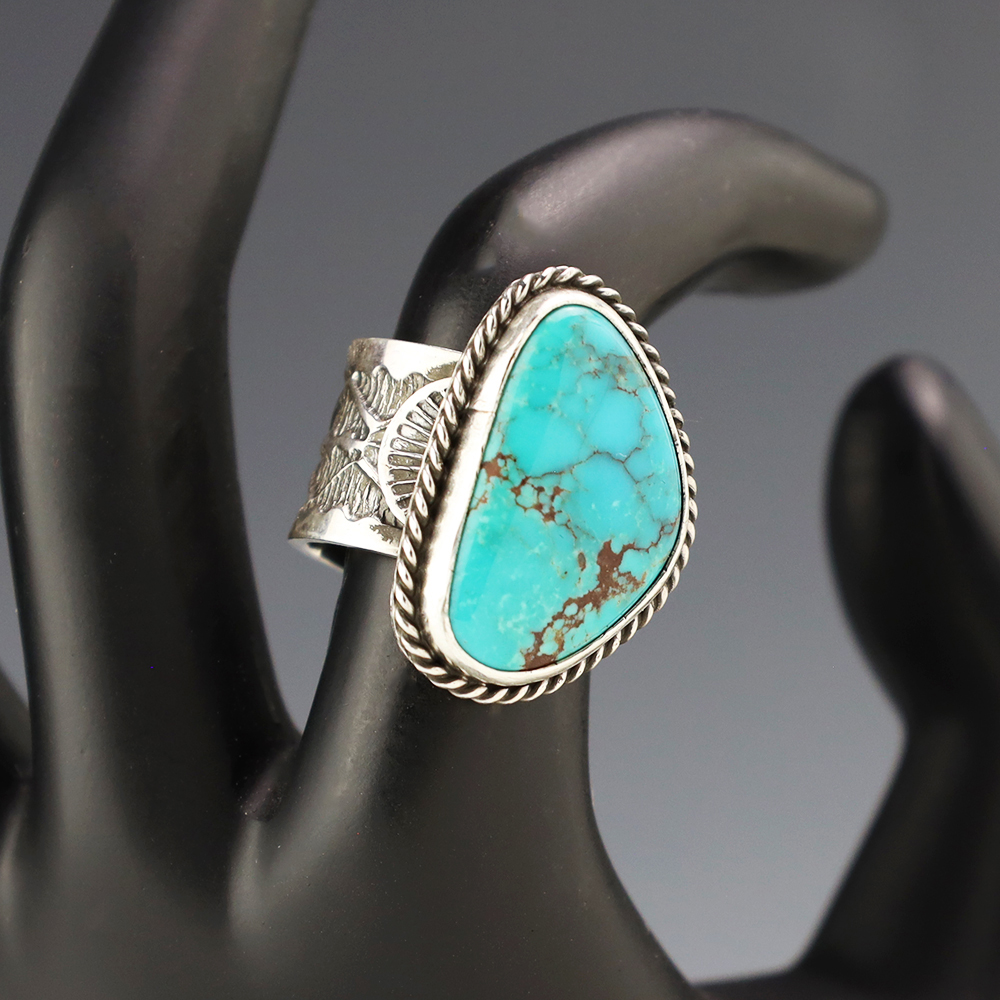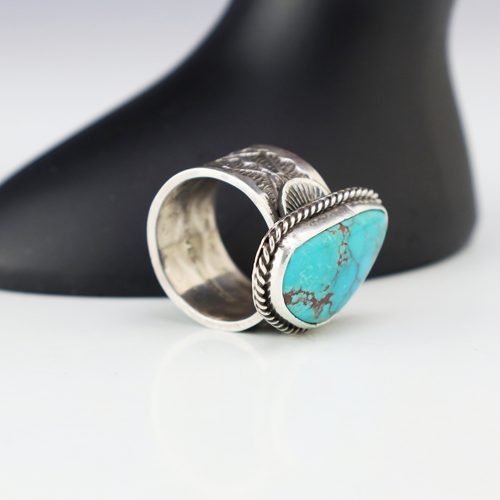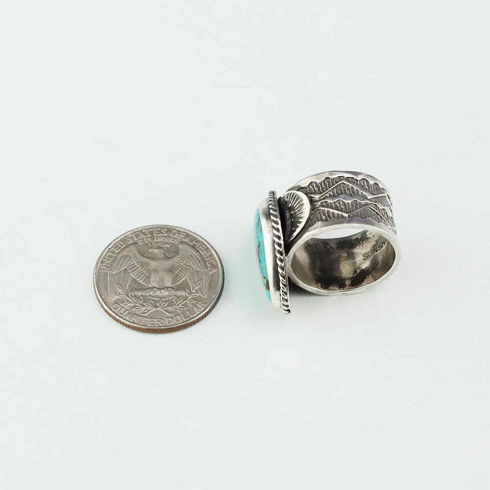 Amazing inlay work! Zuni jewelry makers, Nancy and Sheldon Westika created this magnificent ring. Made out of sterling silver and inlaid with Kingman Turquoise and Jet. Zuni artists are known for their lapidary work. The Westikas have been making jewelry since the 1970’s and they are known for their fine...