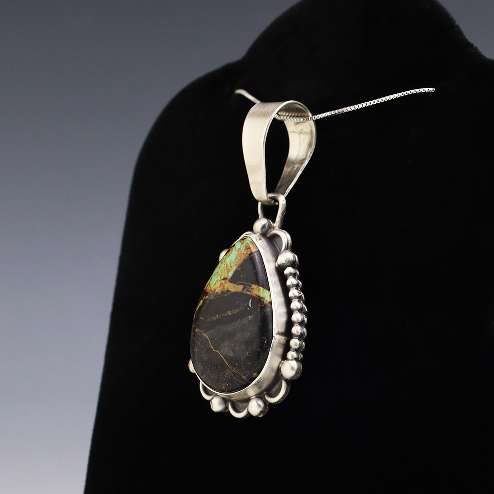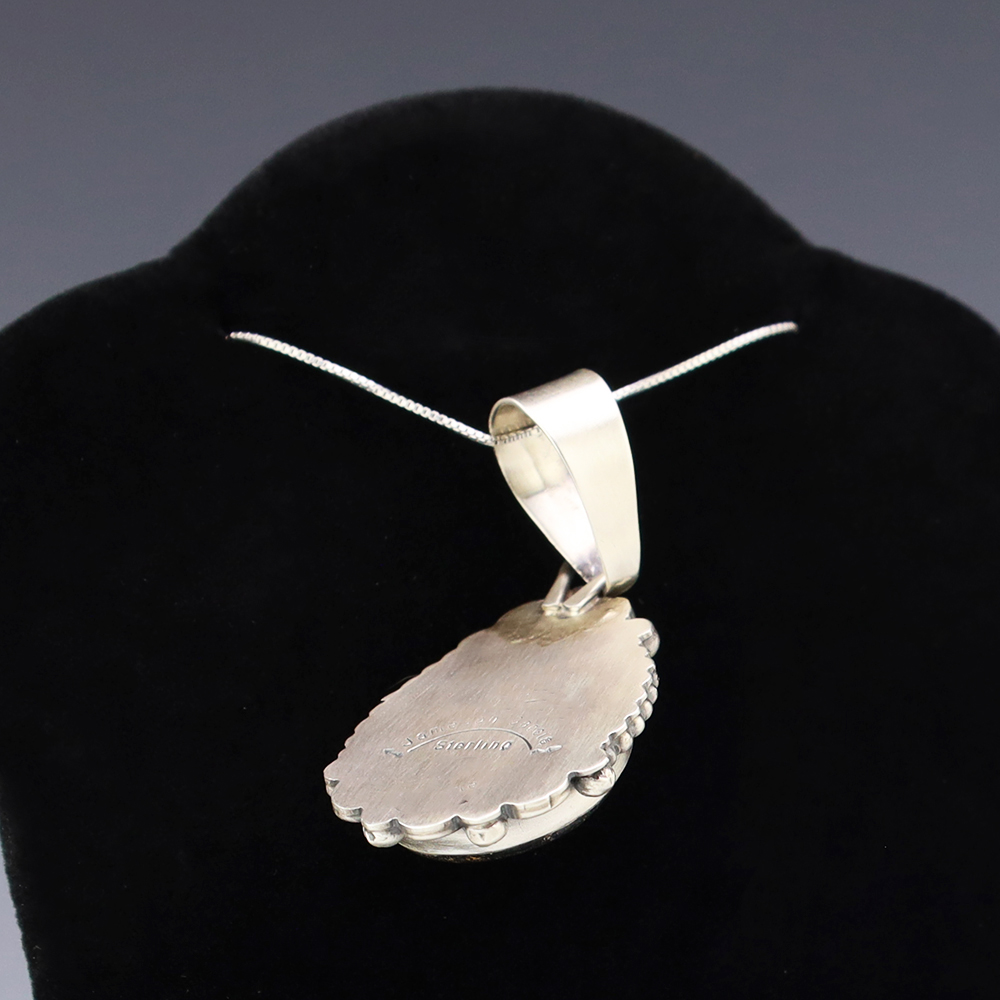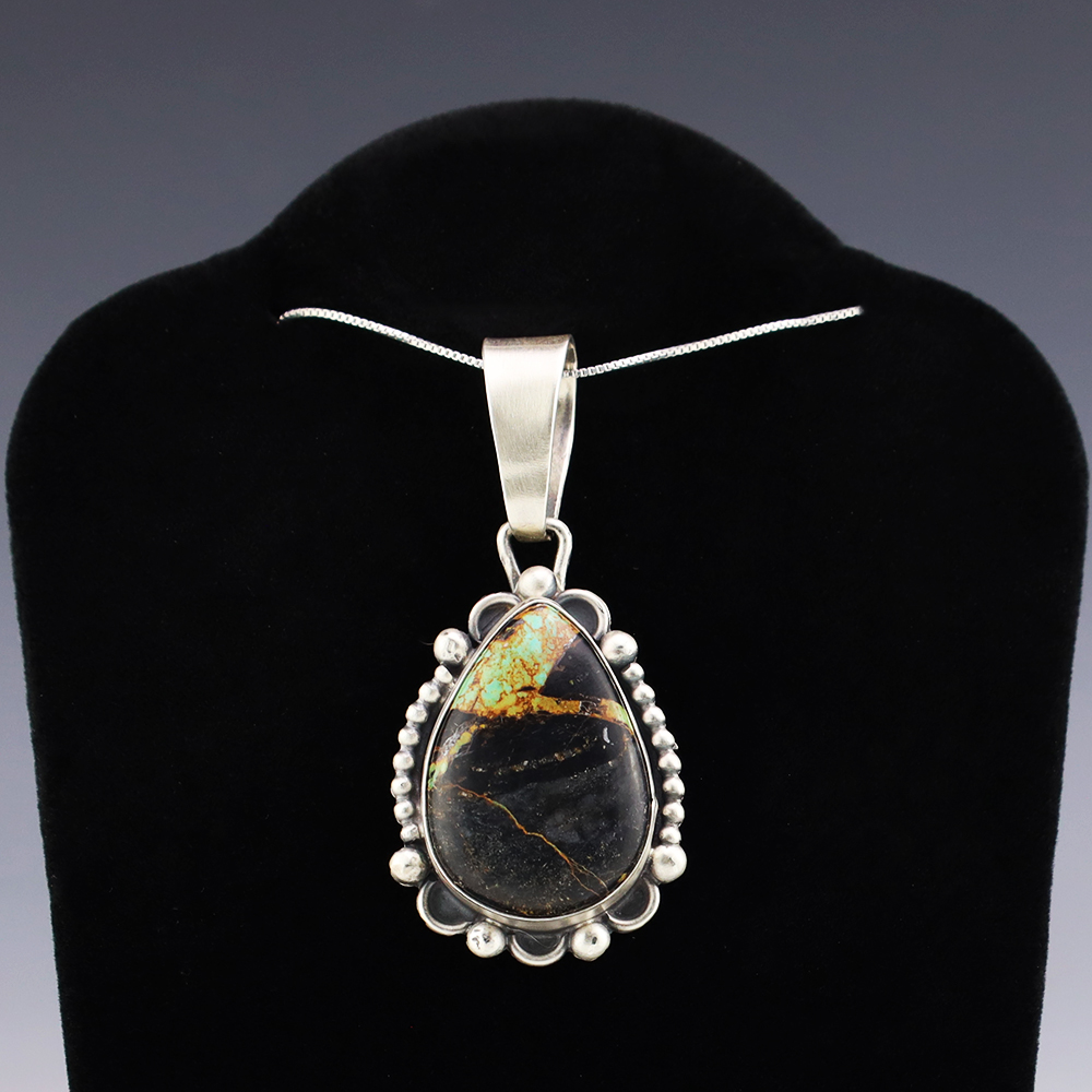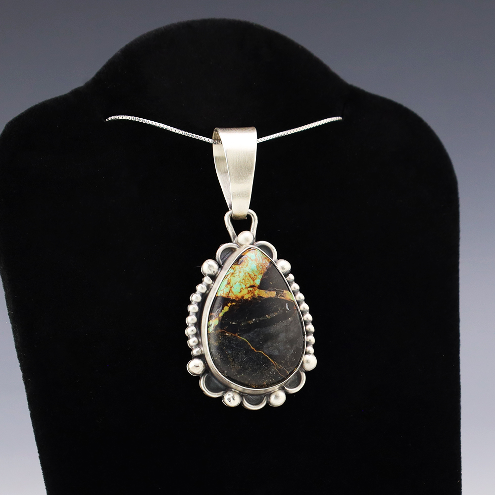 Gorgeous pendant hand made out of sterling silver and Black Jack Turquoise by Navajo artist Jameson Garcia. A timeless beauty that you will enjoy for years to come. Weighs 12 grams. Signed (Chain not included)
