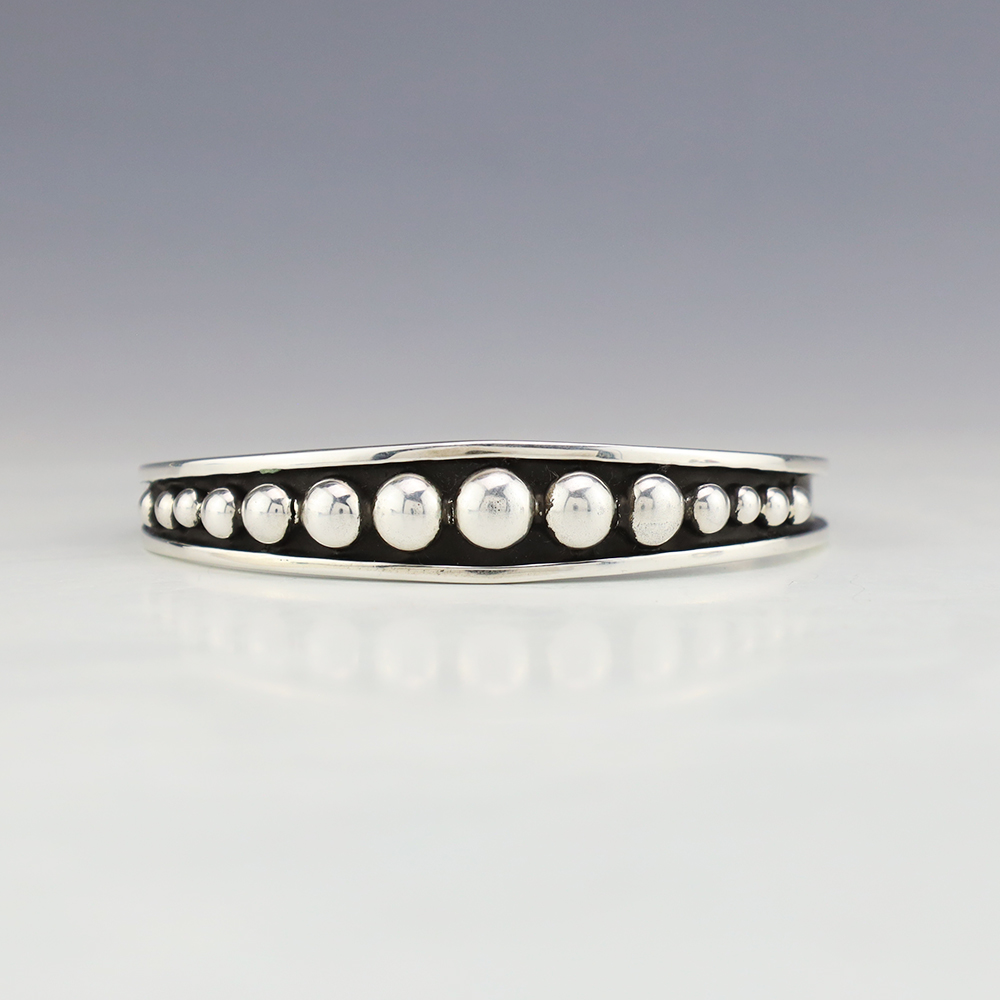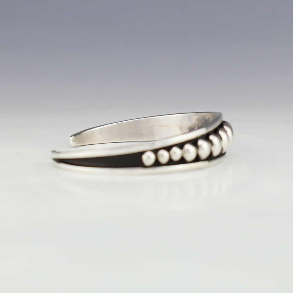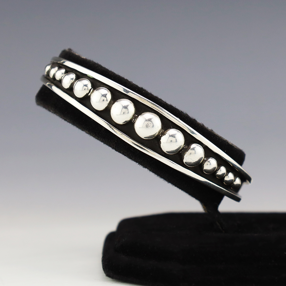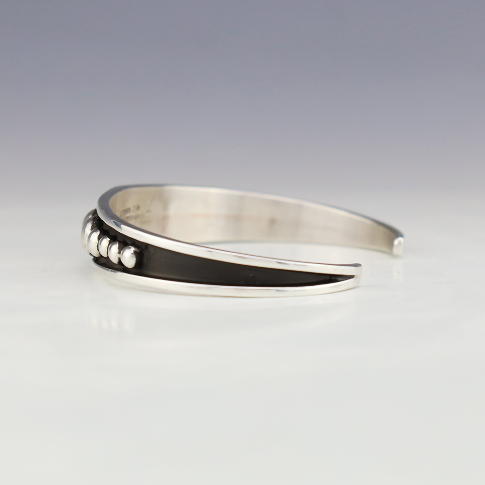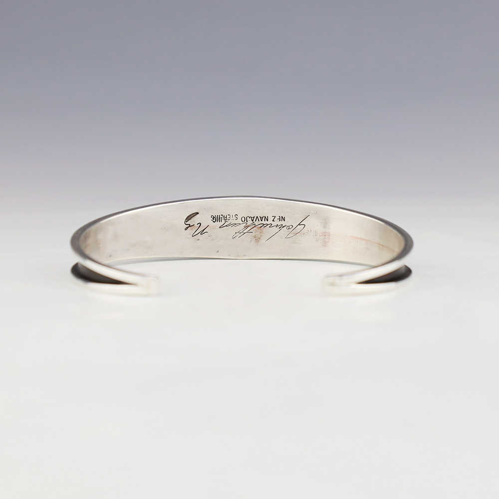Navajo artist Johnathan Nez hand crafted this magnificent bracelet out of sterling silver. Weighs 22 grams. The entire inner circumference is about 6 1/2”, including 1 1/16” opening. (Fits a 6 1/2″ wrist). Signed