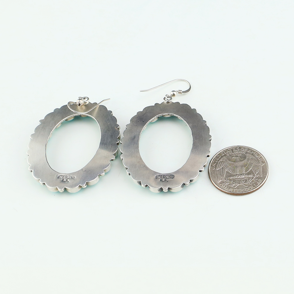 Gorgeous dangle earrings made out of sterling silver and set with Campitos Turquoise stones. Hand made by Navajo artist Renell Perry. These fabulous earrings will become a versatile accessory in your jewelry collection. Weighs 18 grams. Signed.