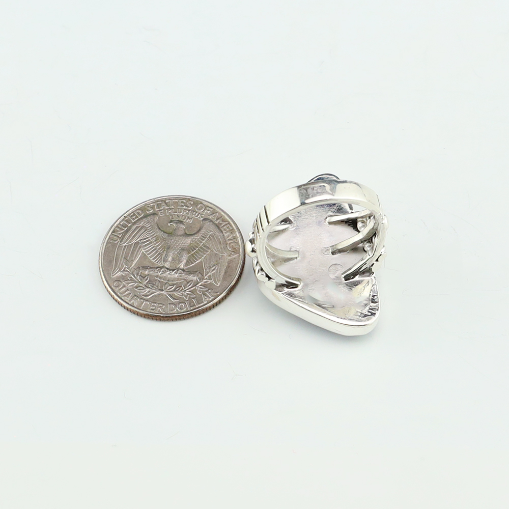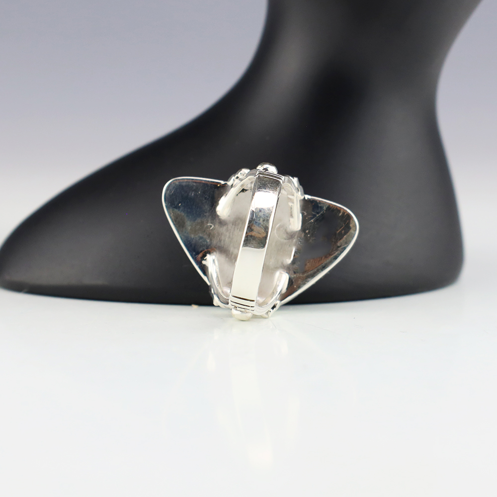 Zuni jewelry makers, Nancy and Sheldon Westika hand crafted this magnificent ring. Made out of sterling silver and inlaid with Kingman Turquoise and Jet. Zuni artists are known for their lapidary work. The Westikas have been making jewelry since the 1970’s and they are known for their fine inlay work. ...