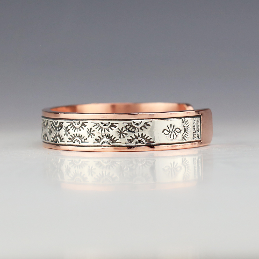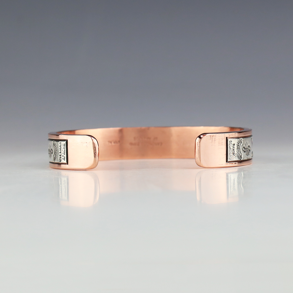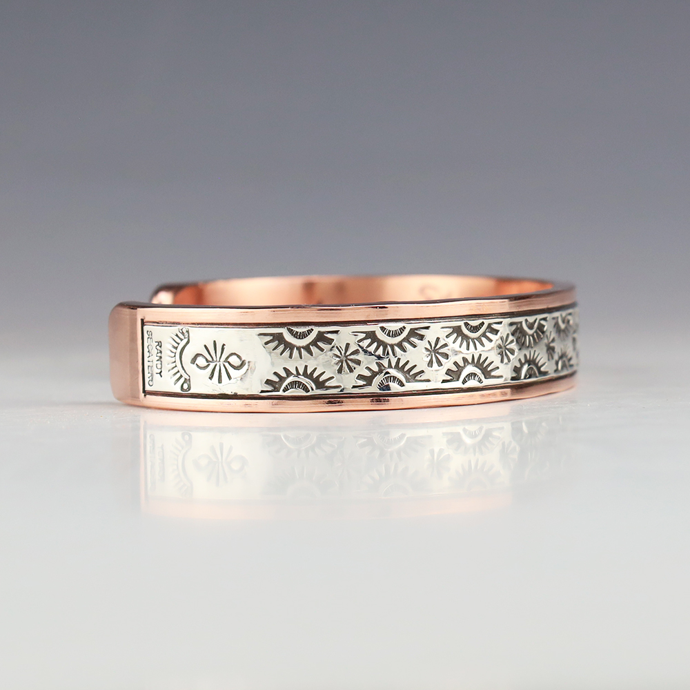 Navajo jewelers Randy Secatero and Sylvana Apache hand crafted this stellar bracelet. Sterling silver and Copper with a traditional hand stamped design. Weighs 66 grams. The entire inner circumference is about 8”, including 1 3/8” opening. (Fits a 8″ wrist) Signed