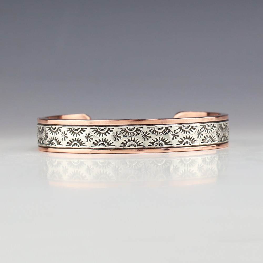 Navajo jewelers Randy Secatero and Sylvana Apache hand crafted this stellar bracelet. Sterling silver and Copper with a traditional hand stamped design. Weighs 66 grams. The entire inner circumference is about 8”, including 1 3/8” opening. (Fits a 8″ wrist) Signed