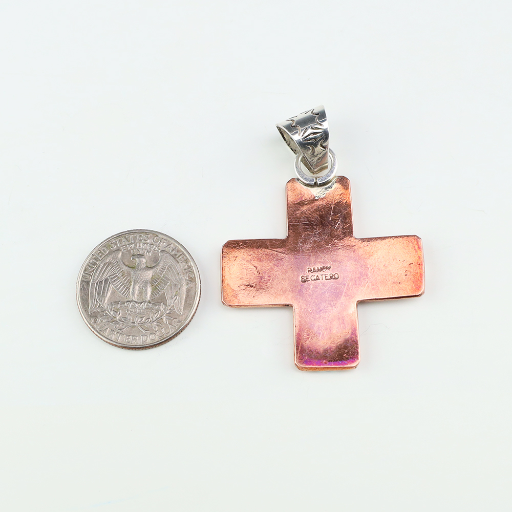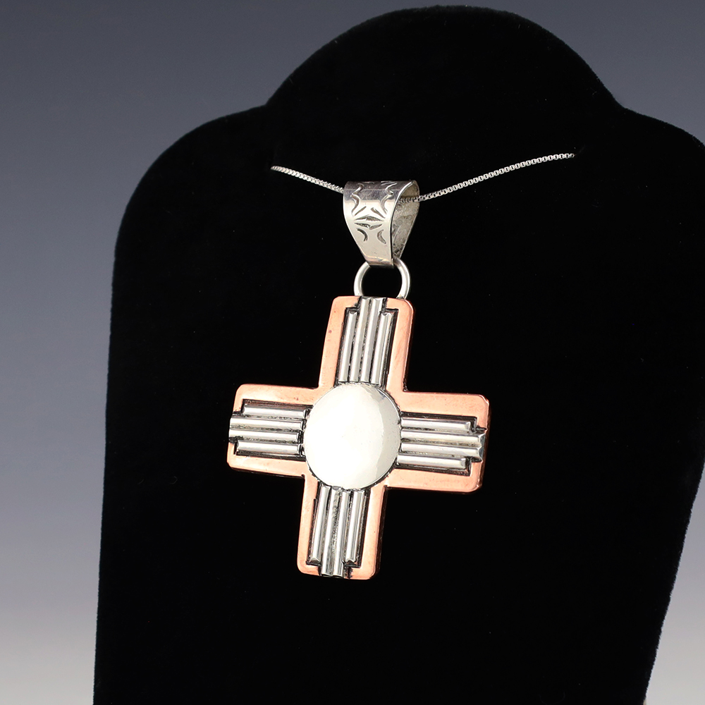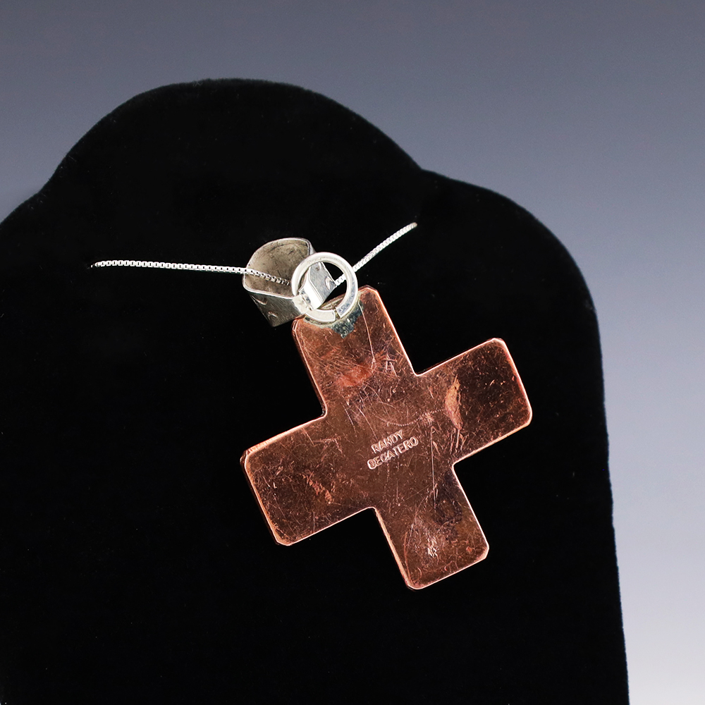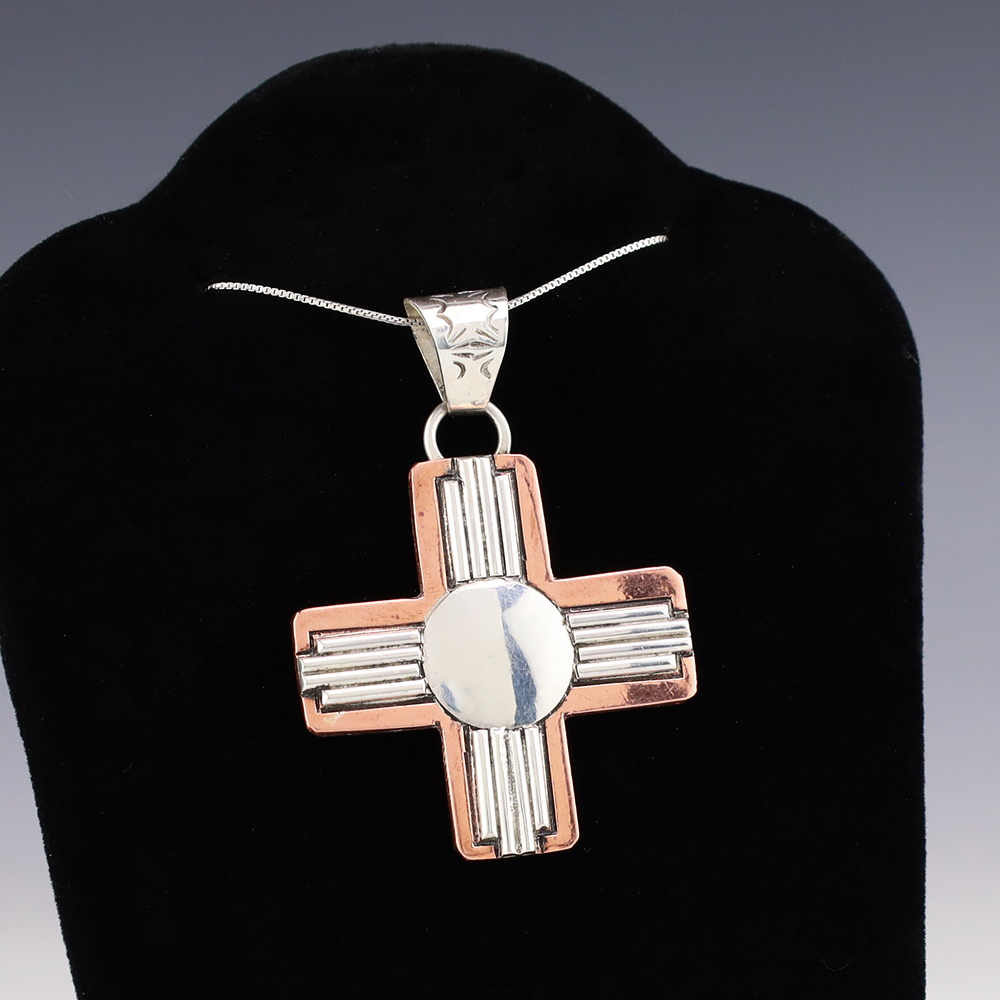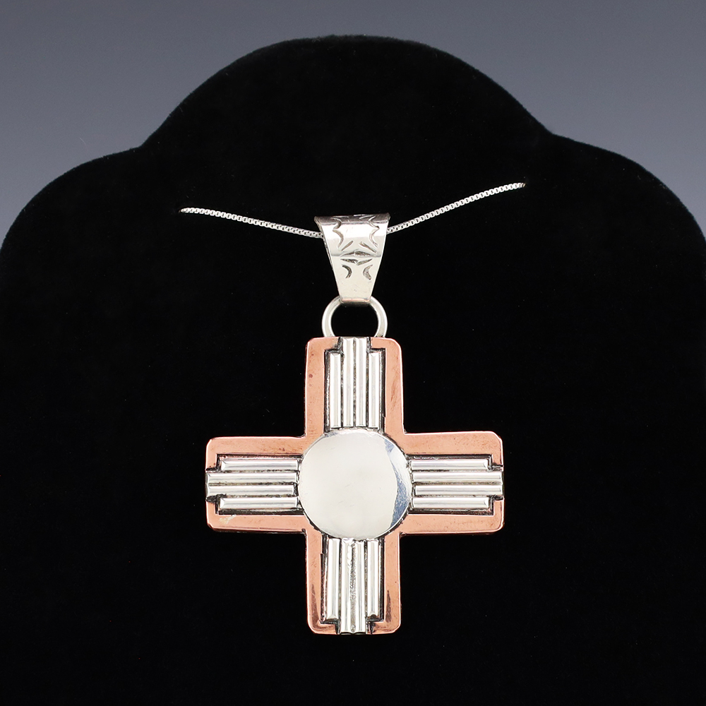 Navajo silversmith Randy Secatero made this beautiful Zia symbol pendant out of sterling silver and copper. A timeless beauty that you will enjoy for years to come. Weighs 14 grams. Signed. (Chain not included)