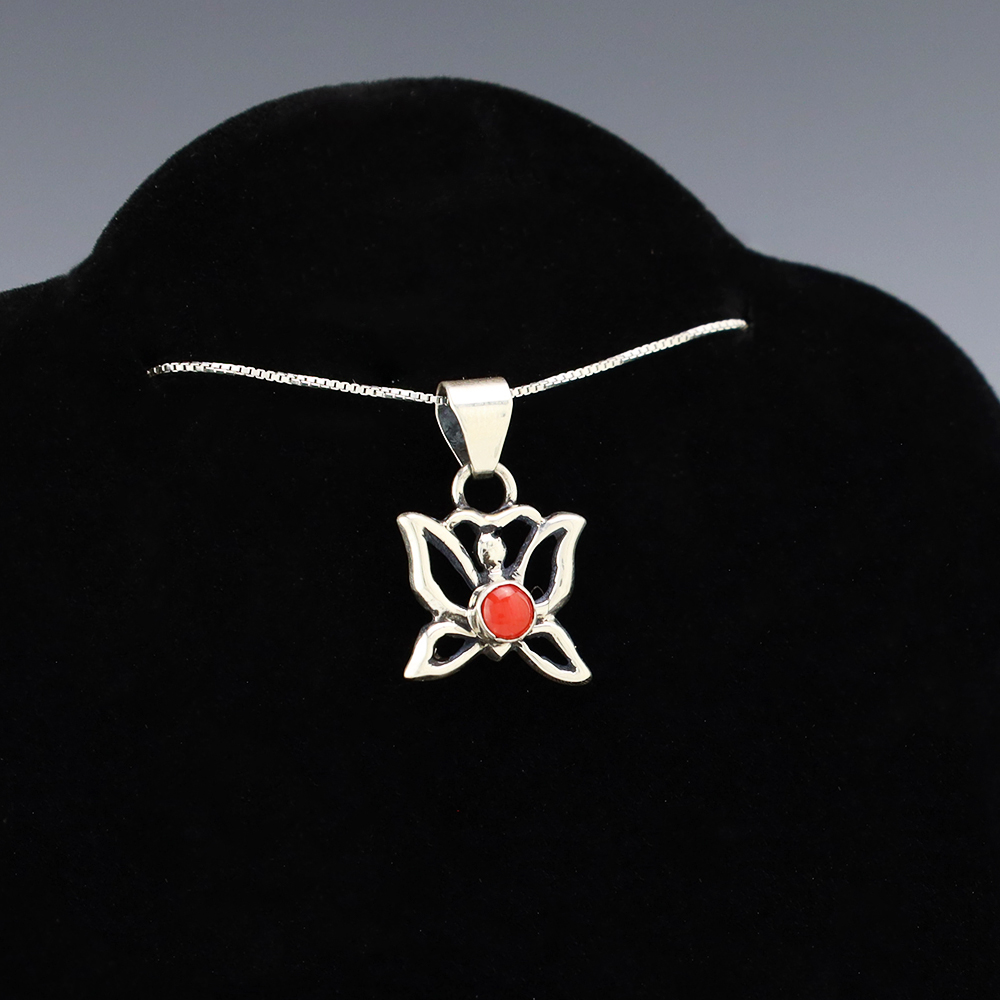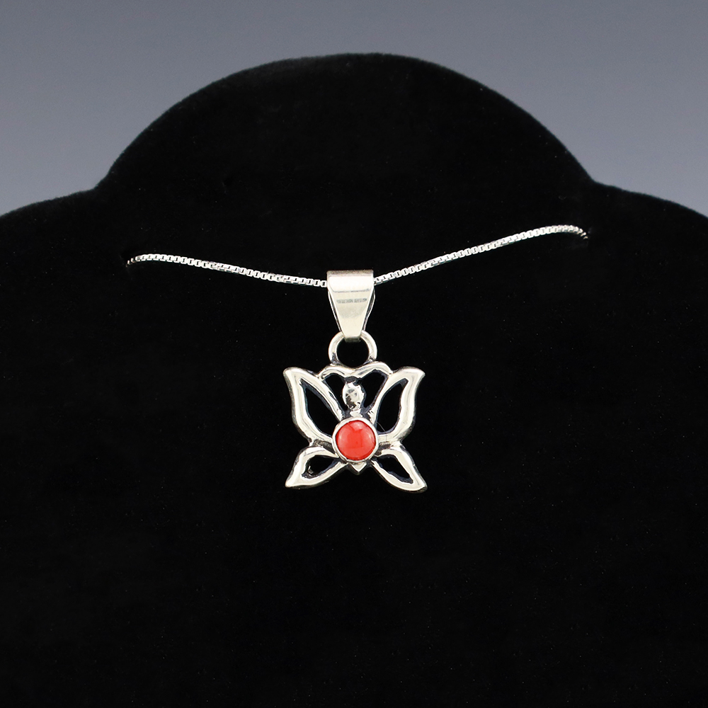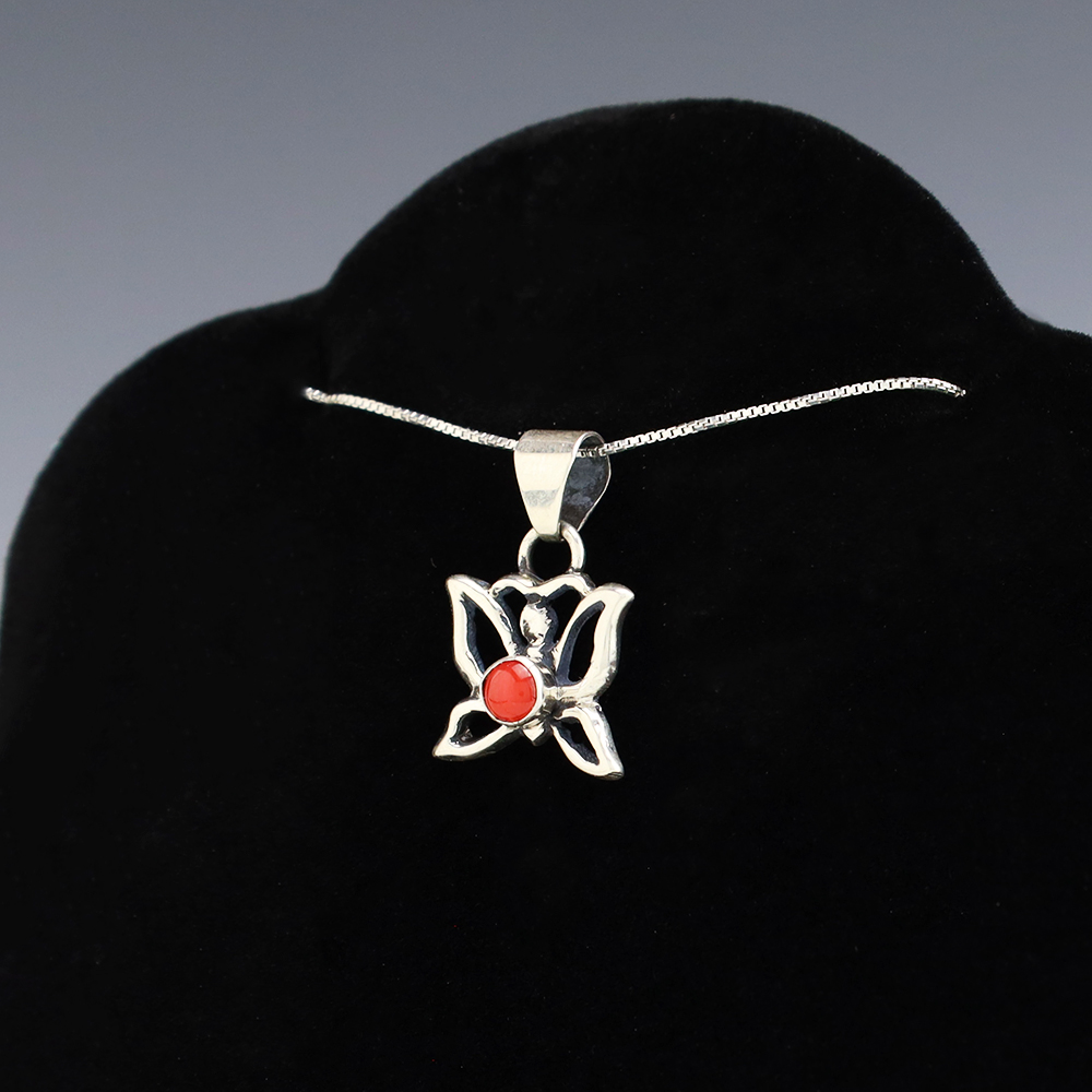 Navajo silversmith Isabelle Kee made this lovely pendant out of sterling silver and Coral. A timeless beauty that you will enjoy for years to come. Weighs 2 grams. Signed. (Chain not included)