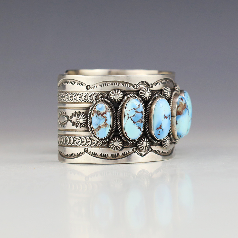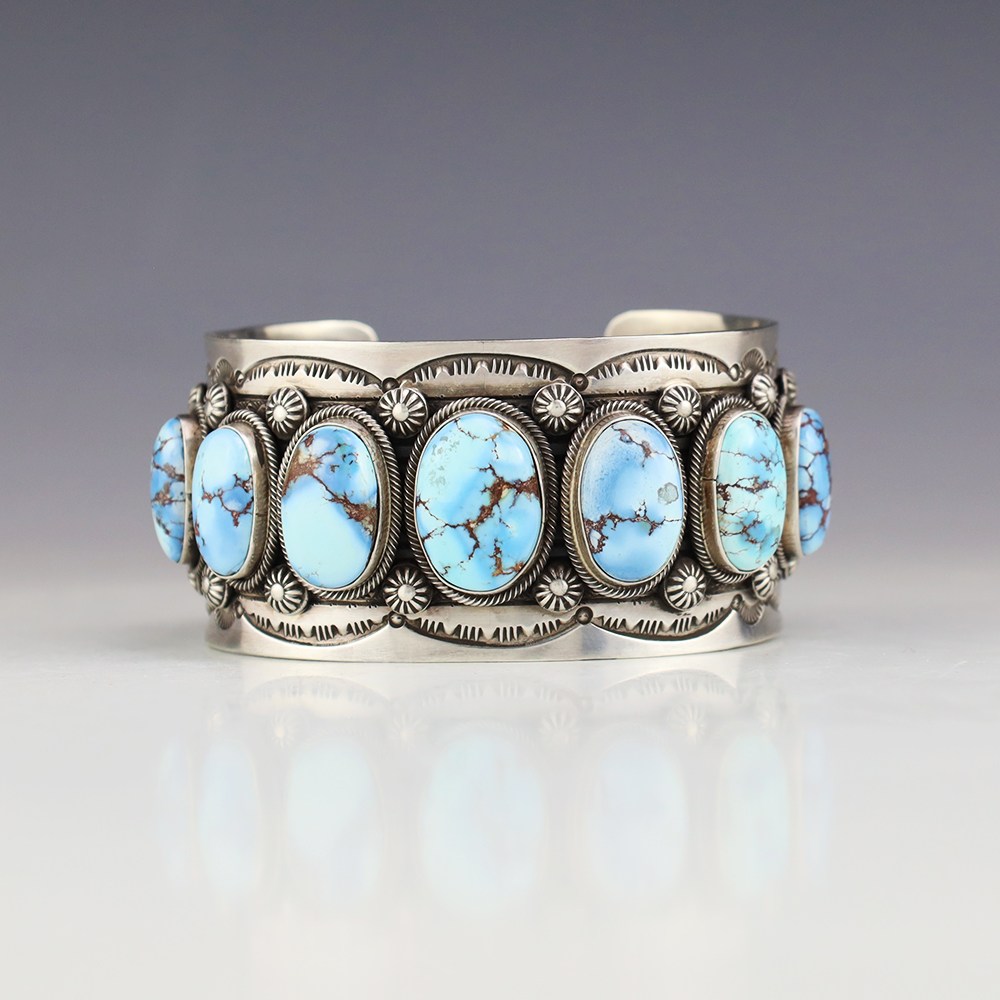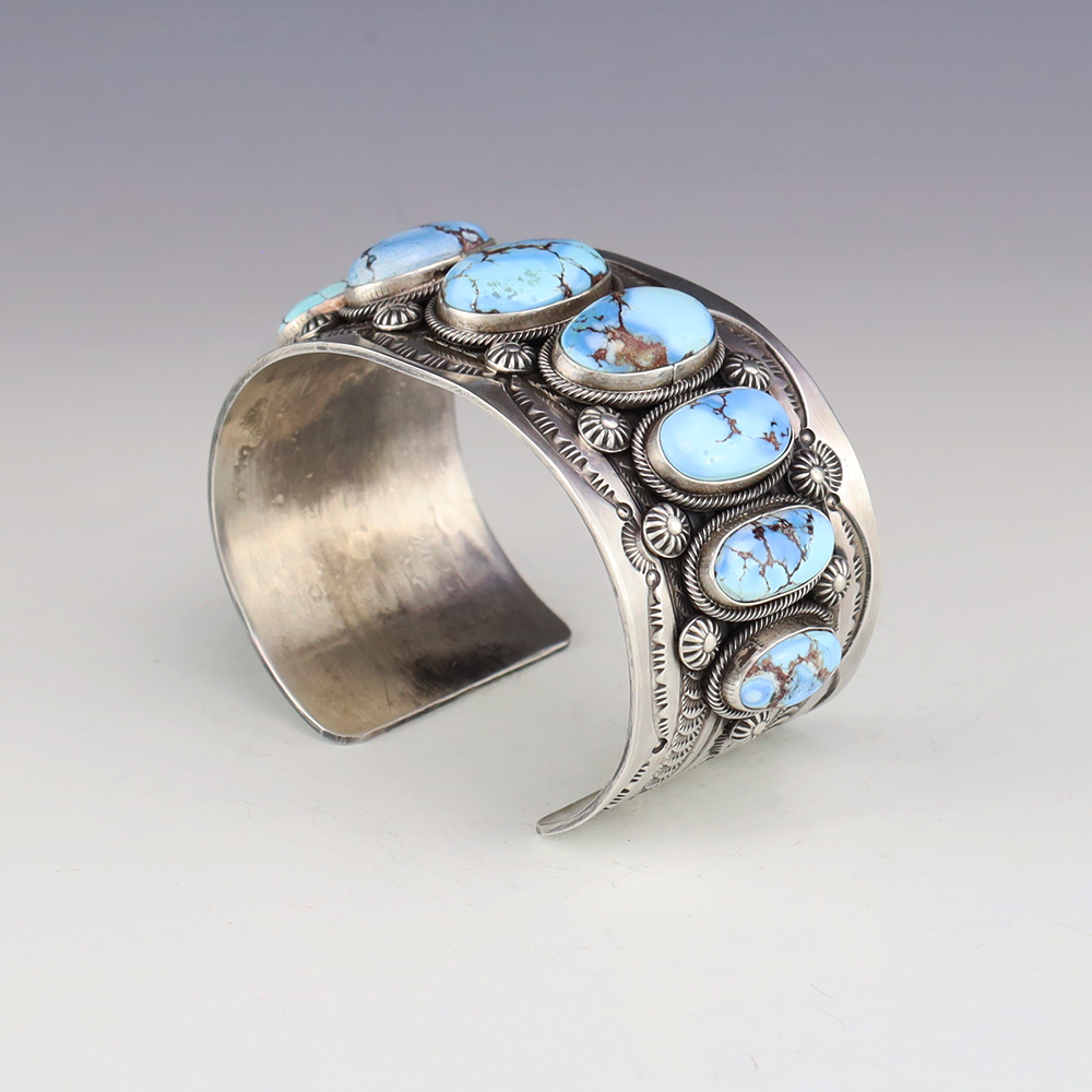 This timeless piece would be a great addition to your jewelry collection. Gorgeous bracelet made out of sterling silver and Golden Hills Turquoise by Navajo artist Freddie Maloney. The entire inner circumference is about 7”, including 1 1/16” opening (Fits a 7″ wrist). Weighs 96 grams. Signed.